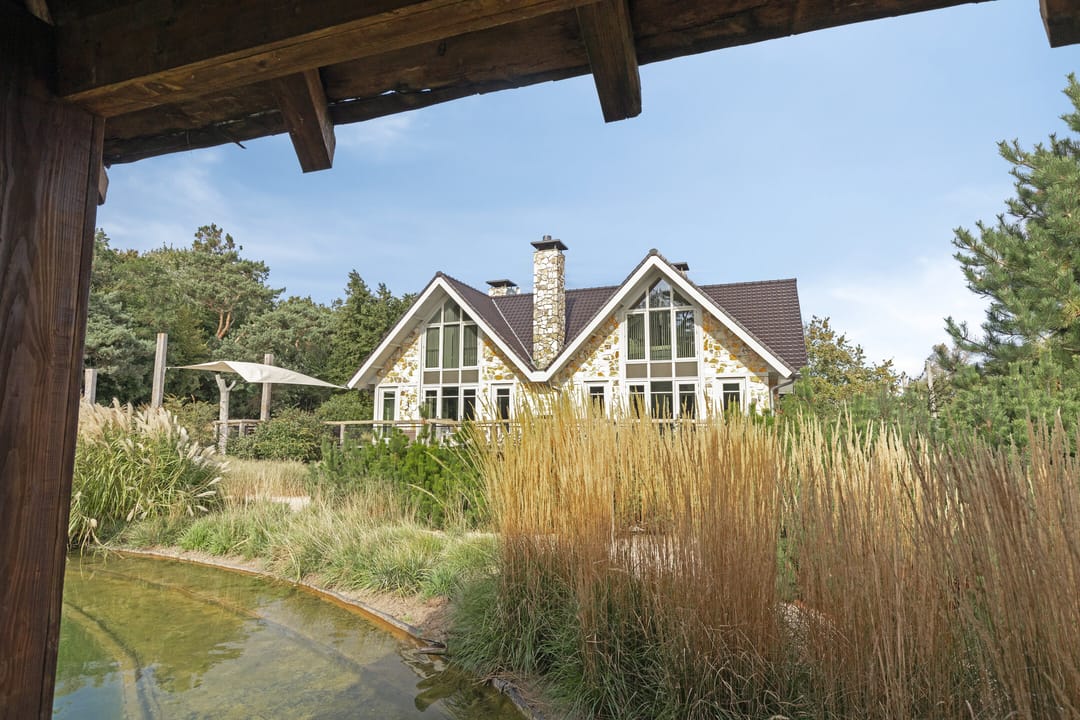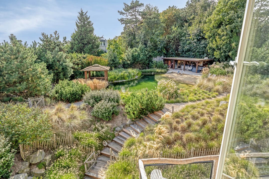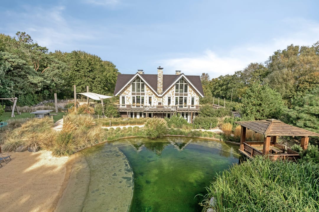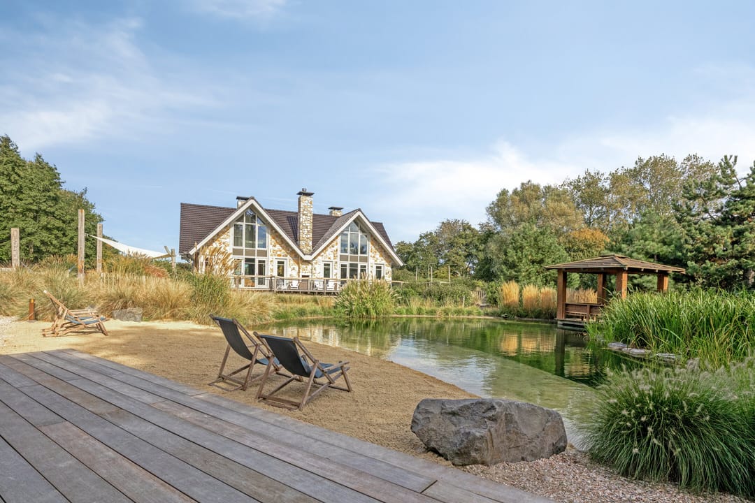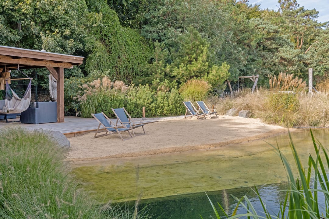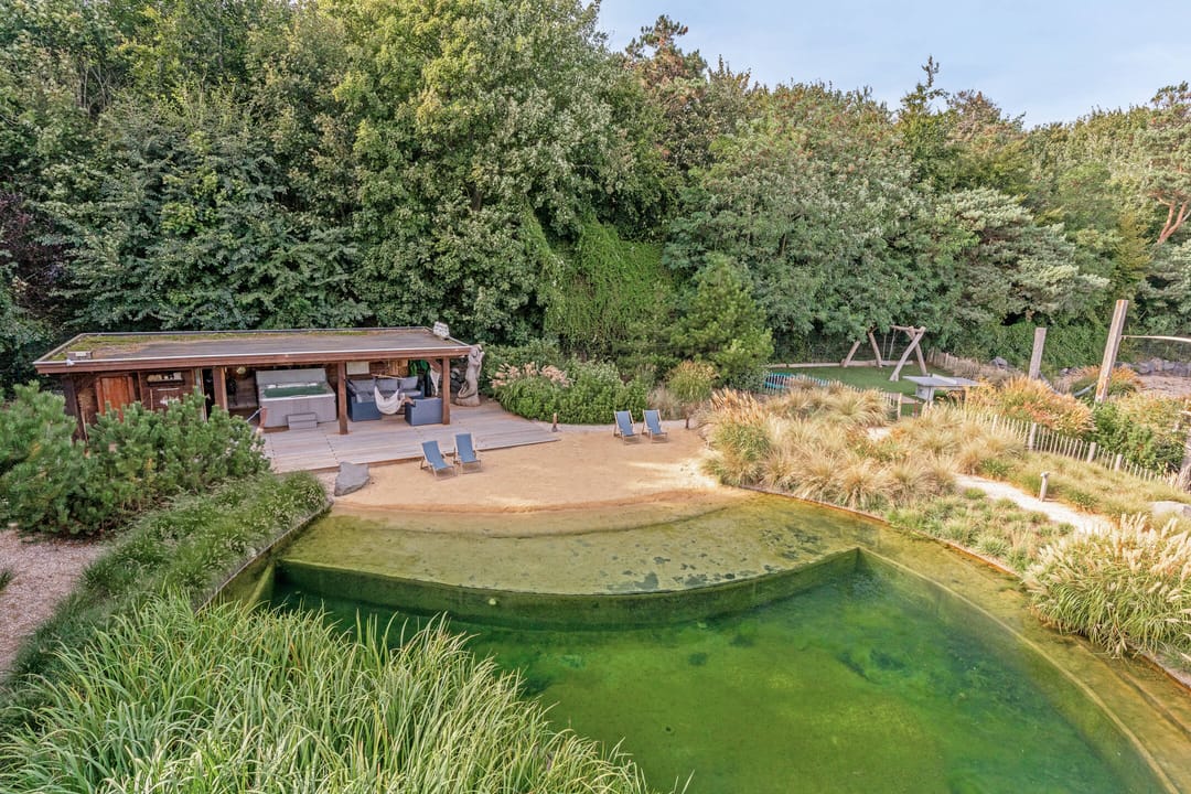 Centraal in de tuin ligt een indrukwekkende, natuurlijk gefilterde zwemvijver van circa 3 meter diep, compleet met een klein zandstrandje en comfortabele ligbedden, een perfecte plek om op warme dagen te ontspannen. Langs het pad dat van de villa naar de zwemvijver loopt, zorgen sfeervolle fakkels voor een bijzondere ambiance in de avonduren.