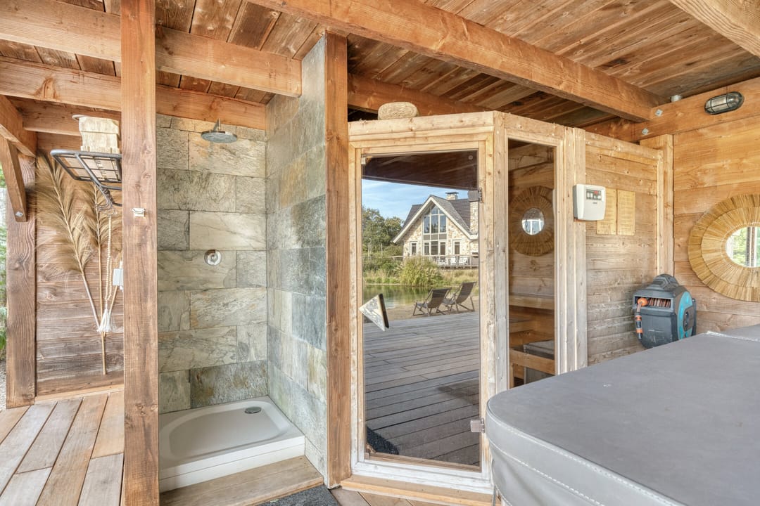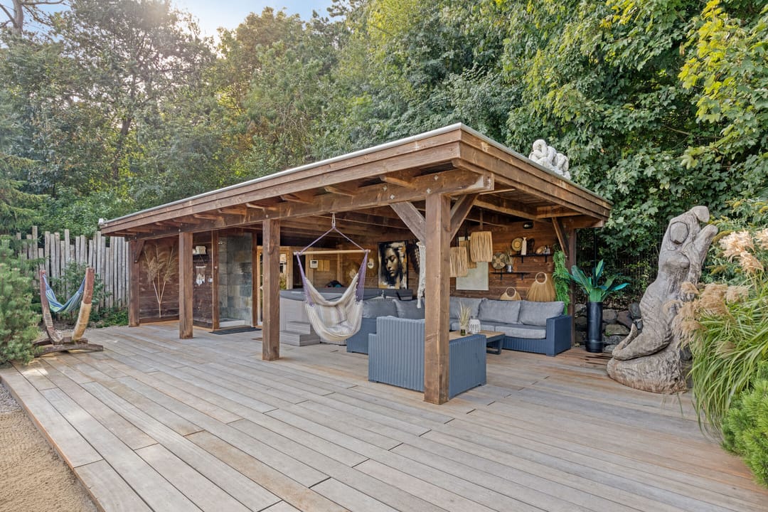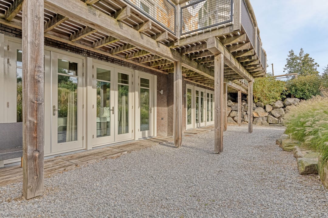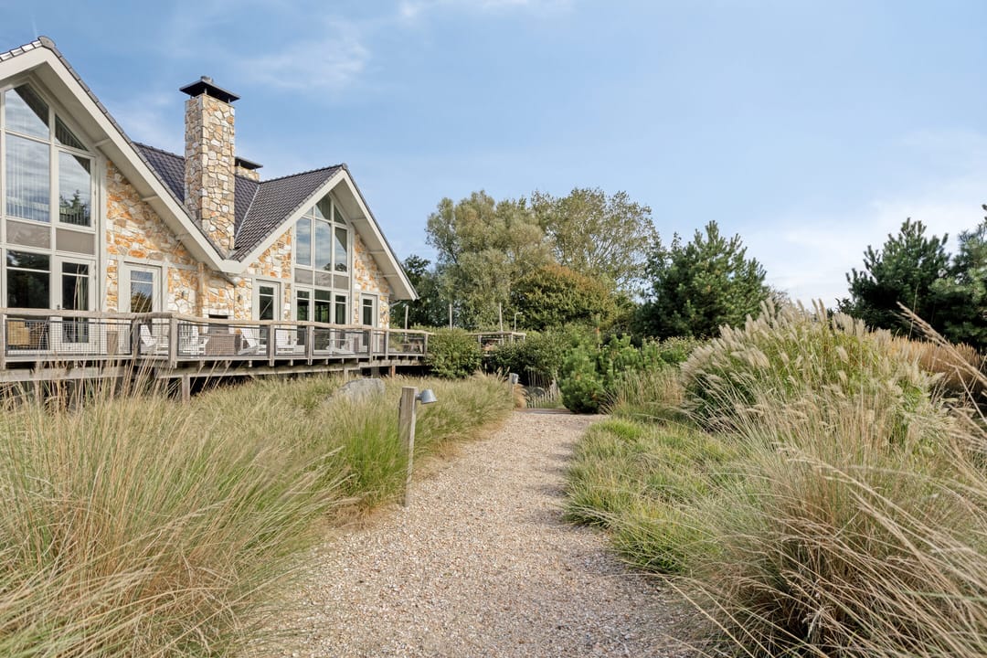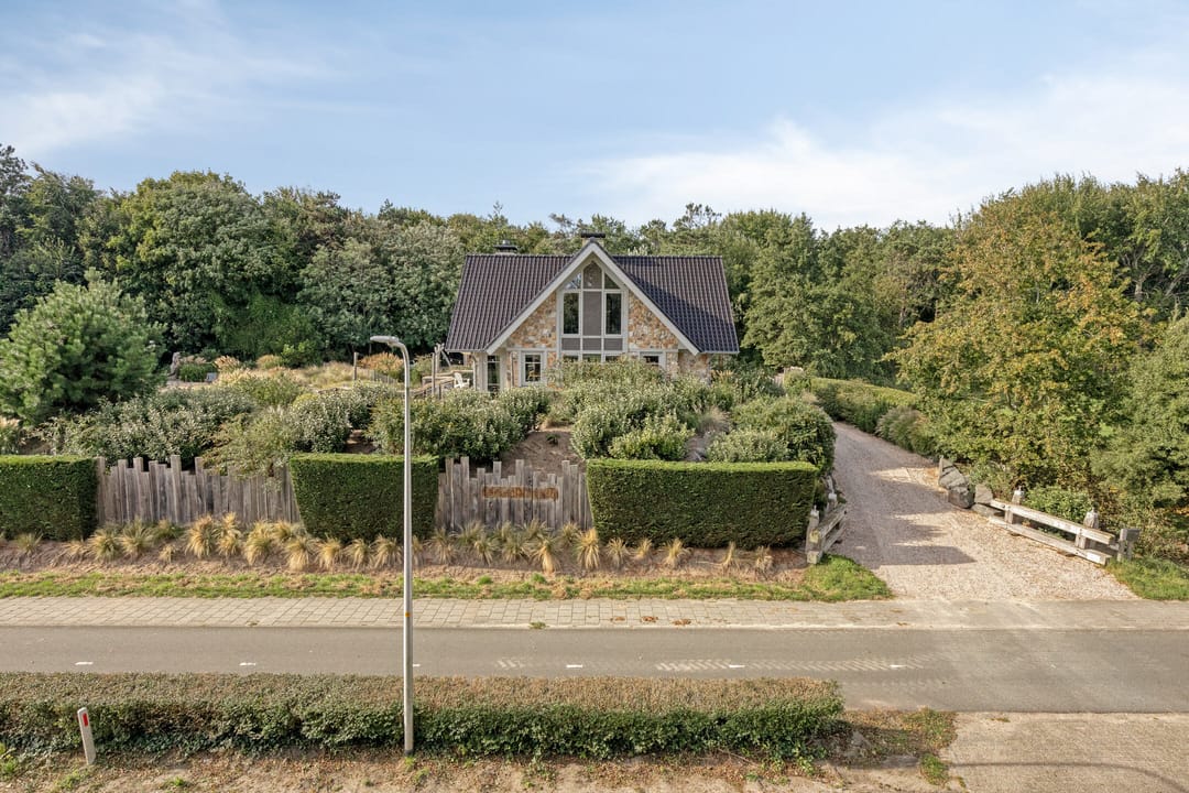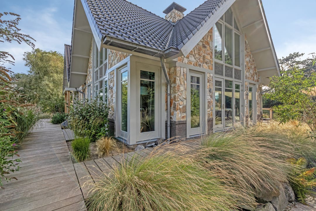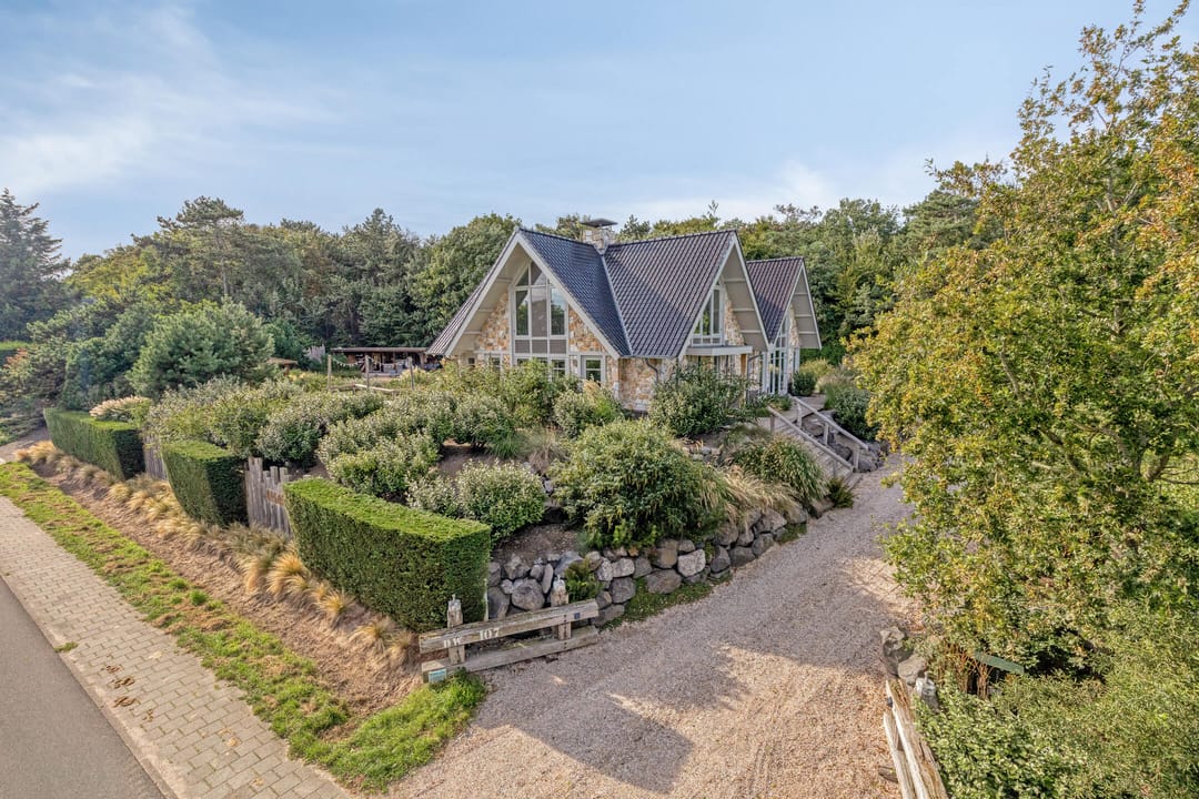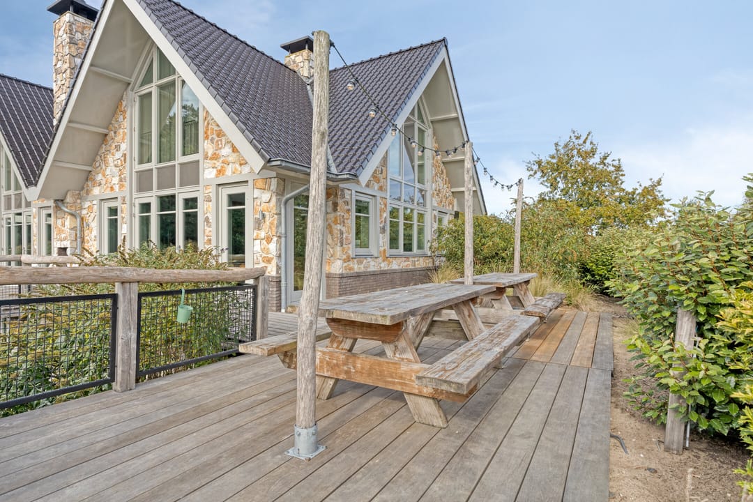 Onder een ruime overkapping bevindt zich een luxe wellnesshoek met een jacuzzi, een sauna, een comfortabele zithoek, een douche en een toilet. Hier kunt u het hele jaar door in alle privacy genieten van ontspanning en comfort. Achter de overkapping leidt een pad direct het bos met aansluitend duingebied in, ideaal voor een ochtendwandeling of even ontsnappen in de natuur.