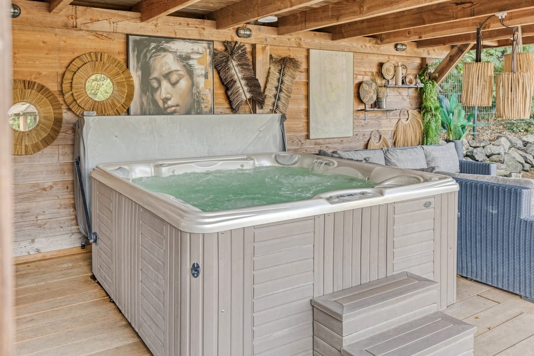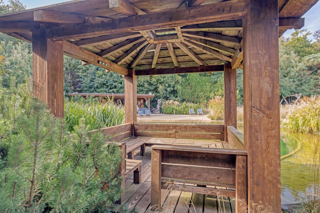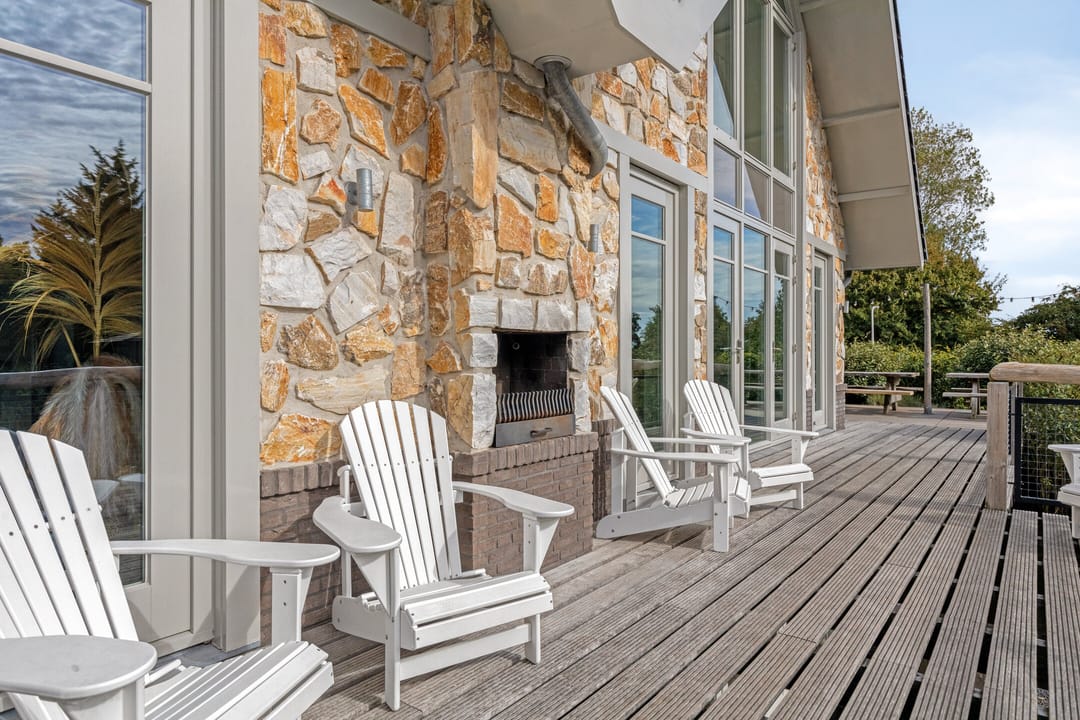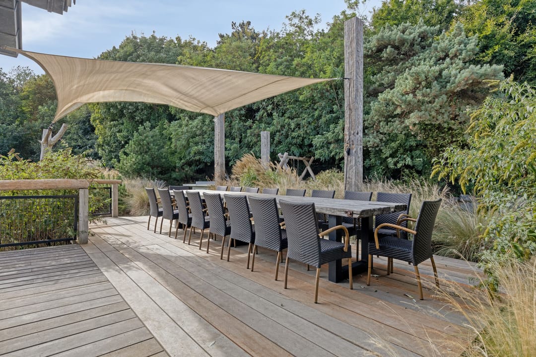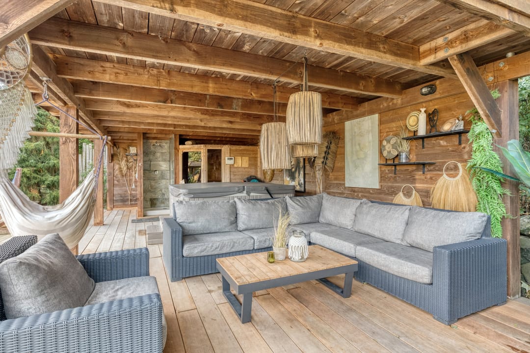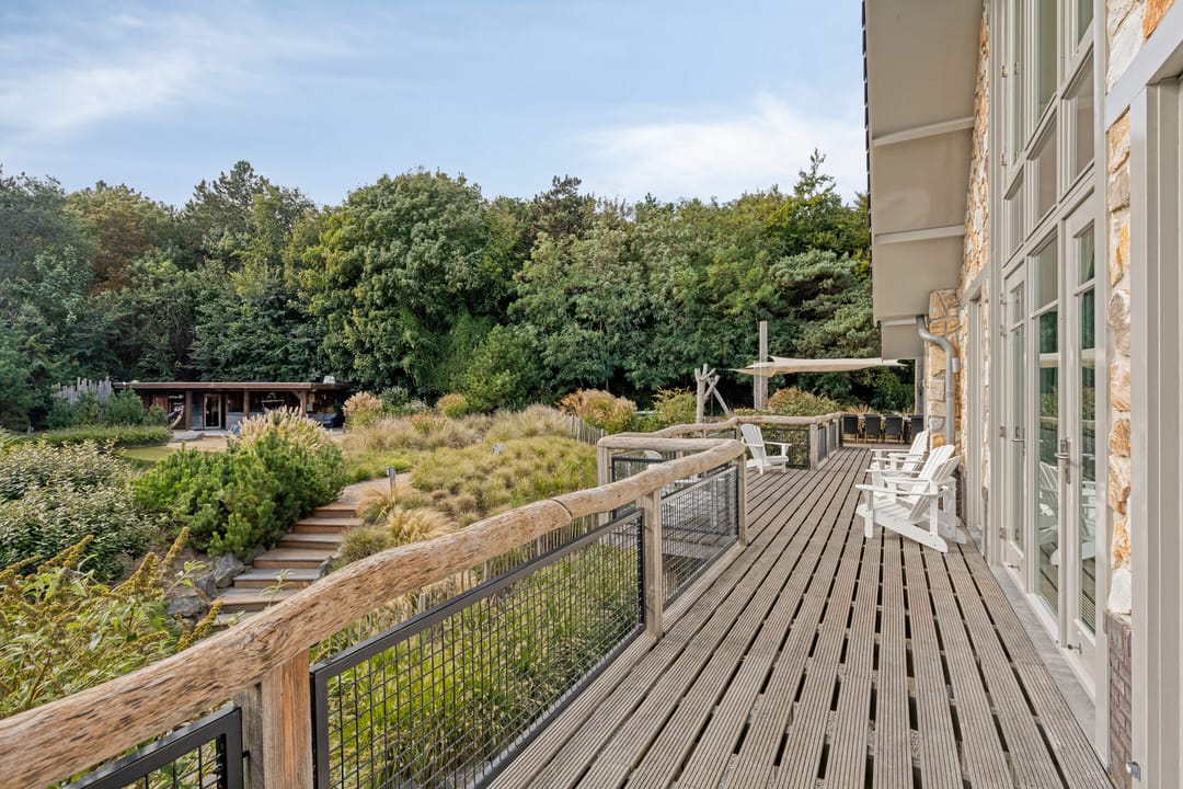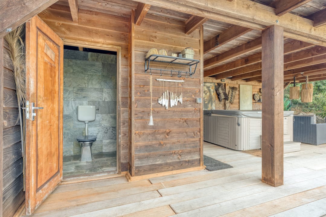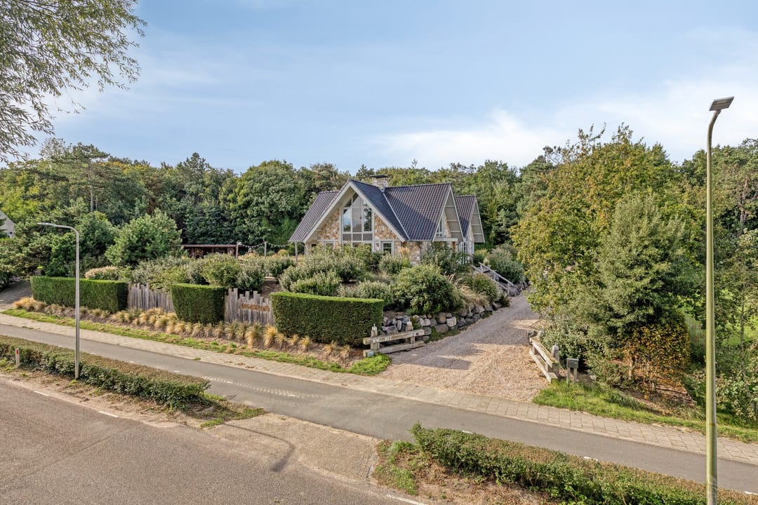 Onder een ruime overkapping bevindt zich een luxe wellnesshoek met een jacuzzi, een sauna, een comfortabele zithoek, een douche en een toilet. Hier kunt u het hele jaar door in alle privacy genieten van ontspanning en comfort. Achter de overkapping leidt een pad direct het bos met aansluitend duingebied in, ideaal voor een ochtendwandeling of even ontsnappen in de natuur.