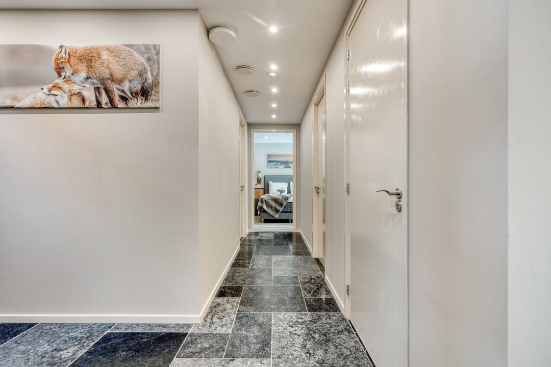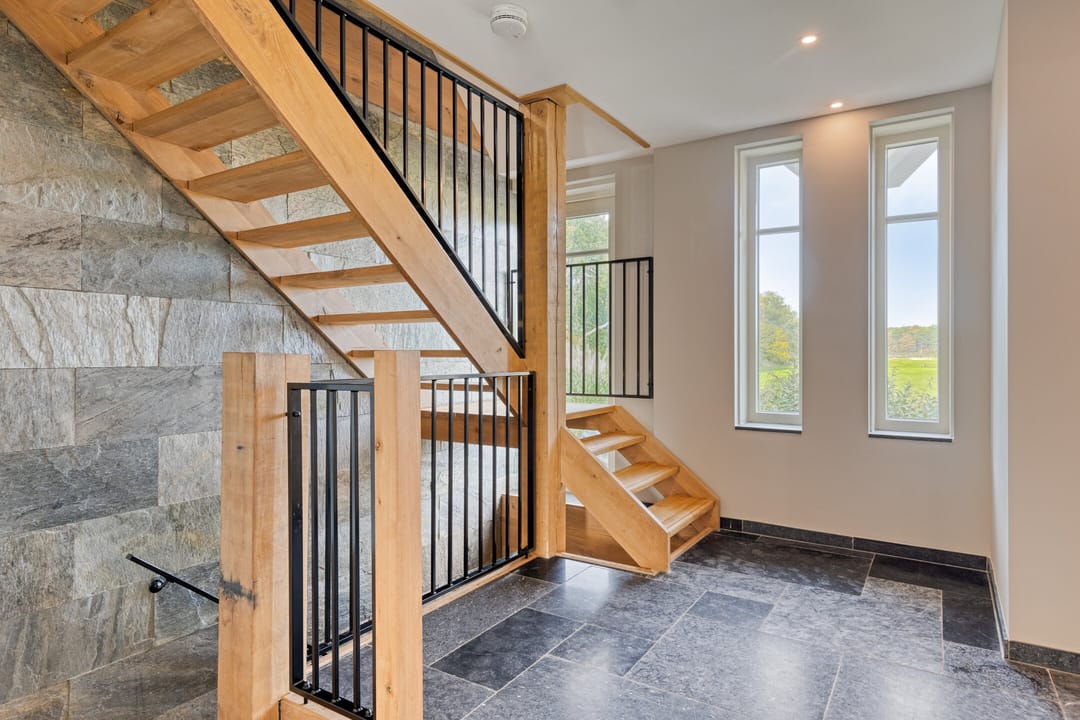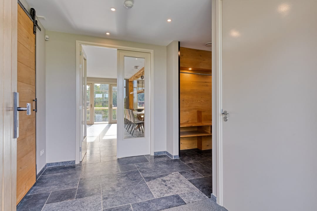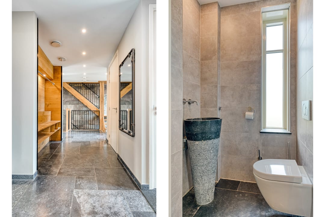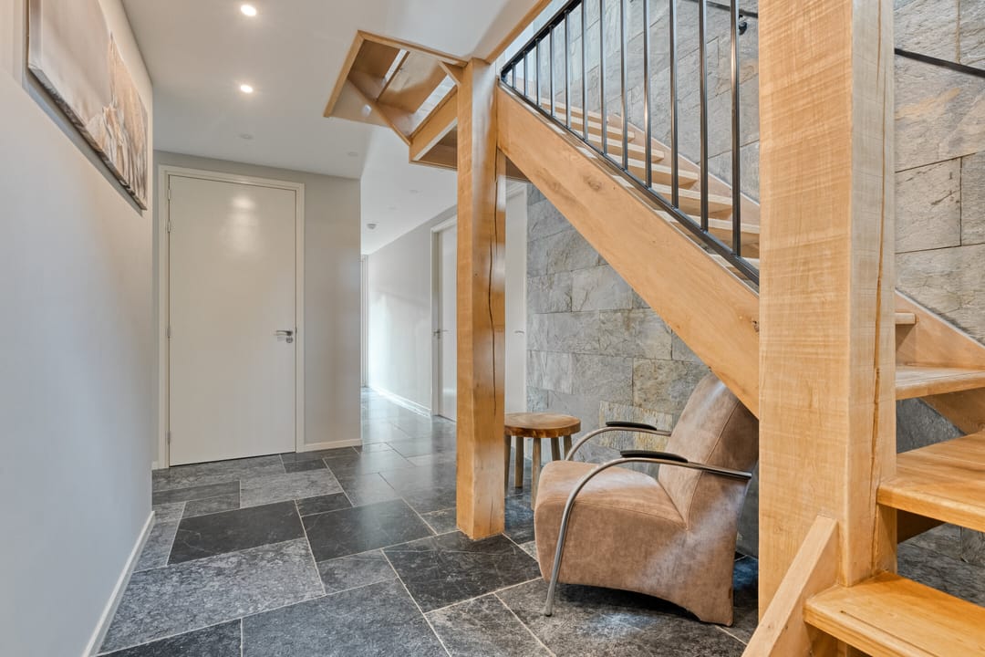 Through a beautiful oak front door you enter the home. In the hallway you will find the separate toilet, the utility room with space for laundry appliances, and the staircase leading to both the basement and the first floor. The entire floor is finished with an elegant natural stone floor, enhancing the home’s luxurious and stylish appearance. From the hallway, double doors provide access to the kitchen, while oak sliding loft doors lead you into the atmospheric living room.