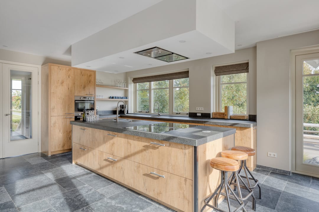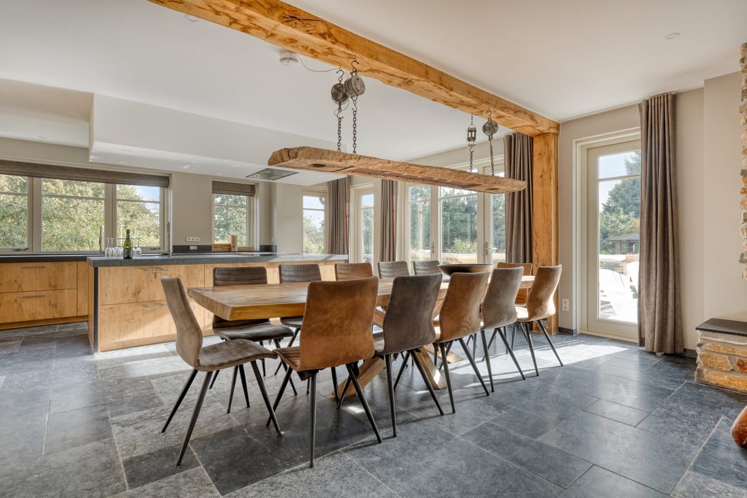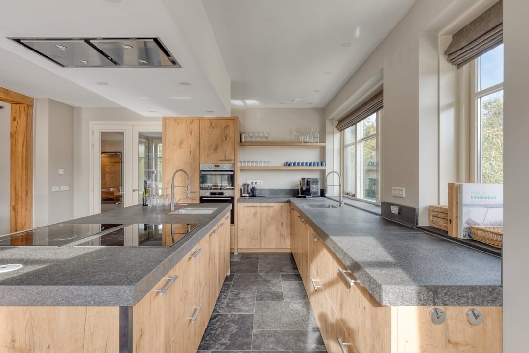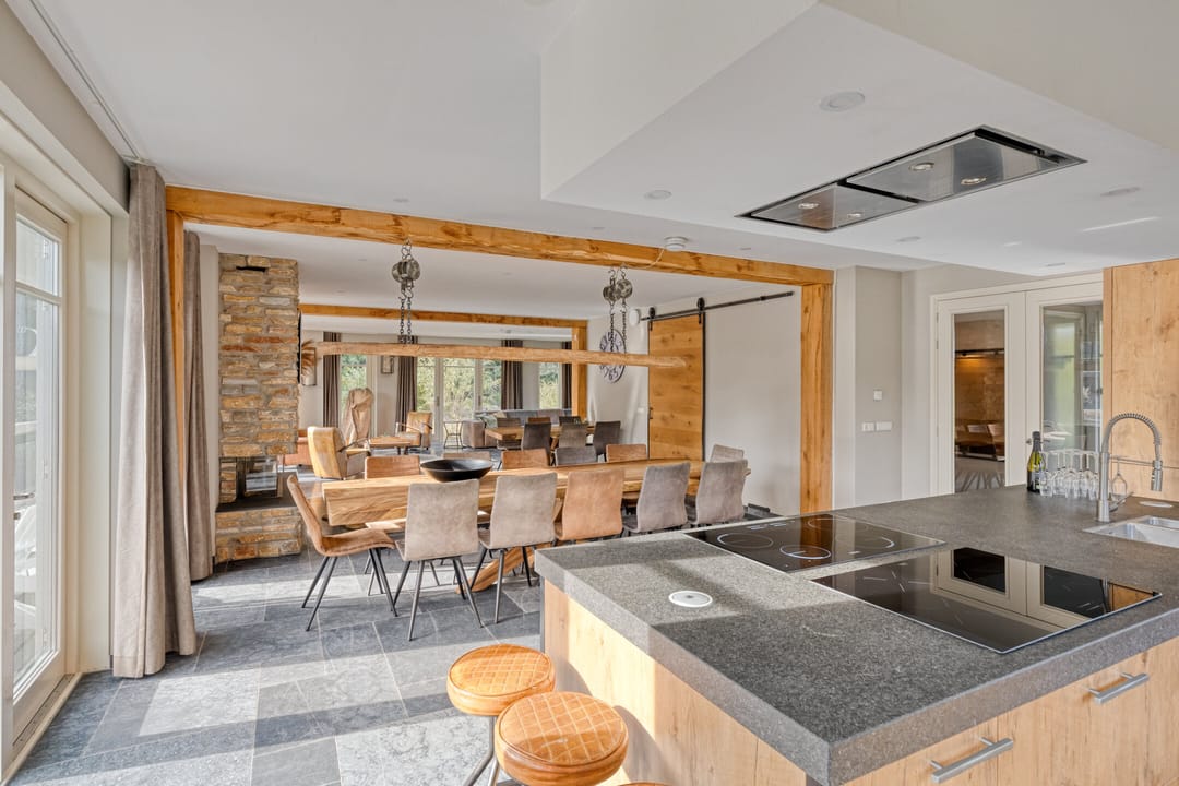 Aangrenzend bevindt zich de ruime en volledig uitgeruste leefkeuken, waar koken en samenkomen perfect combineren. De keuken is voorzien van hoogwaardige inbouwapparatuur, waaronder twee inductiekookplaten, een plafondafzuigkap, twee vaatwassers, een koelkast, een oven, een combi-oven en twee spoelbakken. Daarnaast is er een kleine bar met drie barkrukken, ideaal voor een snel ontbijt of een goed glas wijn tijdens het koken. Uiteraard is er volop opbergruimte dankzij de vele lades en kasten. De aangrenzende eethoek biedt plaats aan maar liefst 18 personen en vormt daarmee de perfecte plek voor gezellige diners, spelletjesavonden of lange gesprekken met familie en vrienden.