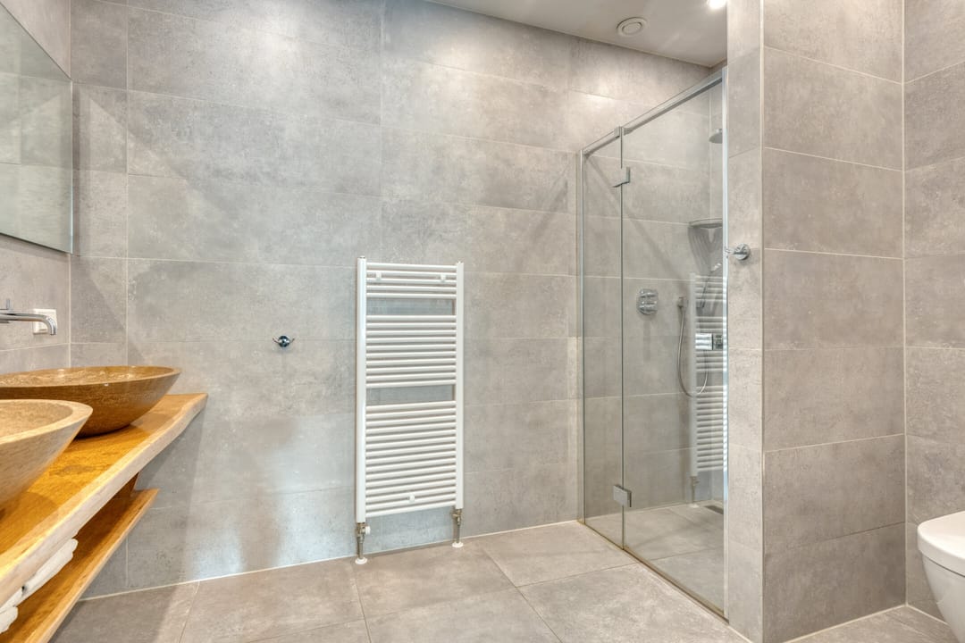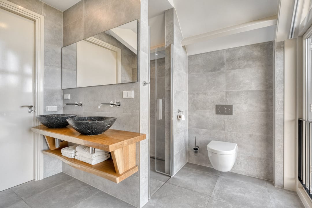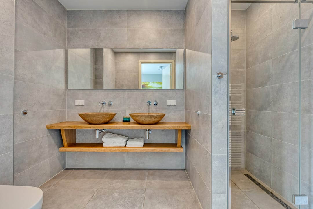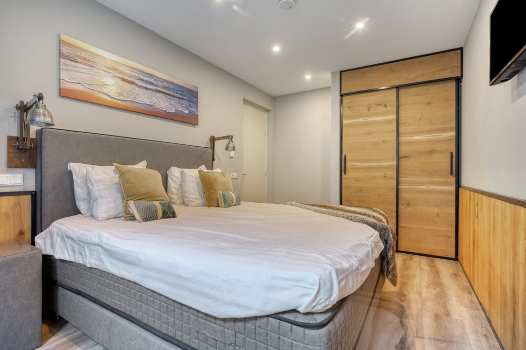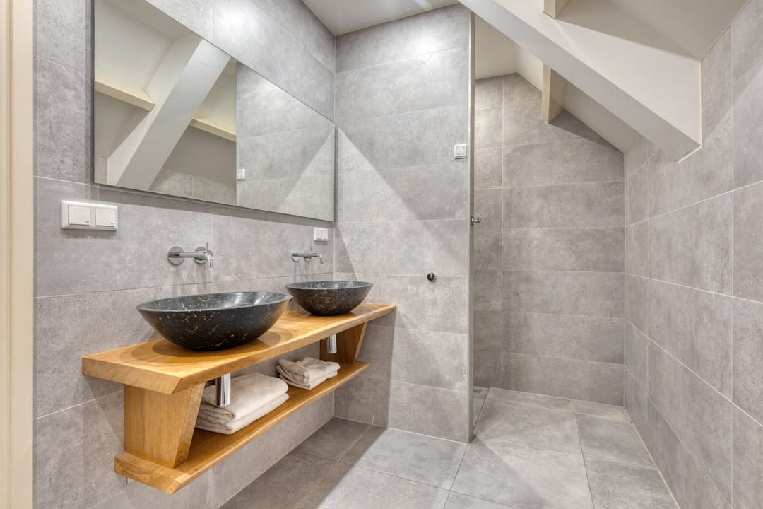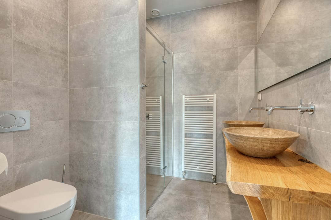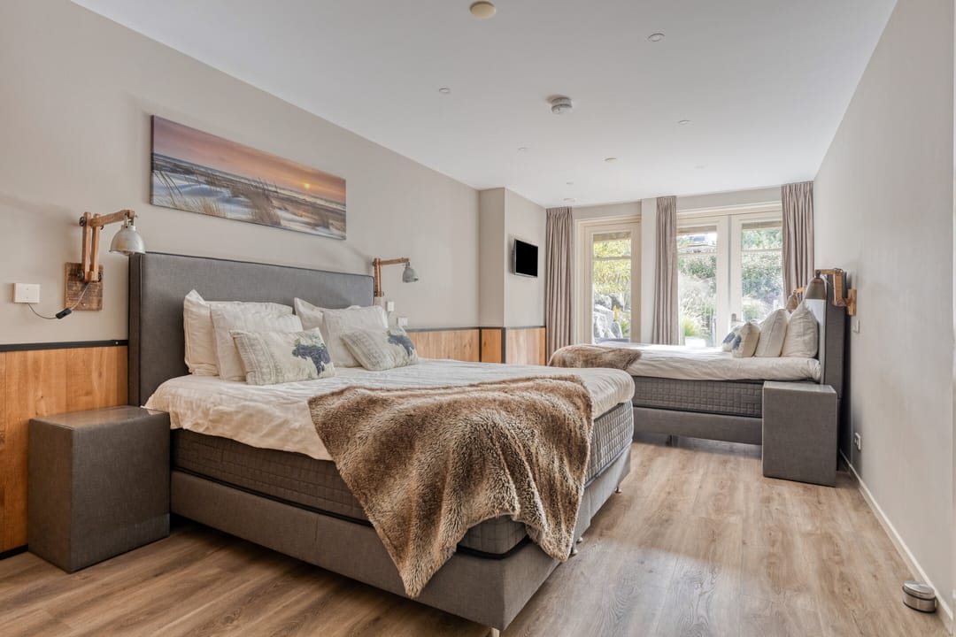 De benedenverdieping biedt vier smaakvol ingerichte slaapkamers, waarvan twee ruimer van opzet zijn en twee iets compacter. Drie van de vier kamers hebben via openslaande deuren direct toegang tot het terras. Alle slaapkamers zijn voorzien van een moderne pvc-vloer, vloerverwarming, satelliet-tv én ingebouwde kasten. Daarnaast beschikt elke kamer over een eigen badkamer met douche, wastafel en toilet.