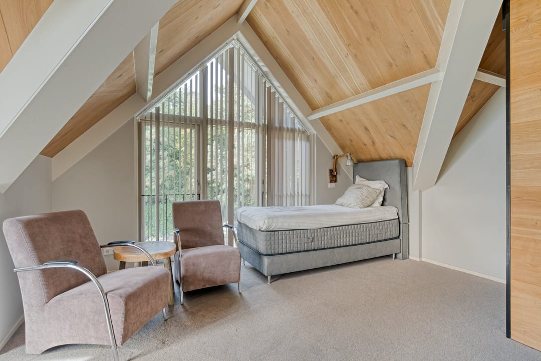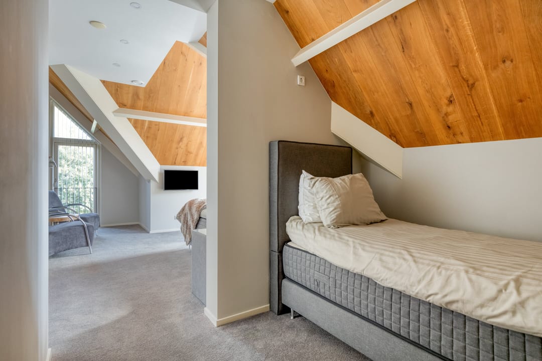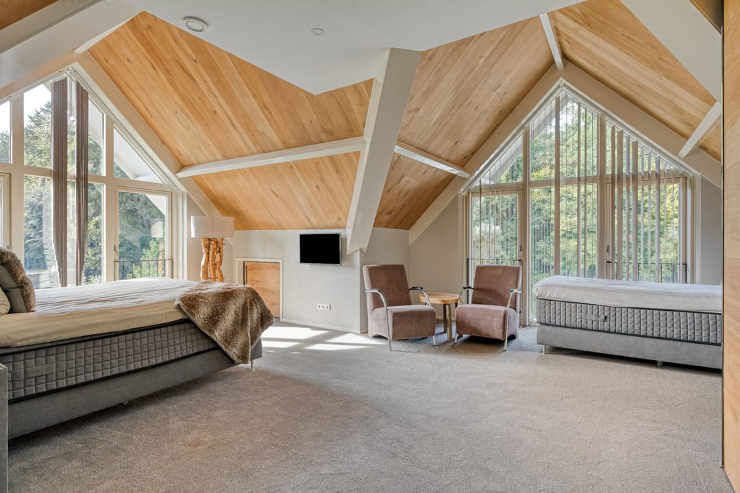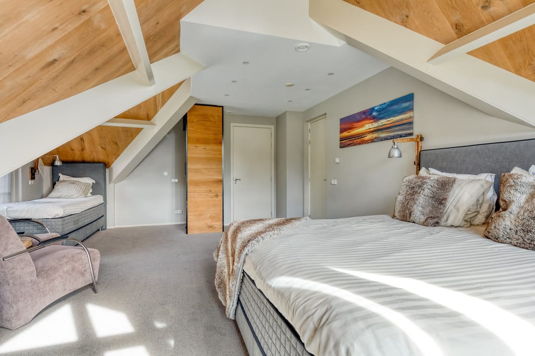 Op de bovenste verdieping bevinden zich drie sfeervolle slaapkamers, elk met een hoog plafond, veel natuurlijk licht en een comfortabele indeling. Twee van de drie kamers zijn ingericht met zowel een tweepersoons- als een eenpersoonsbed.