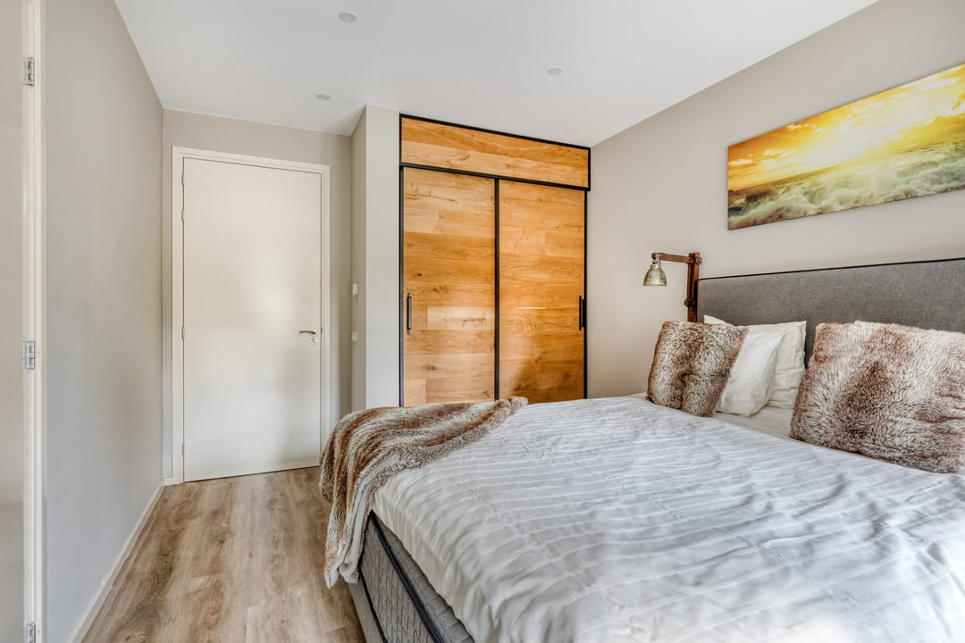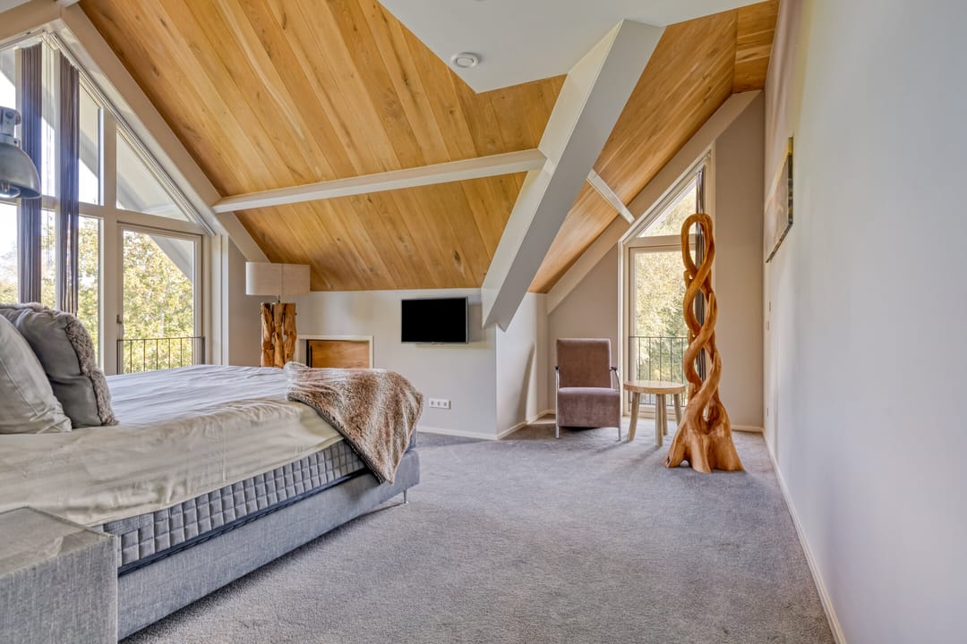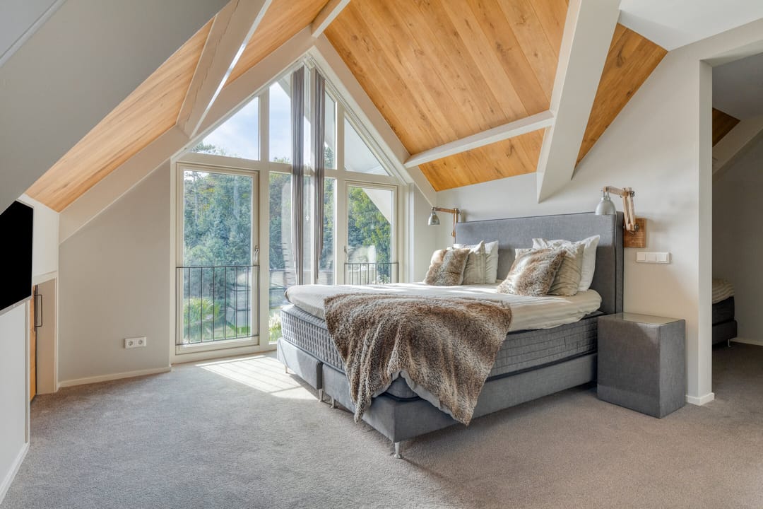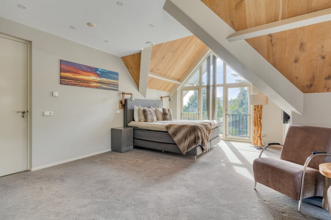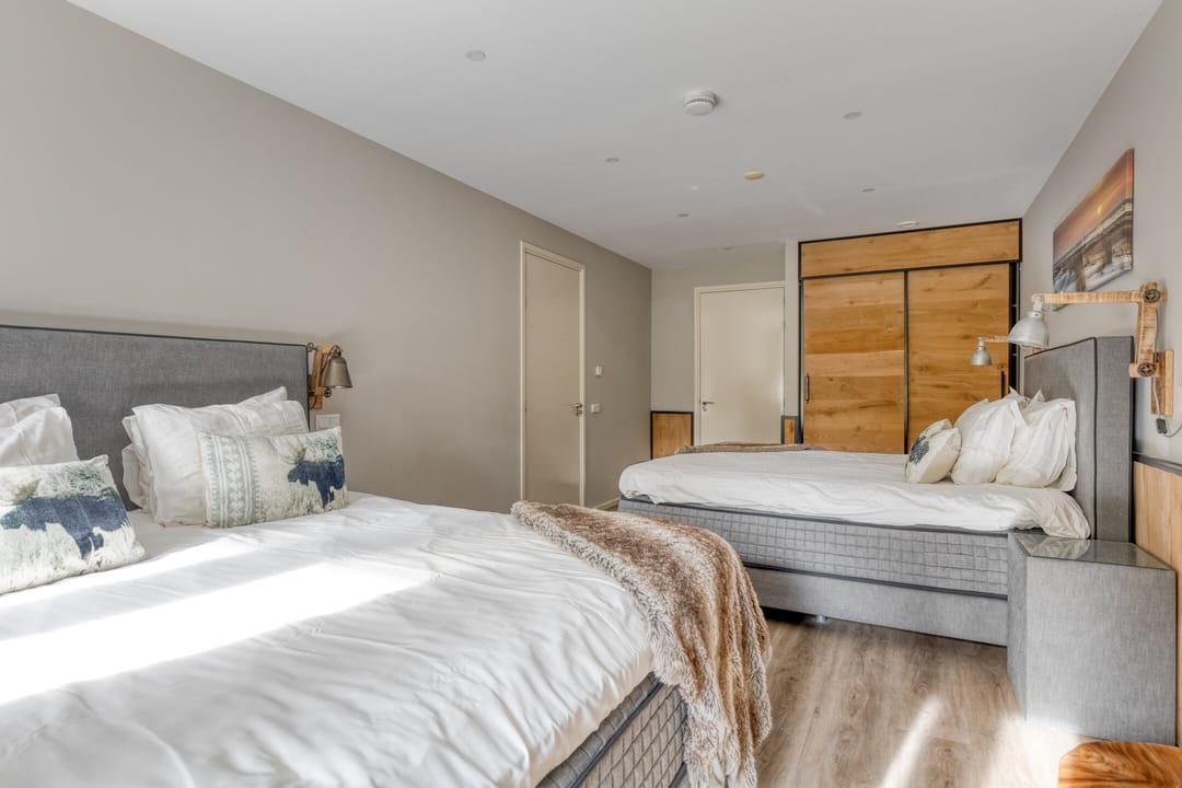 Op de bovenste verdieping bevinden zich drie sfeervolle slaapkamers, elk met een hoog plafond, veel natuurlijk licht en een comfortabele indeling. Twee van de drie kamers zijn ingericht met zowel een tweepersoons- als een eenpersoonsbed.