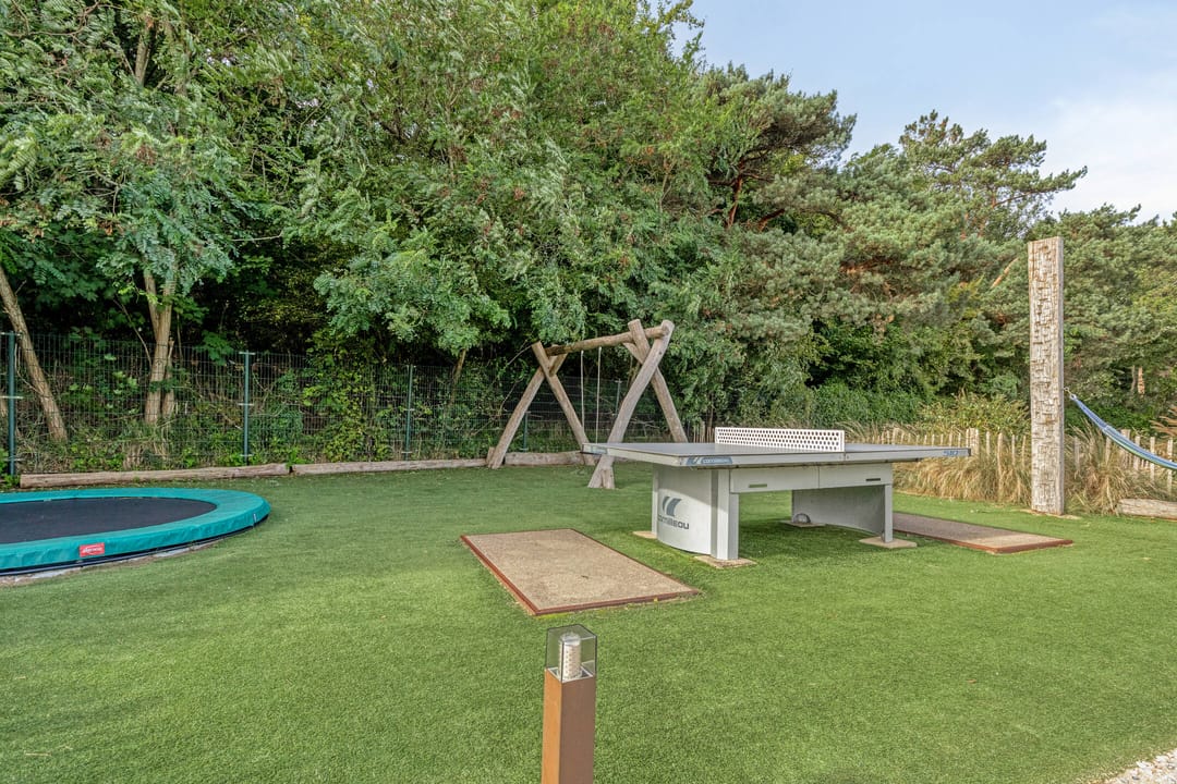 Ook voor kinderen is er volop ruimte om veilig te spelen. De volledig omheinde tuin beschikt over een eigen speelterrein met kunstgras, een trampoline, schommel, tafeltennistafel en een hangmat.