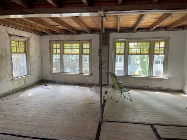 De bovenwoning is geheel gestript en staat leeg. Er is een omgevingsvergunning verleend voor de verbouw tot een appartementen in twee lagen. D bovenwonng heeft een separate opgang en heeft de mogelijkheid vaneen (royaal) dakterras.