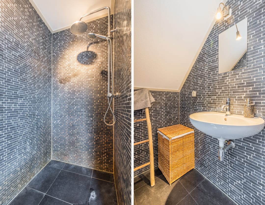 • De twee en-suite badkamers op de bovenverdieping zijn voorzien van een wastafelmeubel en een inloopdouche.