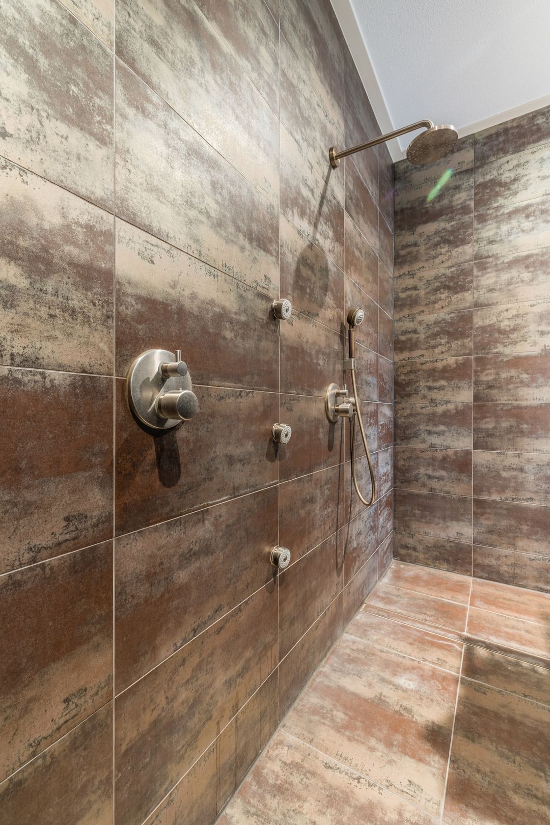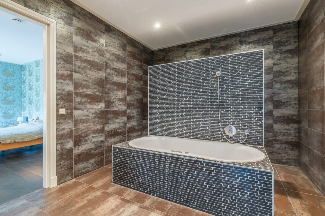 • De badkamer op de begane grond is voorzien van een stijlvol wastafelmeubel, een toilet, een whirlpool ligbad en een dubbele inloopdouche.