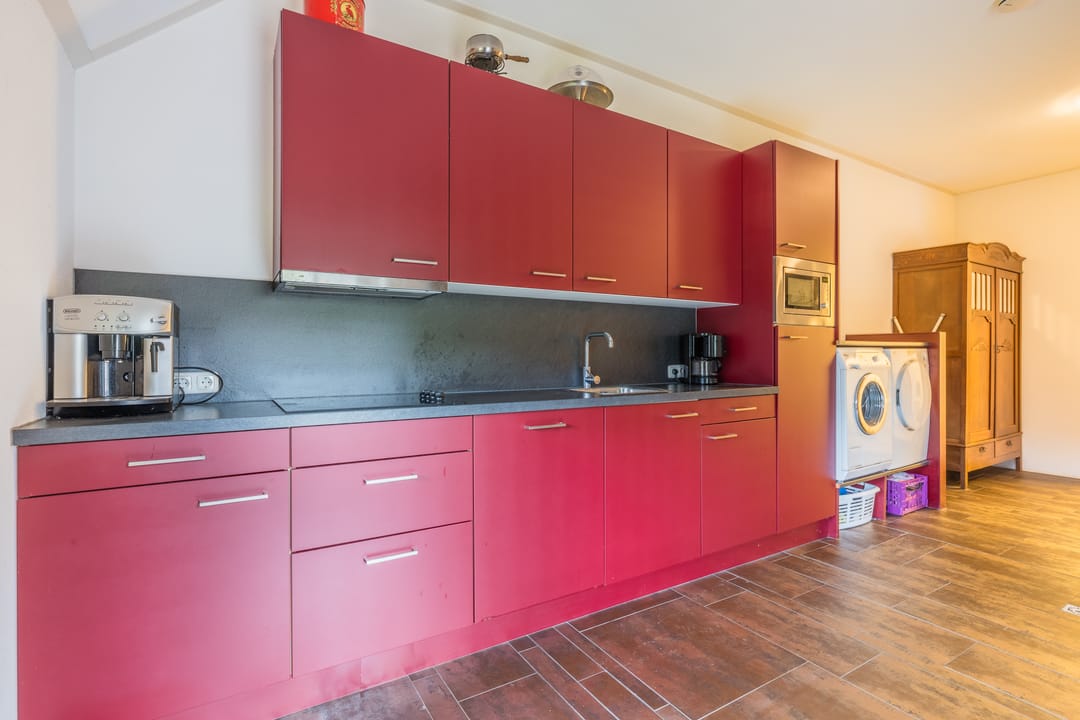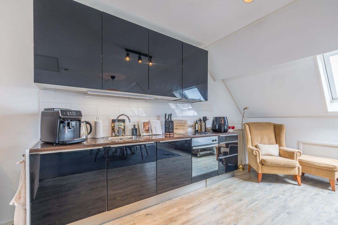 De keuken is voorzien van een rechte wandopstelling een inductiekookplaat, afzuigkap en een oven.