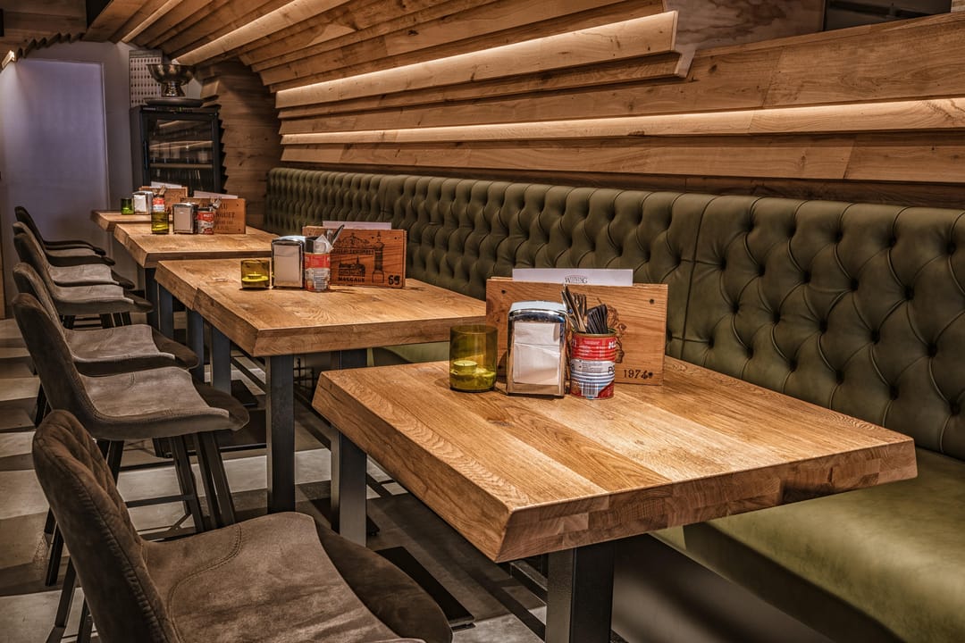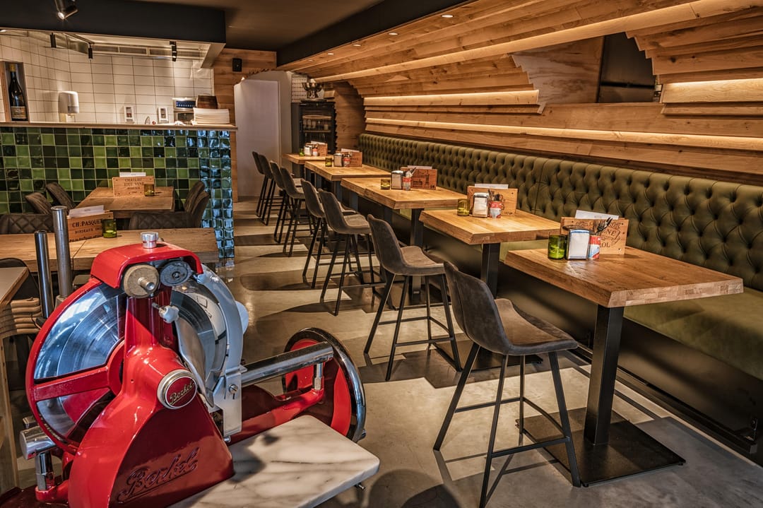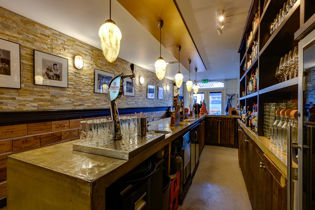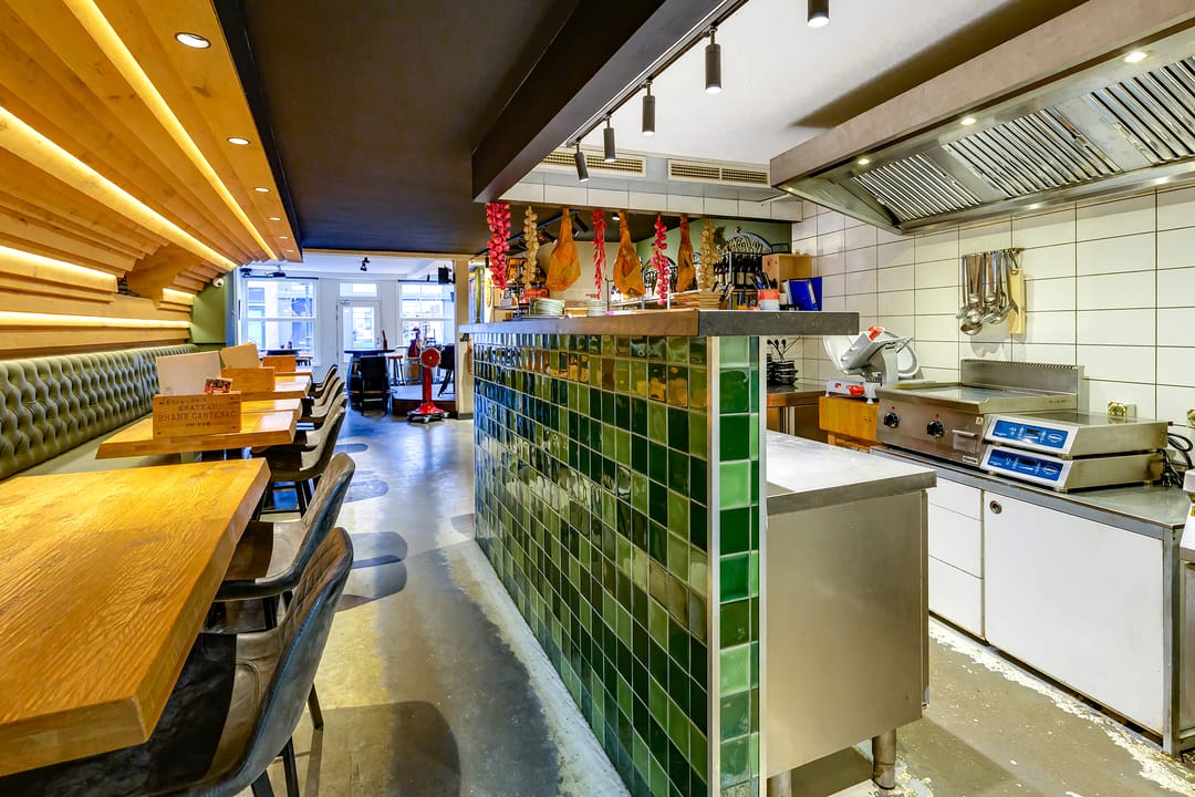 Door de afwisseling van hoge tafels met en lage tafels met luxe stoelen heeft de inrichting een luxe uitstraling waar de gasten zich snel thuis voelen. De eyecatcher is de grote bar met rondom barstoelen in het midden van het restaurant. De wanden zijn mooi gedecoreerd met lambrisering en decoraties. Achterin het restaurant is de open keuken. De keuken is zeer compleet ingericht en alle apparatuur verkeert in uitstekende staat.