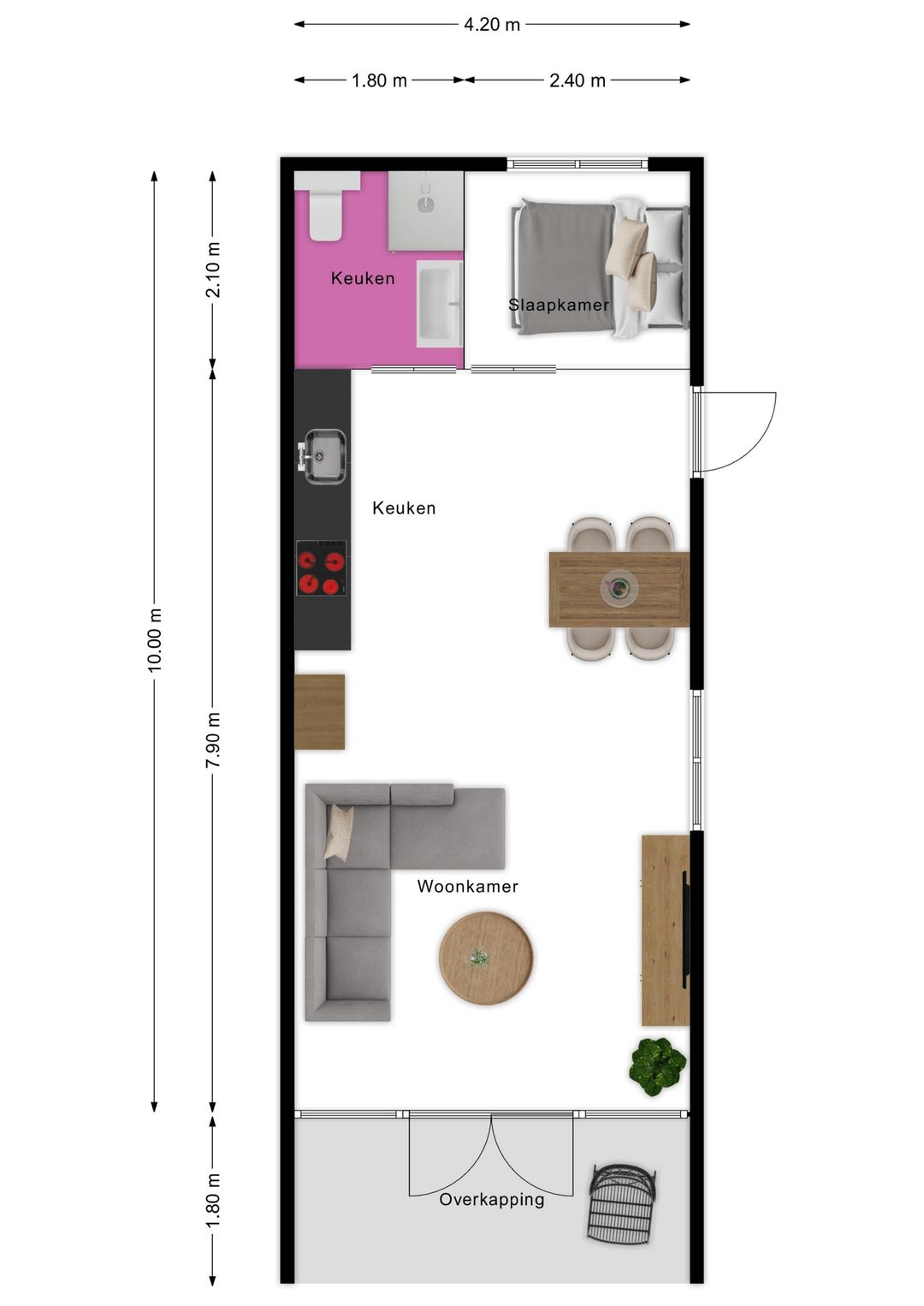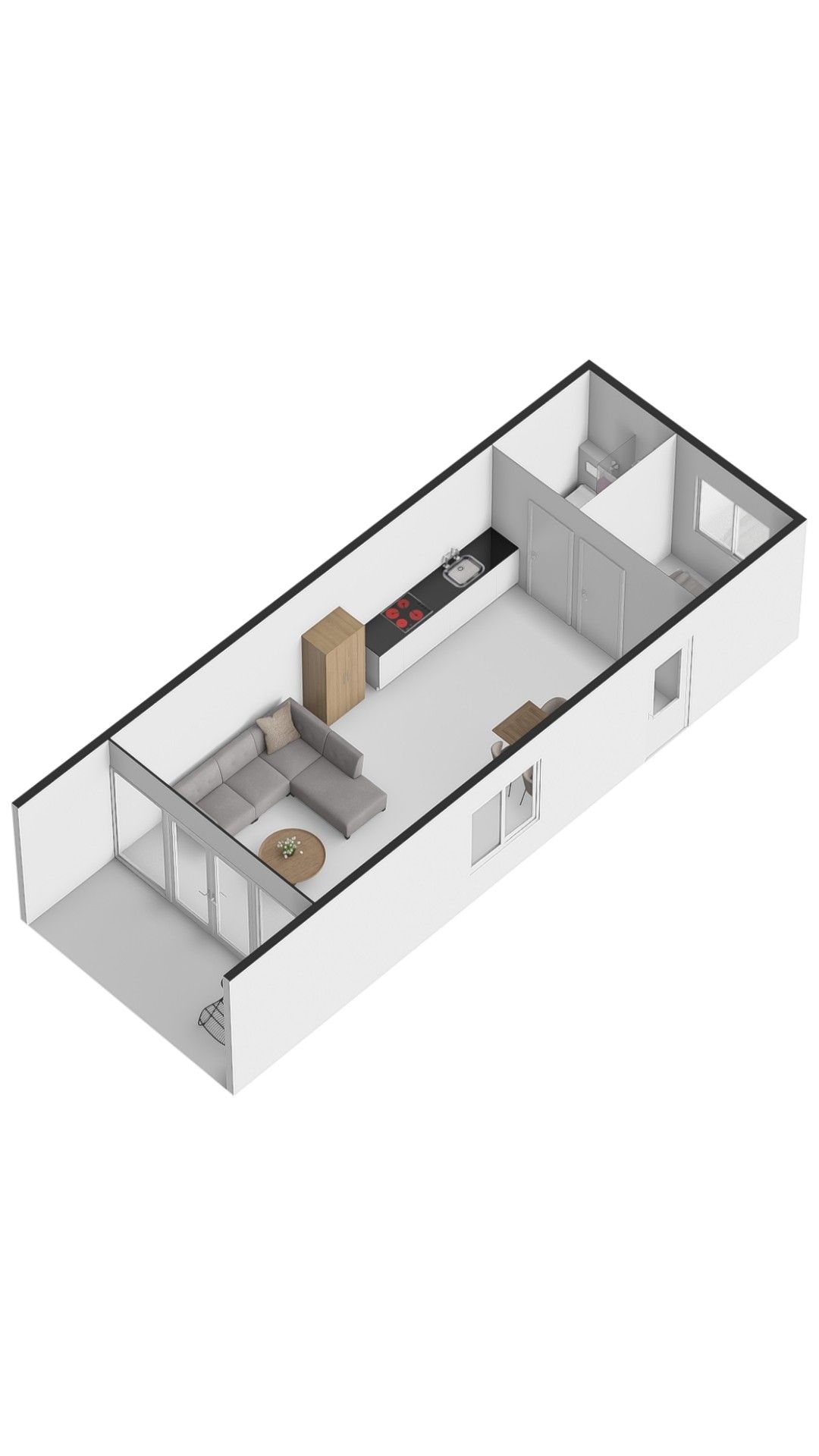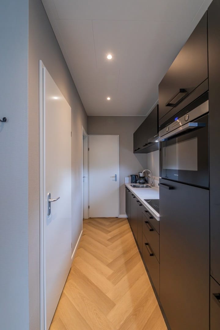 De slimme en efficiënte indeling bestaat uit een comfortabele woonruimte met veel daglicht, een moderne open keuken, een luxe badkamer en een extra slaap- of werkruimte op de vide. Ideaal voor eigen recreatief gebruik én verhuur.
