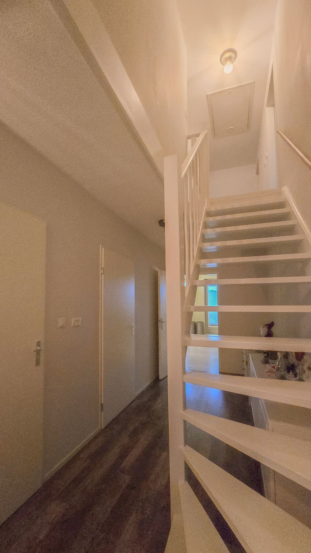 Vanuit de hal/entree is er toegang tot een toiletruimte, trapopgang naar de 2e verdieping en keuken/woonkamer. In de hal bevindt zich een garderobenis. Keuken en woonkamer staan in open verbinding met dubbele deuren naar het ruime dakterras.