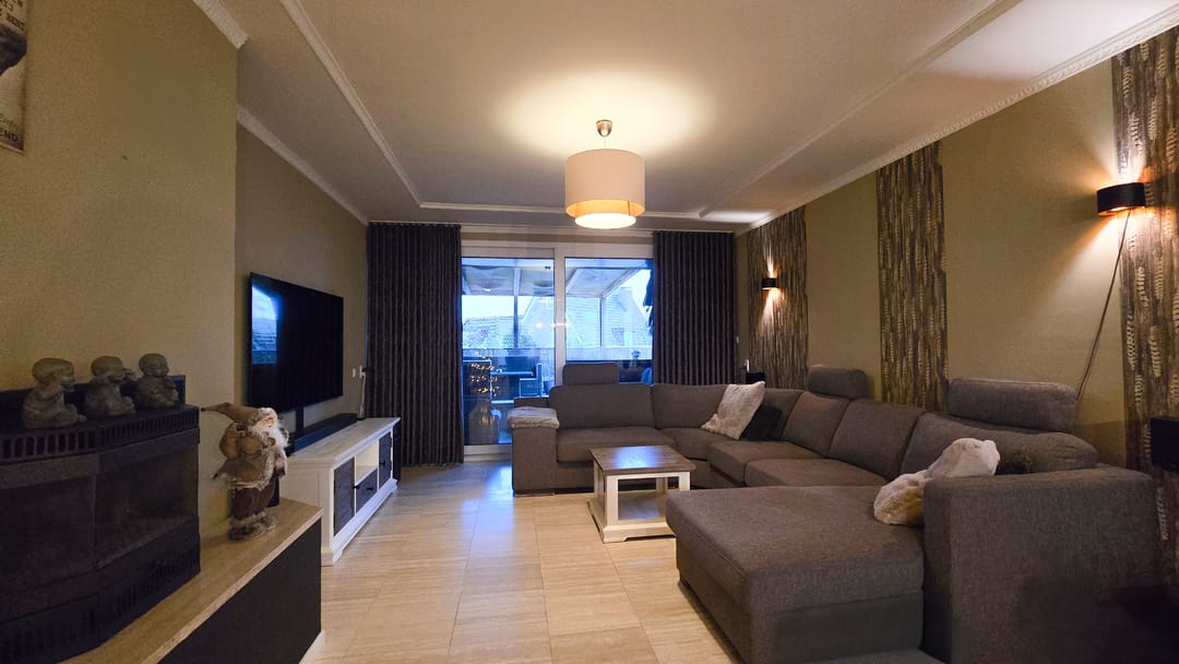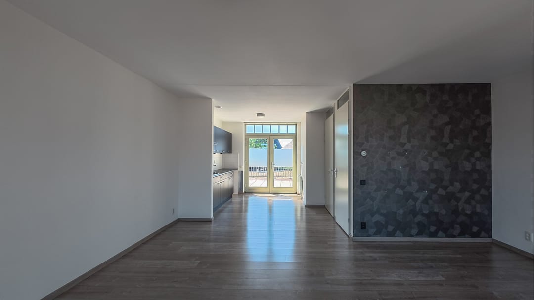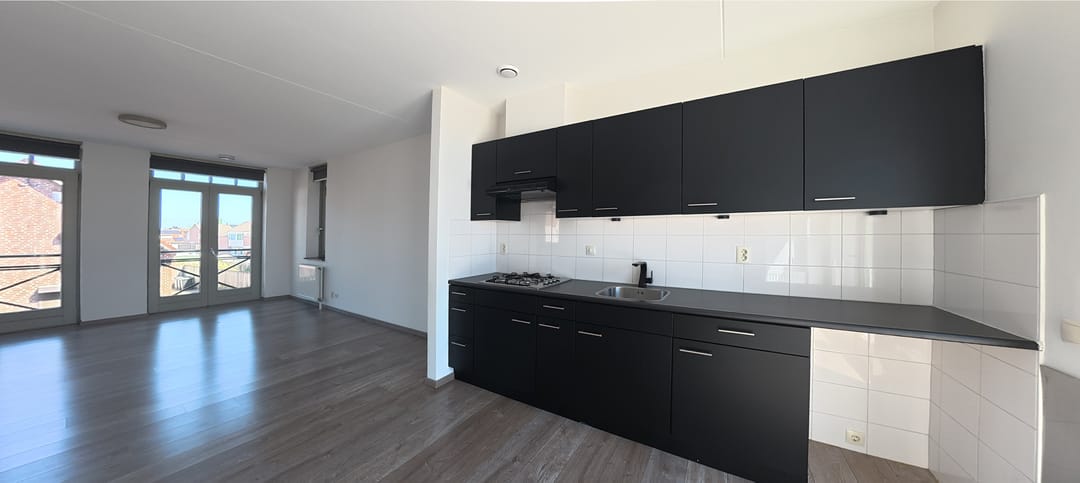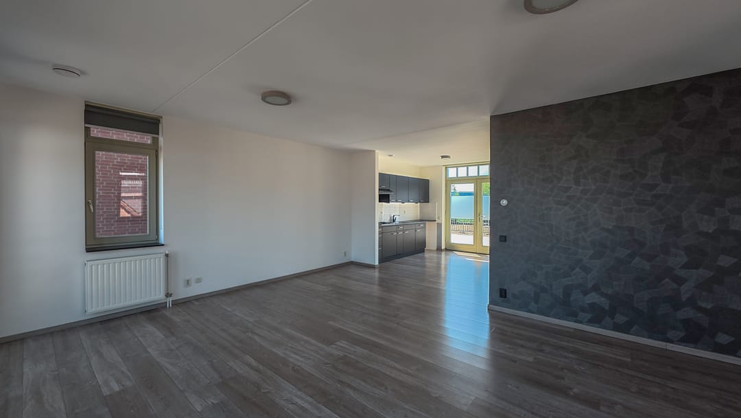 Vanuit de entree heeft u toegang tot de hal/overloop. Hier heeft u een trapopgang, bergkast met aansluitingen voor de wasmachine, toiletruimte en toegang tot bijkeuken met douche, open keuken met luxe inrichting v.v. combi/oven magnetron, gaskookplaat, afzuigkap, vaatwasser en koelkast. De keuken en woonkamer staan in open verbinding waardoor er een ruimtelijk effect ontstaat. De woonkamer heeft een haardpartij, vier Franse balkons en een schuifpui naar de loggia waarvandaan men verder kan naar het dakterras.