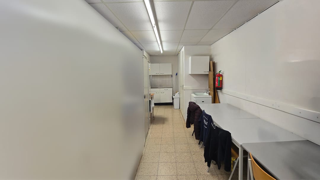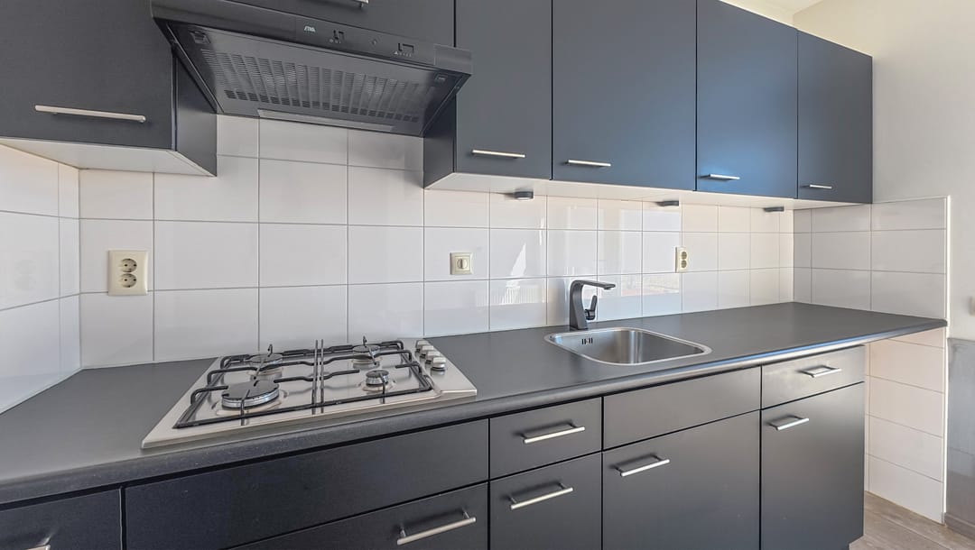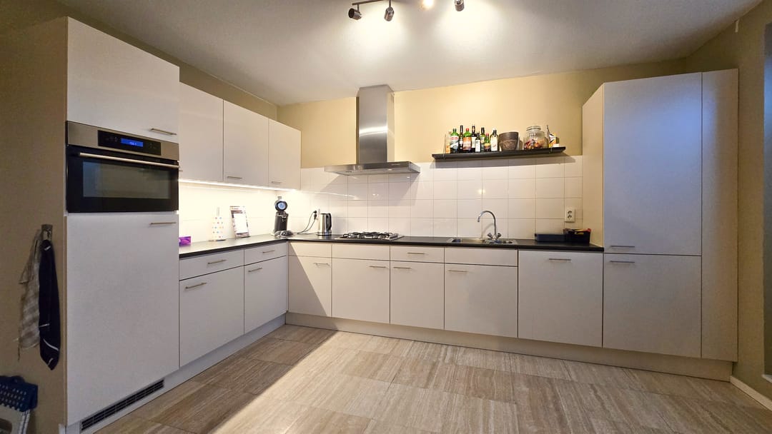 - Pantry voorzien van keukenblok met close-in-boiler, wandtegels (tot bovenkastjes) en