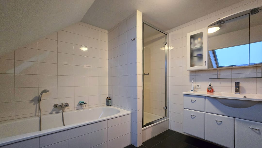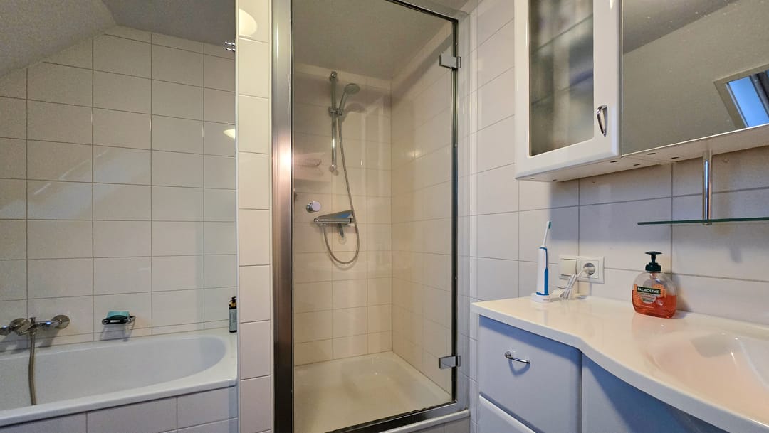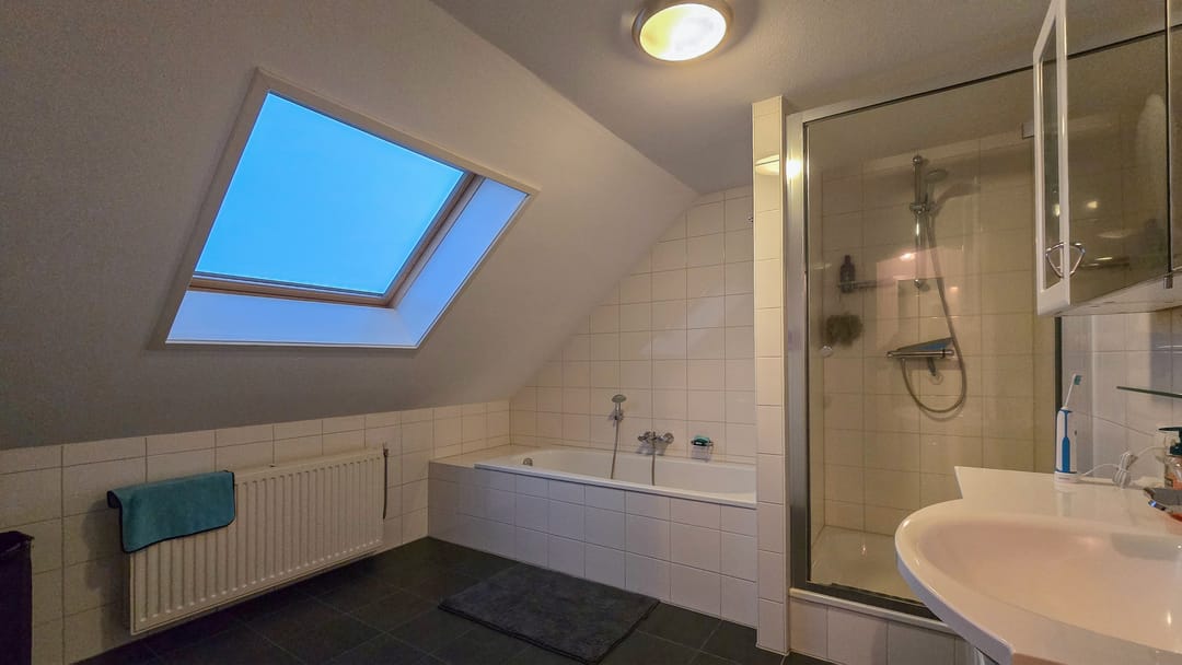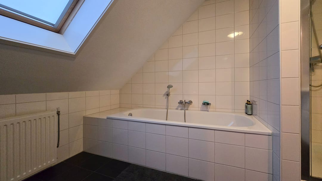 Vanuit de overloop is er toegang tot 3 slaapkamers, badkamer en vlizotrap naar bergzolder op de derde verdieping. De badkamer is geheel betegeld en voorzien van een ligbad, douchecabine, toilet, vaste wastafel.