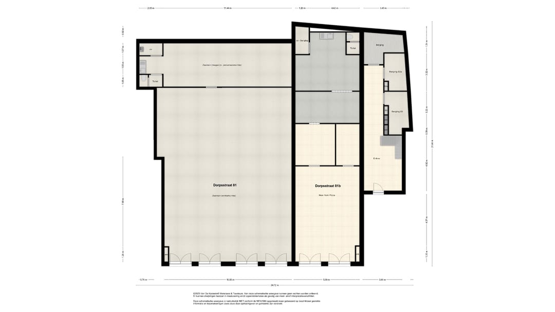 De winkel van Zeeman aan de Dorpsstraat 81-81a heeft een oppervlak van ca: 242 m² BVO; De winkel van New York Pizza aan de Dorpsstraat 81b heeft een oppervlak van ca: 130 m² BVO; De appartementen met een oppervlak van respectievelijk 150 m² en 79 m² en zijn bereikbaar via een aparte entreehal, rechts naast de winkelruimtes. Ze staan los van elkaar en zijn ieder voorzien van een groot dakterras. Aanvaarding is op korte termijn mogelijk.