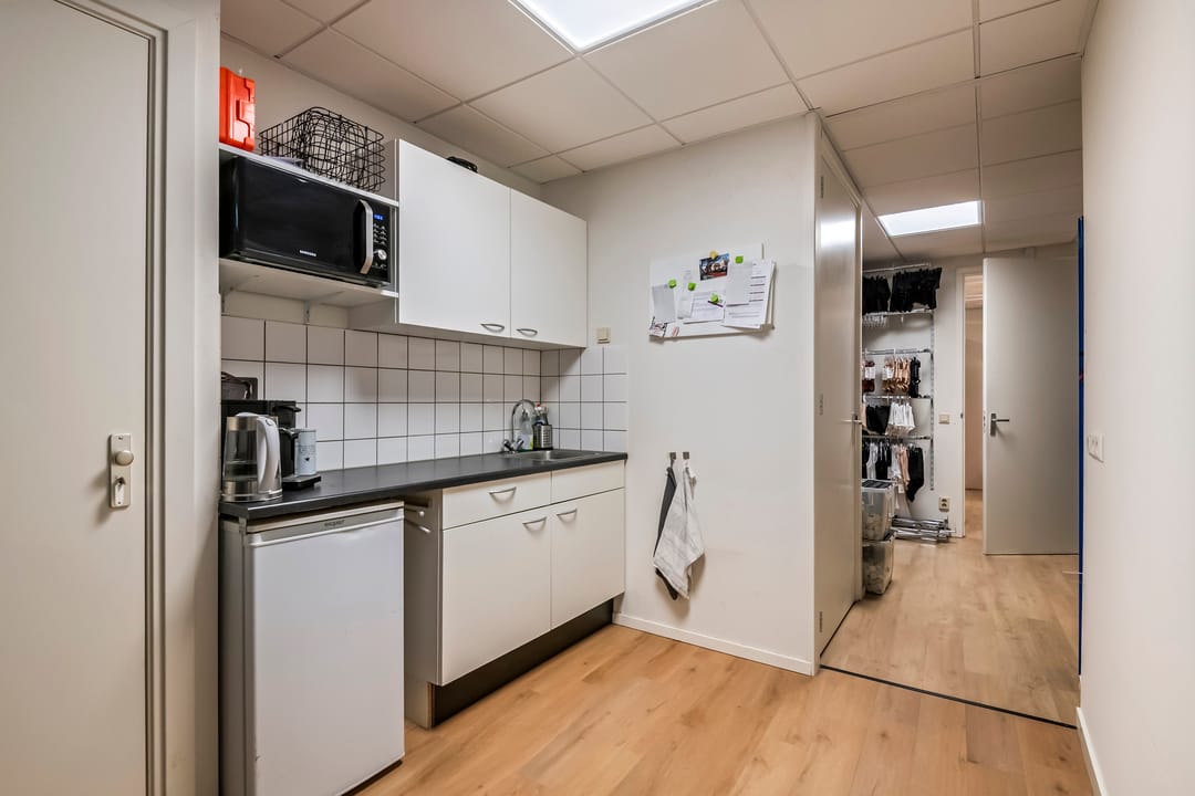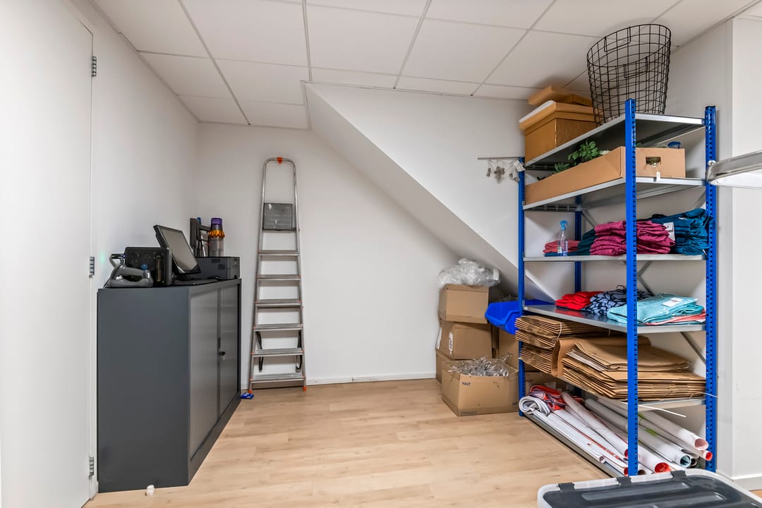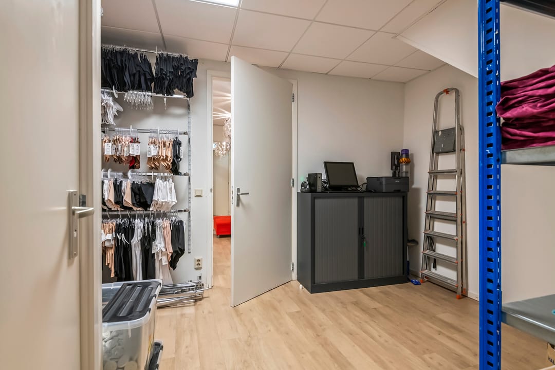 Begane grond: brede entree en etalage, winkelruimte, apart dagverblijf voor opslag met toilet, pantry en (nood)uitgang aan de achterzijde.