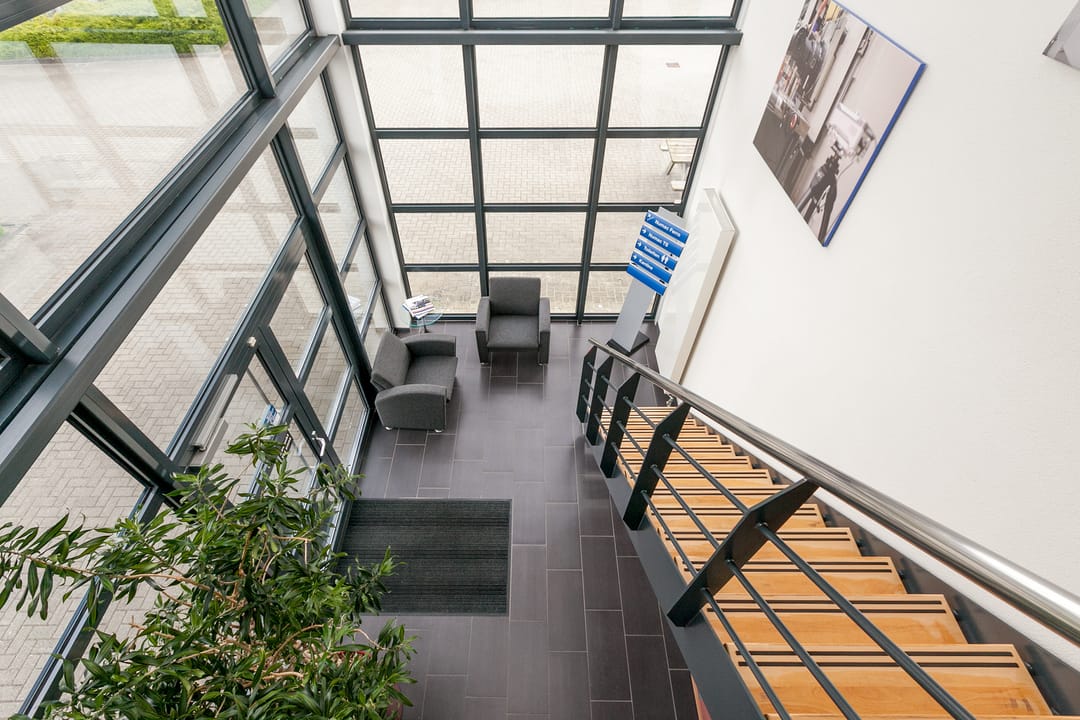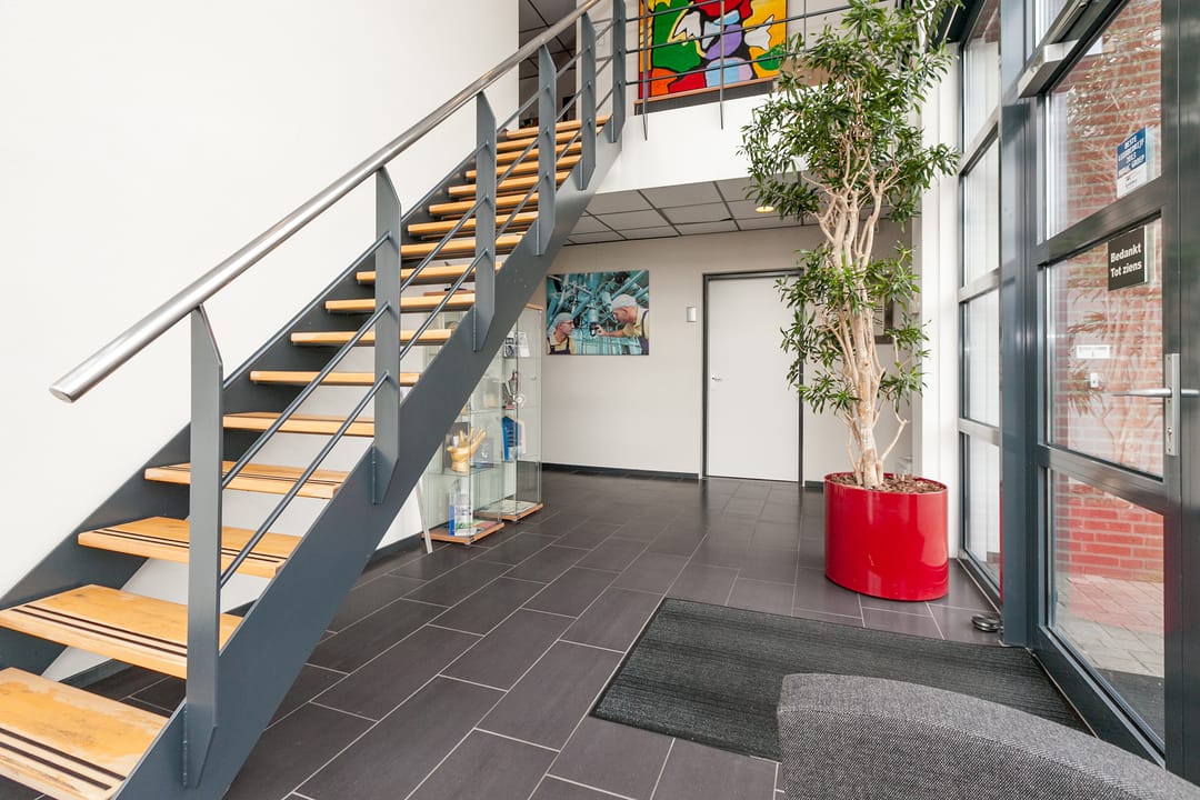 - Ontvangsthal voorzien van plavuizen met ontvangstbalie, open trap, vide en grote raampartijen die zorgen voor veel lichtinval