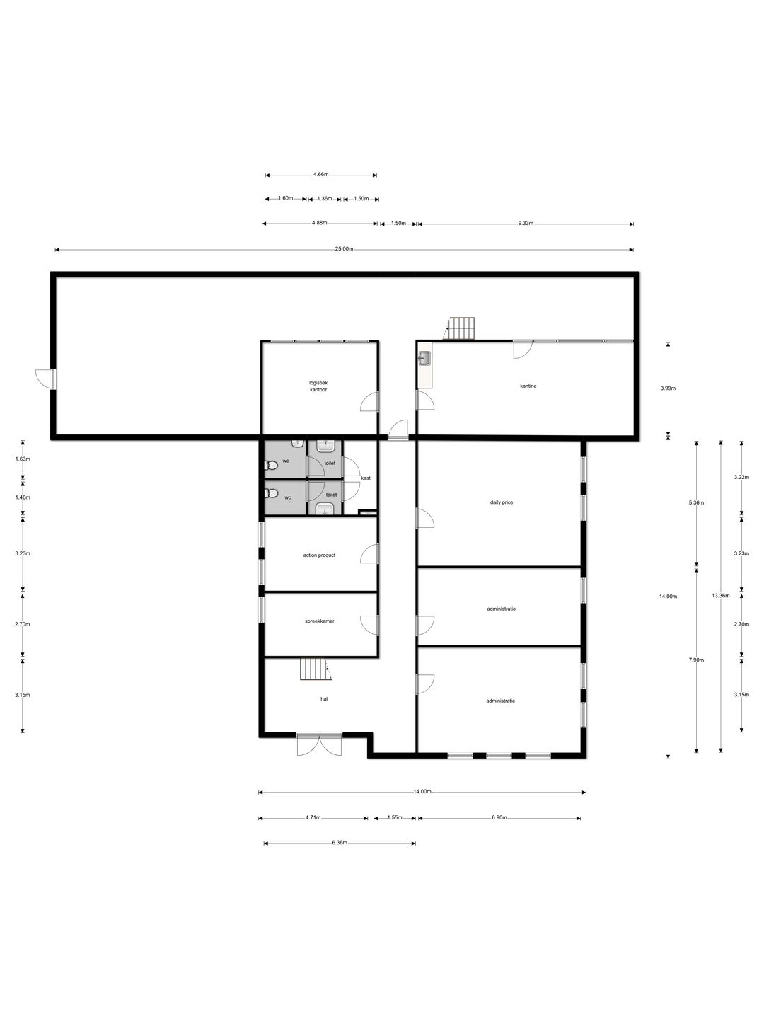 De achter gelegen bedrijfsruimte bestaat uit 2 delen en heeft een vloeroppervlakte van ca. 478 m² waarin begrepen een entresol van 63 m². Het kantooroppervlak bedraagt 396 m².