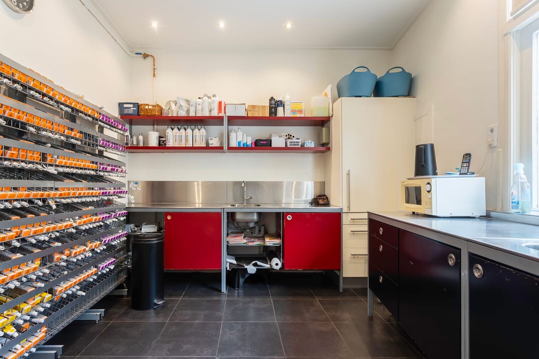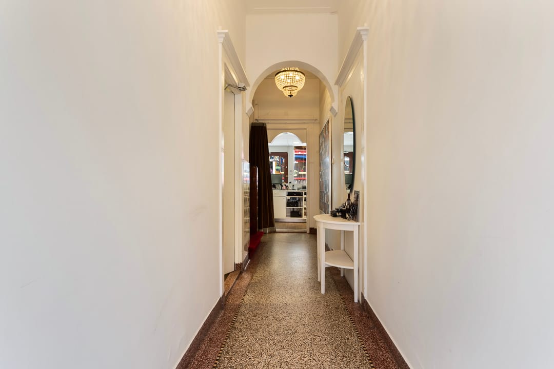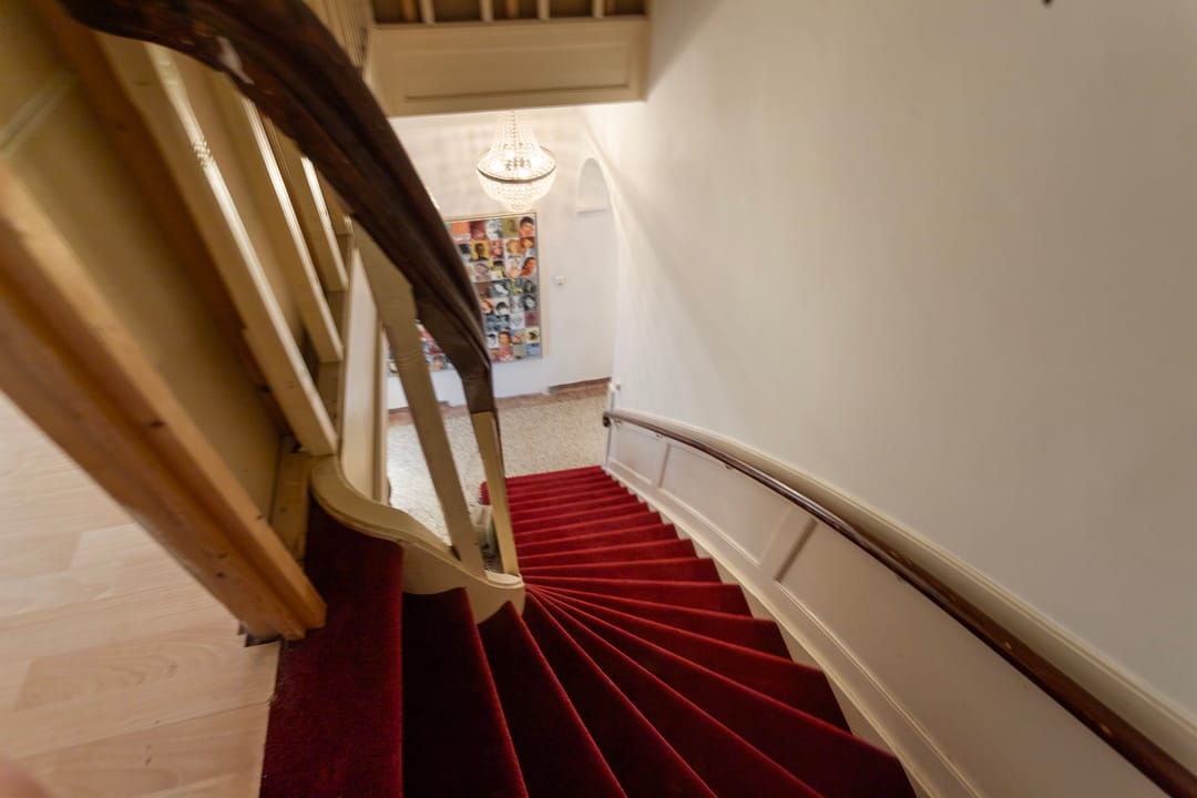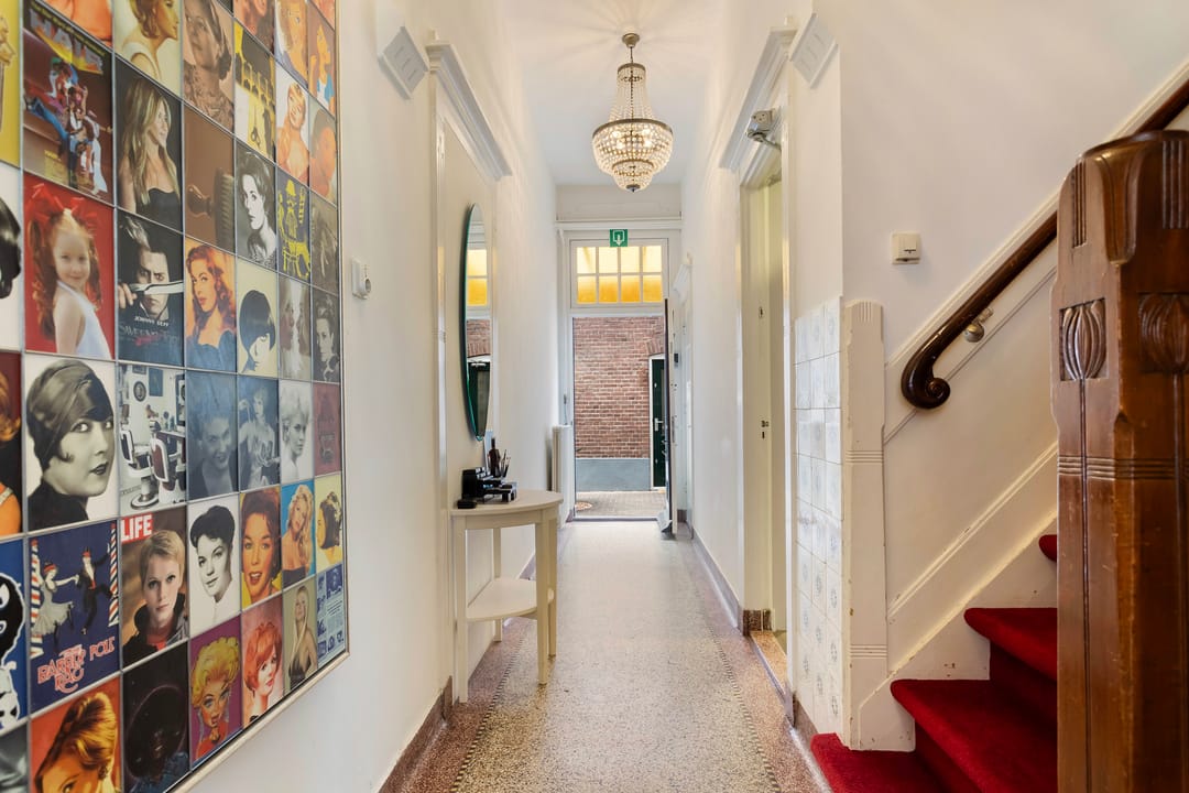 Entree, hal met garderode en opgang, diensttoilet, toegang naar bijkeuken voorzien van wasmachine-/drogeraansluitingen en CV-opstelling, personeelsverblijf met pantry.