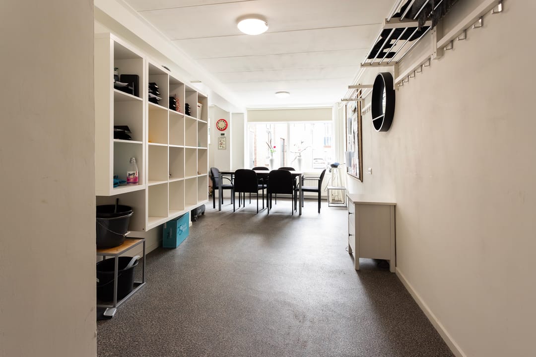 Begane grond: entree, speelse winkelruimte, gang, toilet, koffiekeuken annex magazijn, achteringang. Overdekte buitenruimte met afsluitbaar hek.