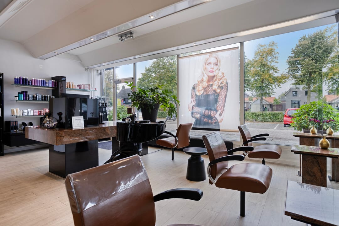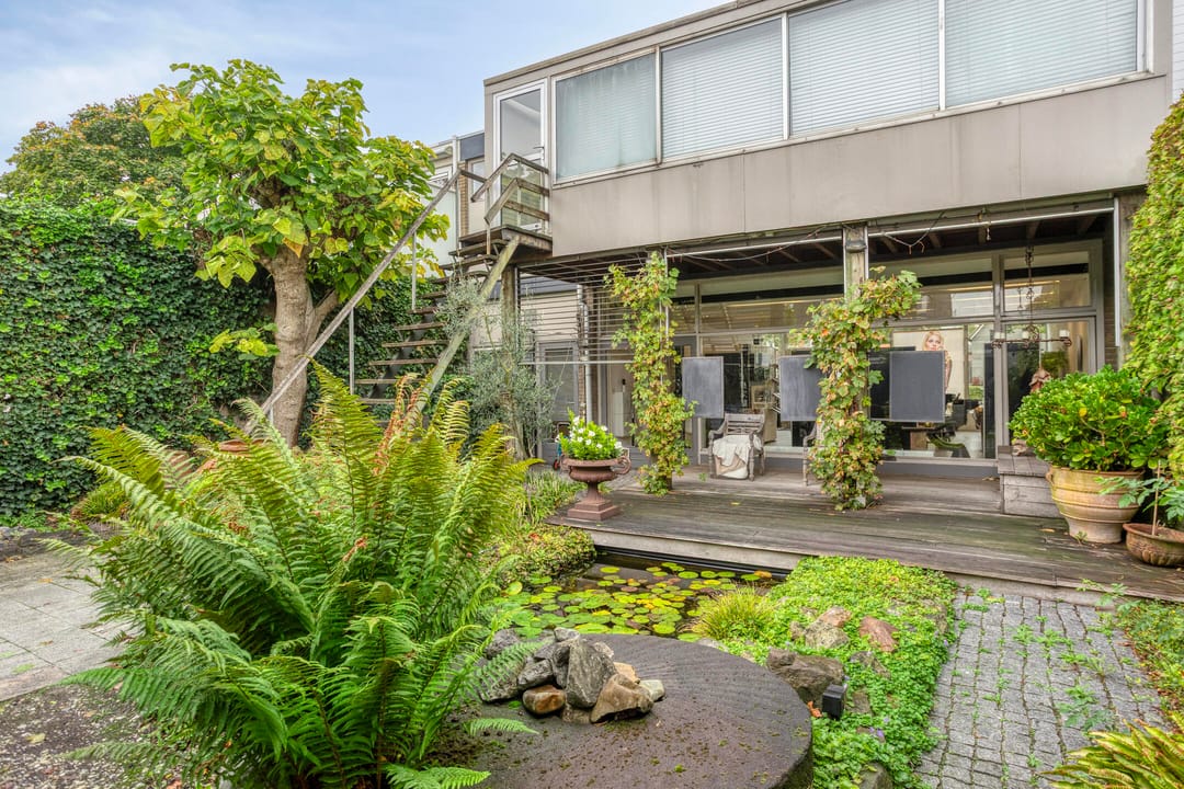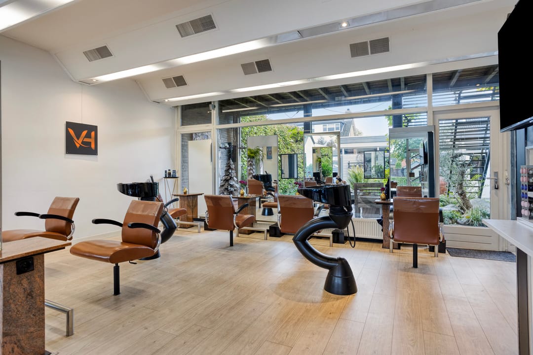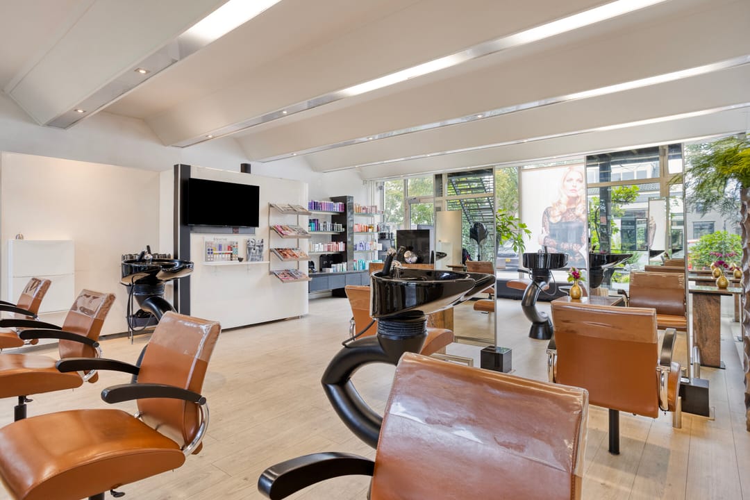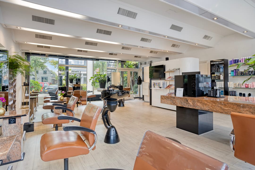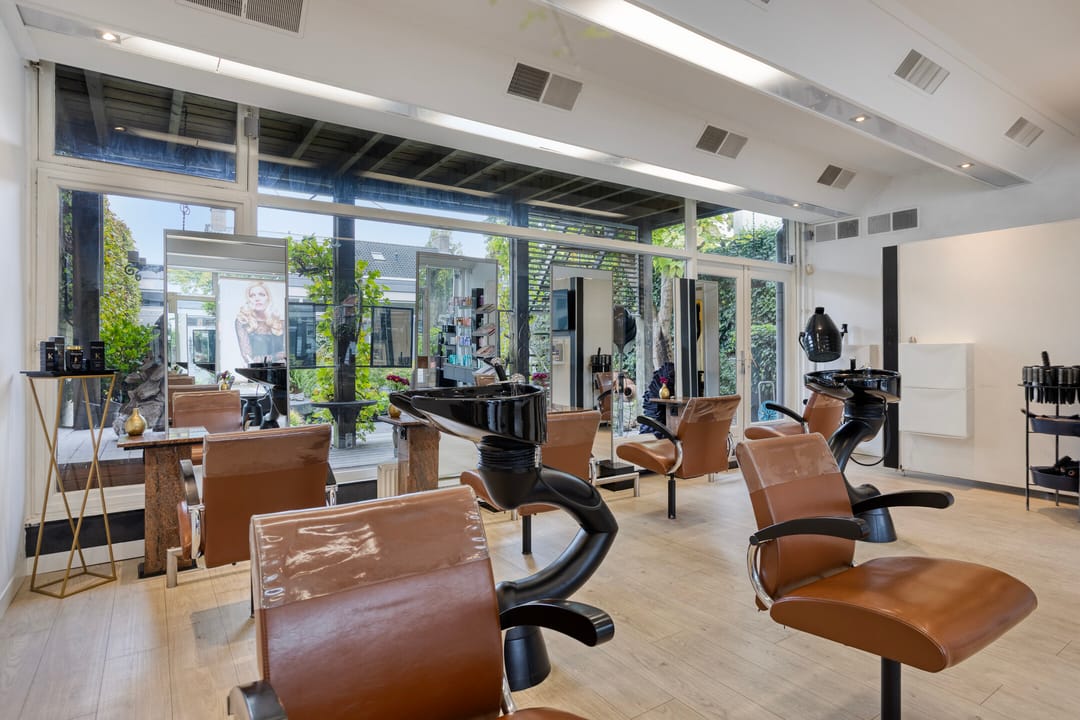 Op de begane grond is de kapsalon gesitueerd, met een verhuurbaar oppervlakte van circa 114 m². De ruimte is modern afgewerkt, met een stijlvolle vloer, geïntegreerde verlichting, airconditioning en luxe meubels. beschikt over een uitstekende lichtinval door de royale raampartijen aan de voorzijde. U heeft directe toegang tot de sfeervolle binnentuin met vijver waarachter de kantoorruimte en opslagruimte is gelegen.