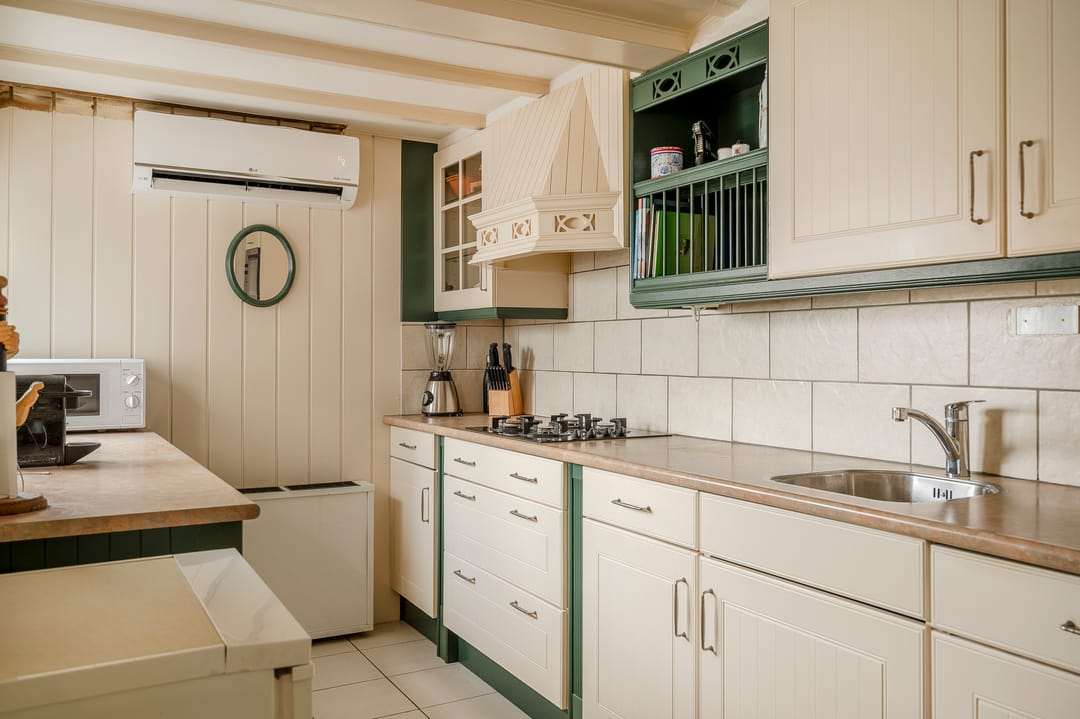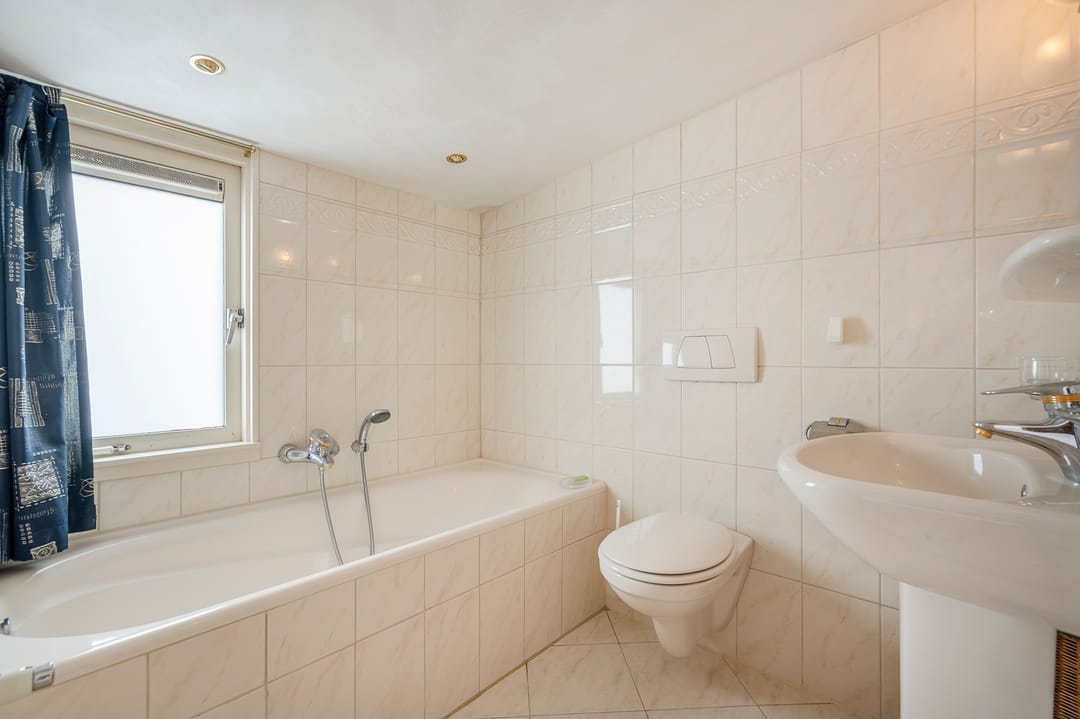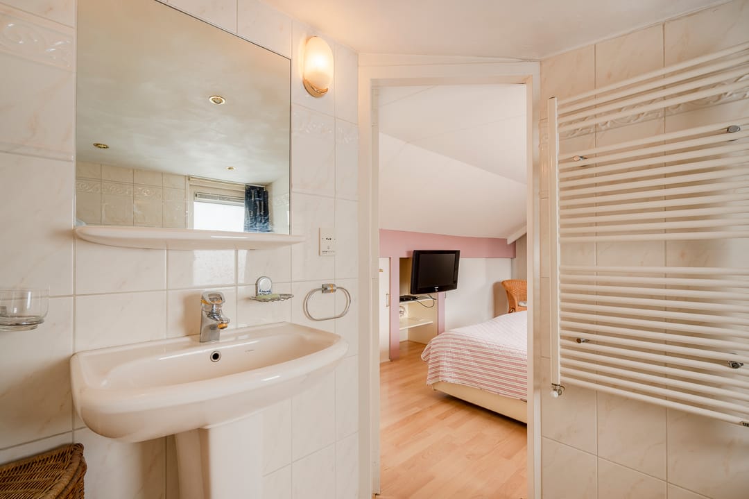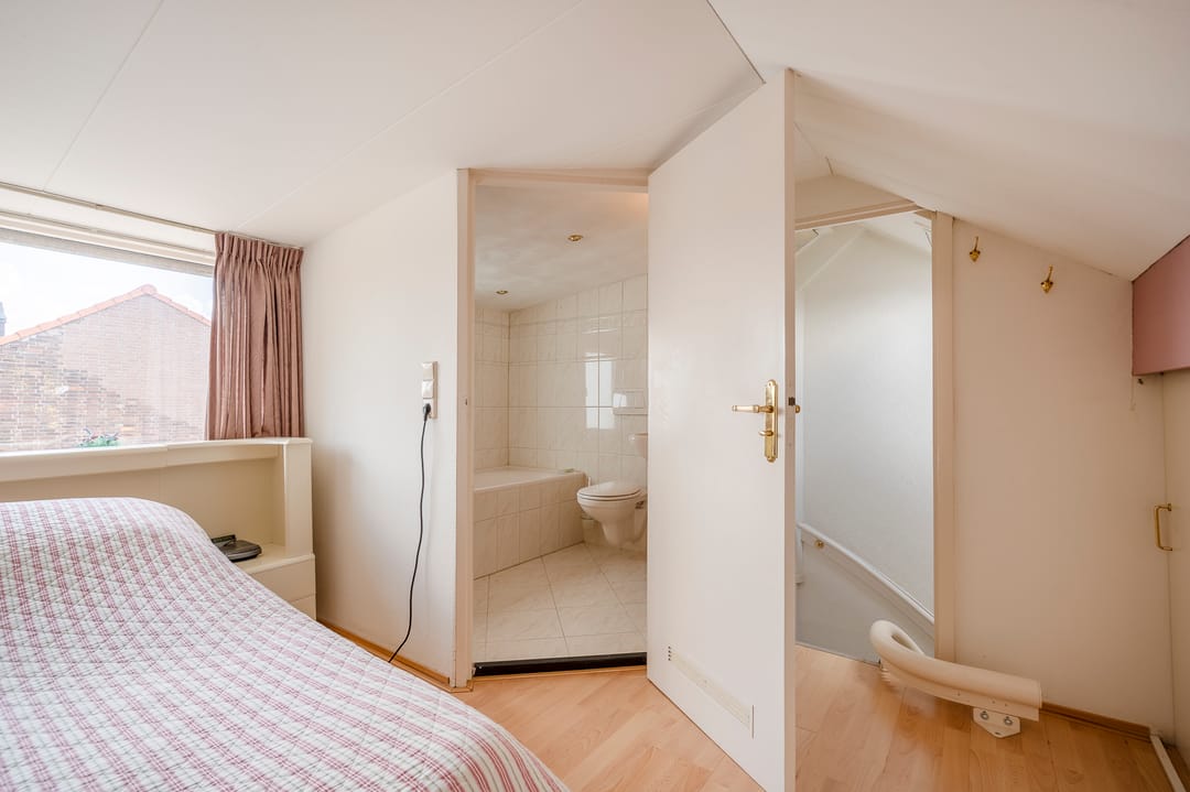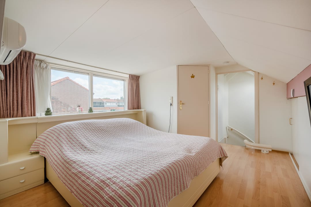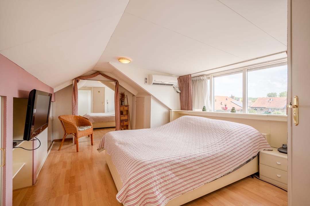 De royale slaapkamer is voorzien van een dakkapel en een airco-installatie, wat zorgt voor een optimale nachtrust tijdens de warme zomermaanden. De aangrenzende badkamer beschikt over een ligbad, wastafel en toilet.