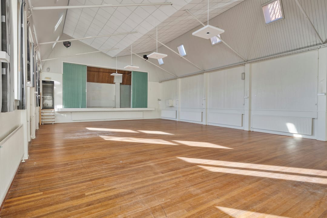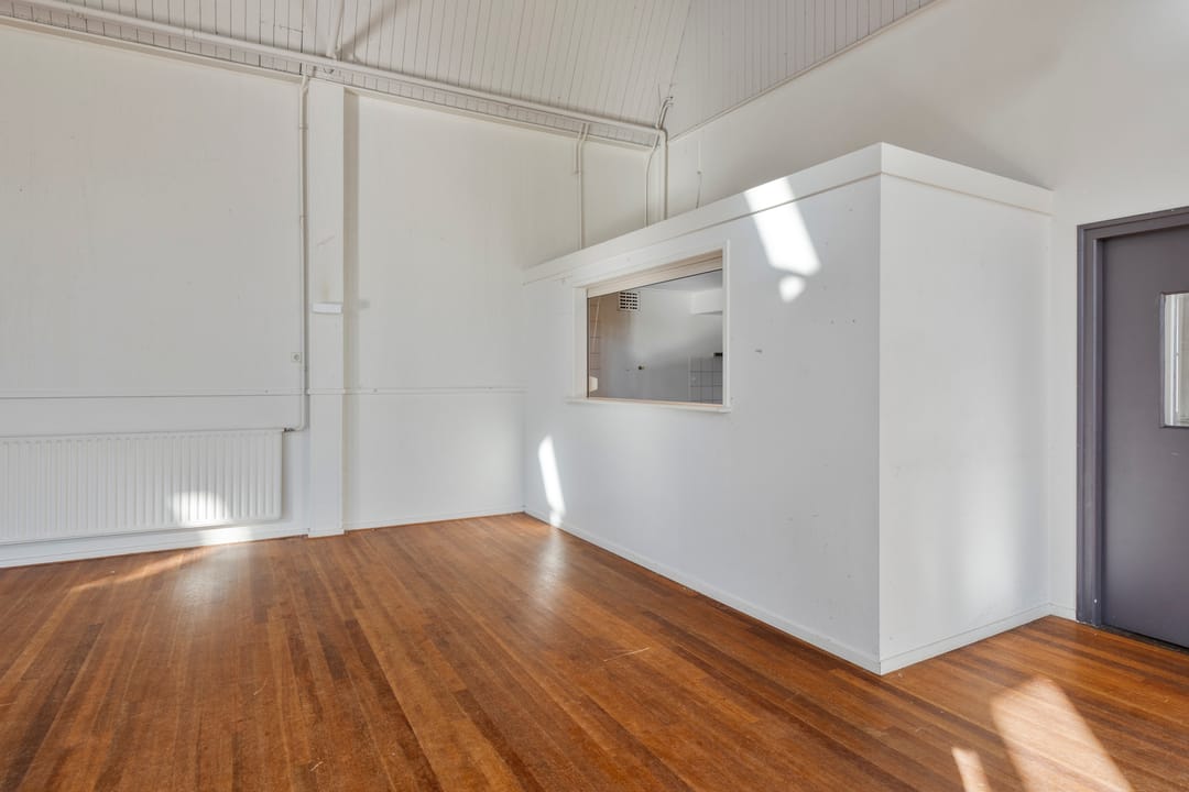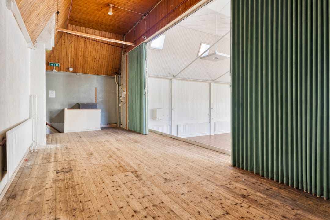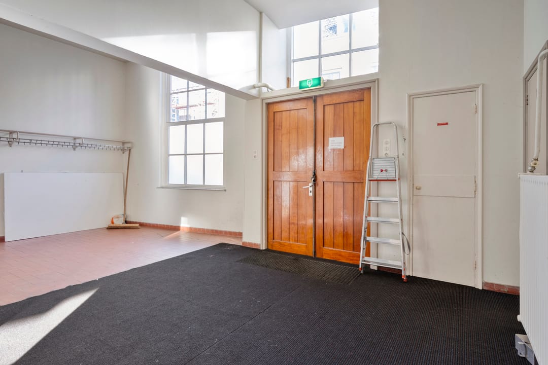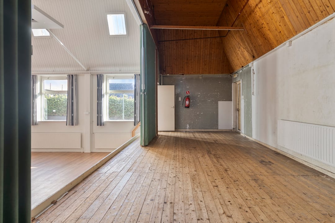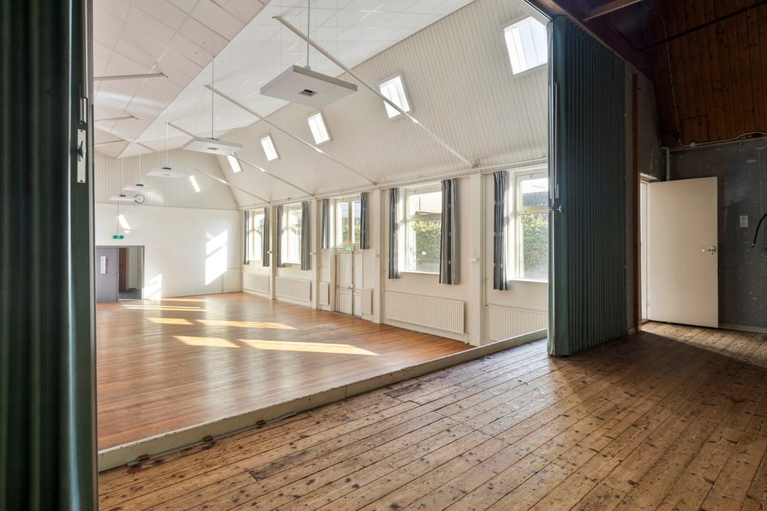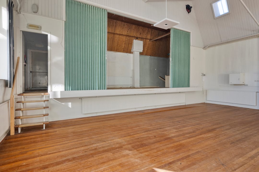 De zaal vormt het hart van het pand en kenmerkt zich door een prettige hoeveelheid daglicht, wat zorgt voor een open en aangename sfeer. De ruimte is voorzien van een extra toegangsdeur en beschikt over een ruim podium, waardoor de zaal uitstekend geschikt is voor bijeenkomsten, presentaties, optredens of andere groepsactiviteiten.