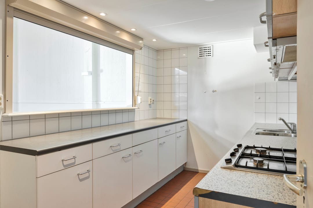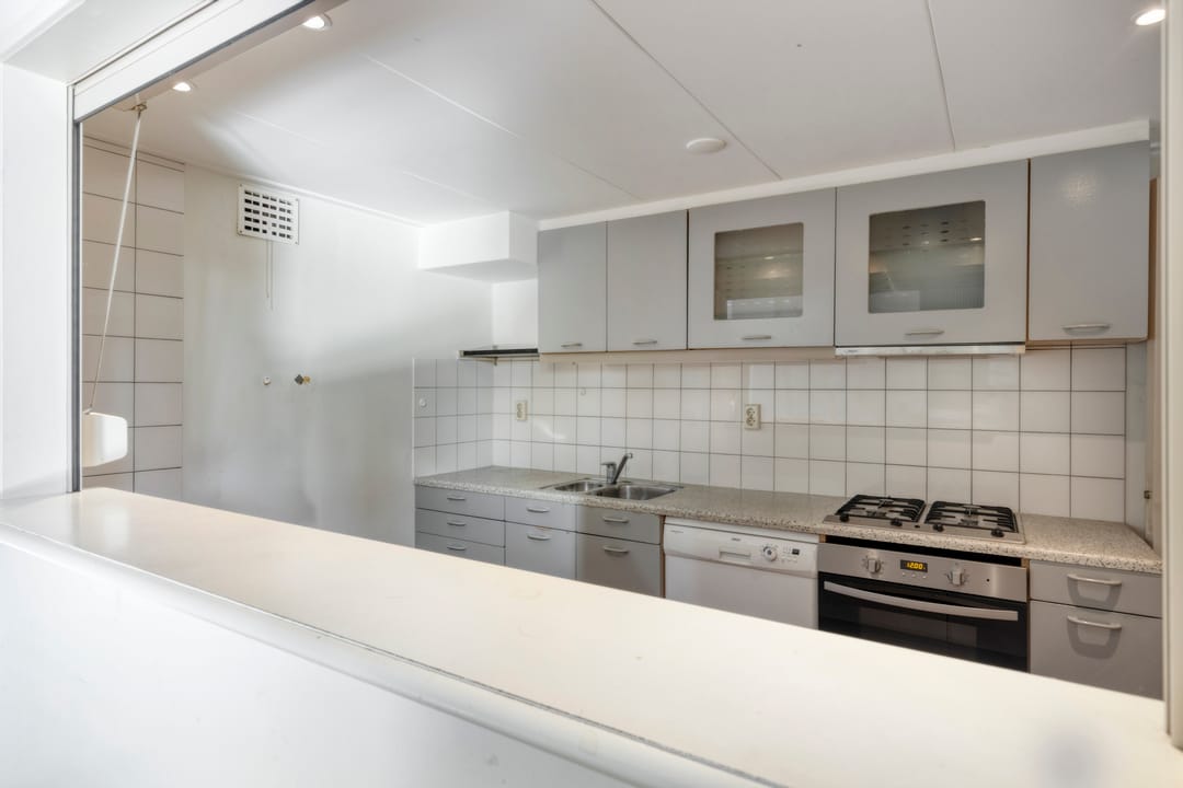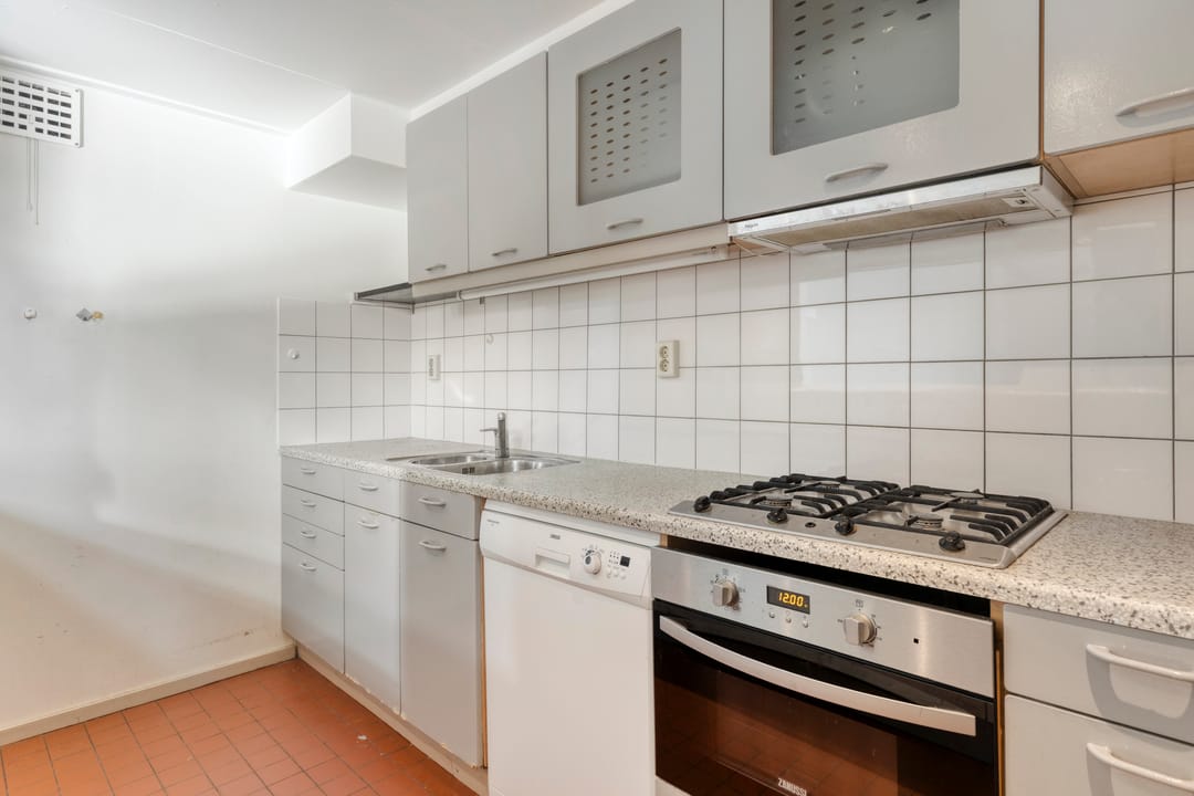 De keuken is praktisch ingericht en voorzien van een vierpits gaskookplaat en een vaatwasser. Vanuit de keuken is er zicht op de zaal, wat functioneel is bij gebruik tijdens evenementen of bijeenkomsten.