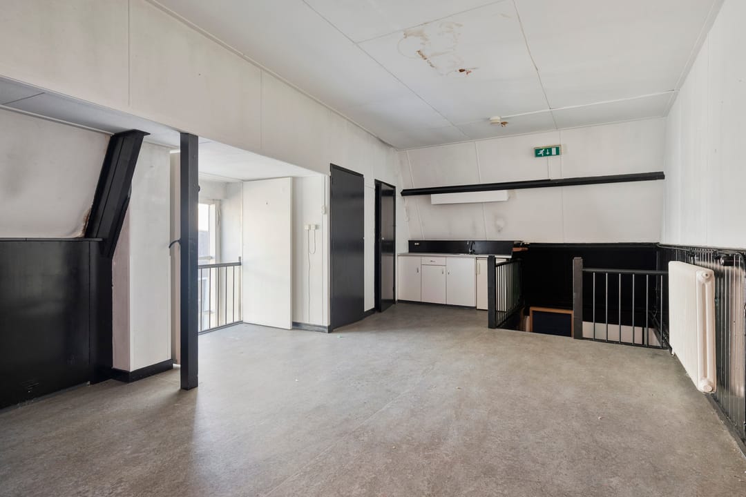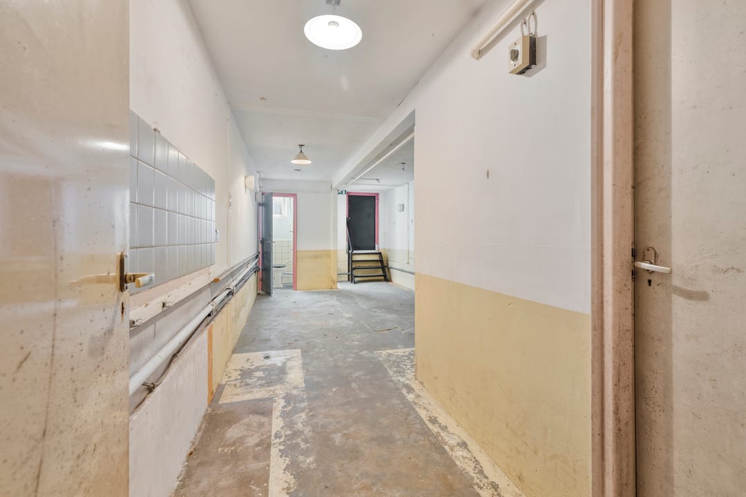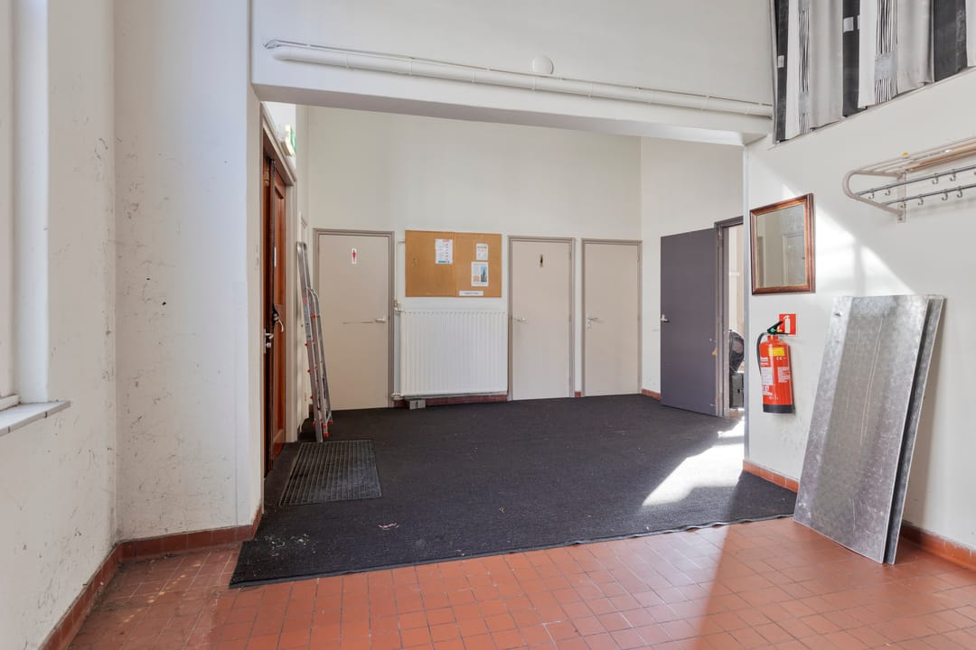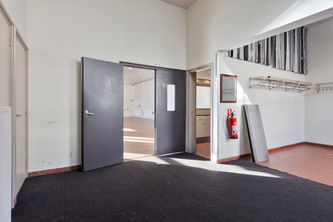 Het pand beschikt over een verhuurbare vloeroppervlakte van circa 286 m² en een bruto vloeroppervlakte van circa 344 m², waarmee het aanzienlijk ruimte biedt voor diverse gebruiksdoeleinden. Bij binnenkomst betreedt men een hal met garderobe die toegang geeft tot de toiletten en tevens fungeert als centrale verbindingsruimte binnen het pand. Vanuit deze hal zijn zowel de keuken als de grote zaal bereikbaar en bevindt zich de trap naar bovengelegen kantoorruimte.
