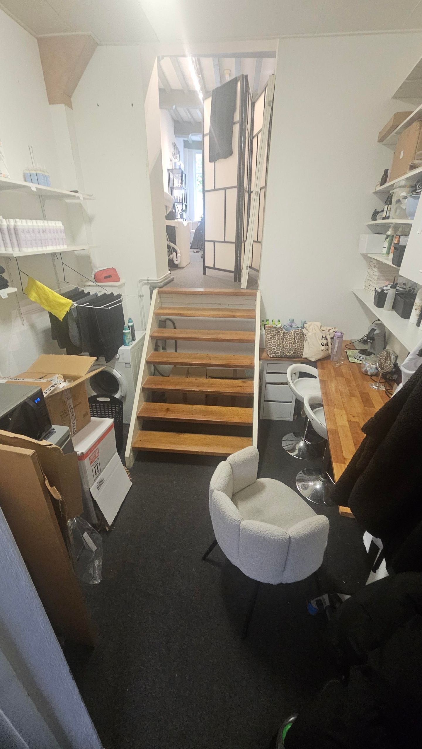 Entree, tochtportaal, grote winkel- of kantoorruimte voorzien van een nette antracietkleurige vloer, origineel balkenplafond en inbouwkast. Magazijn, pantry met cv-opstelling (Itho) en toilet met fonteintje.