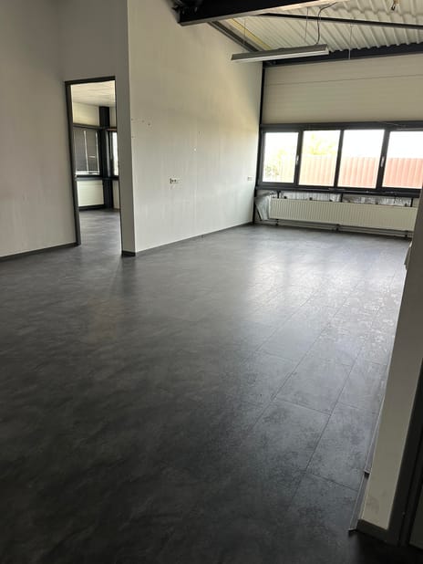 Ruim, hoge en lichte ontvangsthal, waaraan 2 kantoorruimten, de keuken, gescheiden nette toiletgroep en de trap naar de kantoorruimte op de eerste etage.