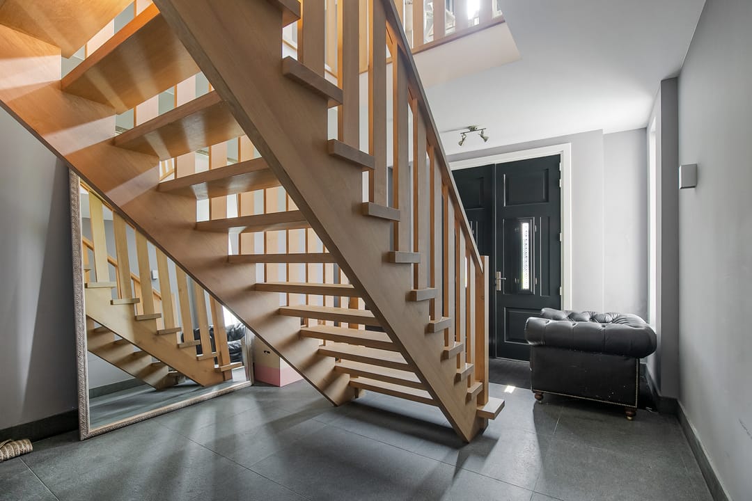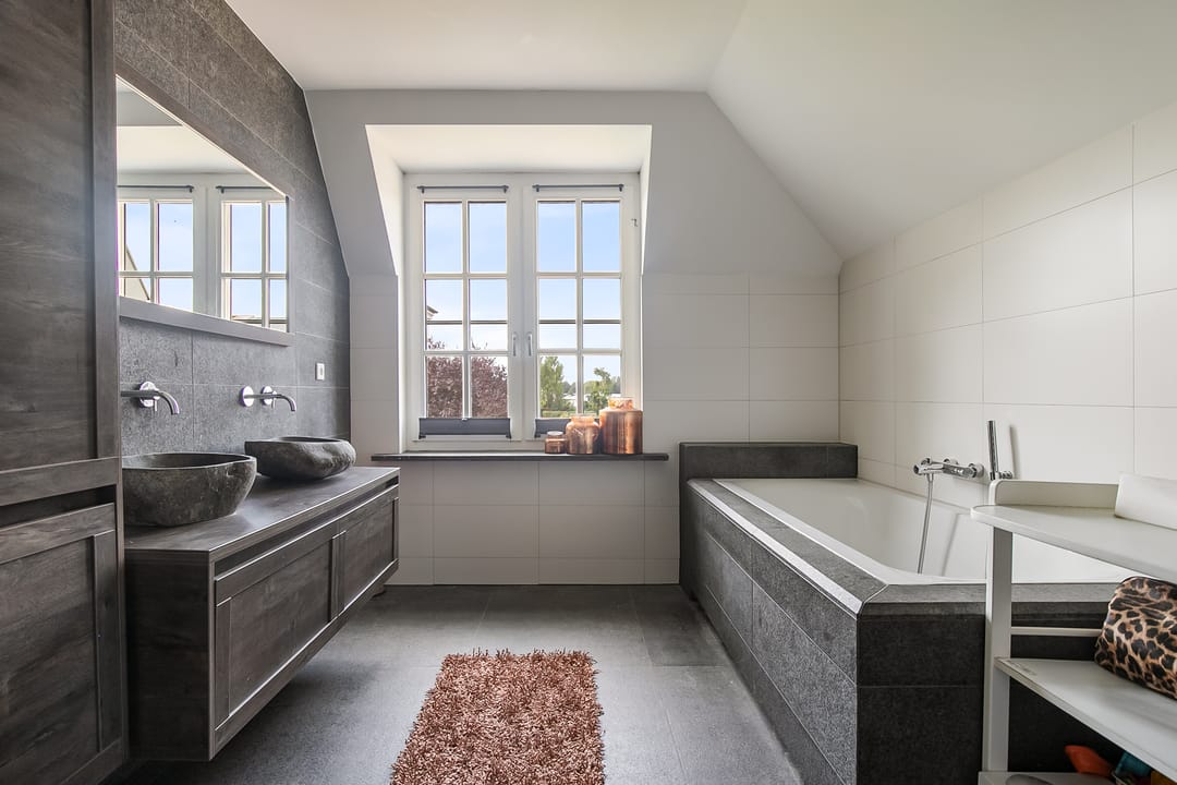 De royale overloop met vide biedt toegang tot 3 ruime slaapkamers, de badkamer, toiletruimte en de zolder. Ook is er toegang tot een charmant Frans balkon welke een fraai uitzicht biedt op de omgeving. De overloop en alle slaapkamers hebben dezelfde afwerking, natuurstenen vloer, stucwerk wanden en een stucwerk plafond.