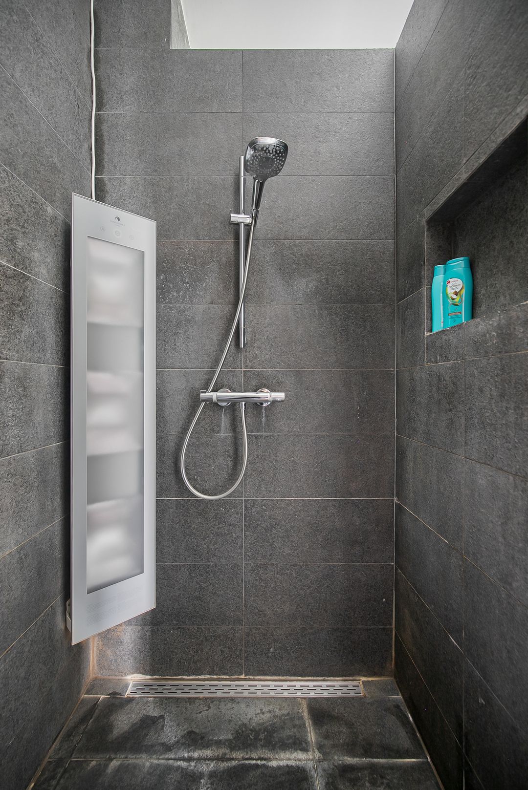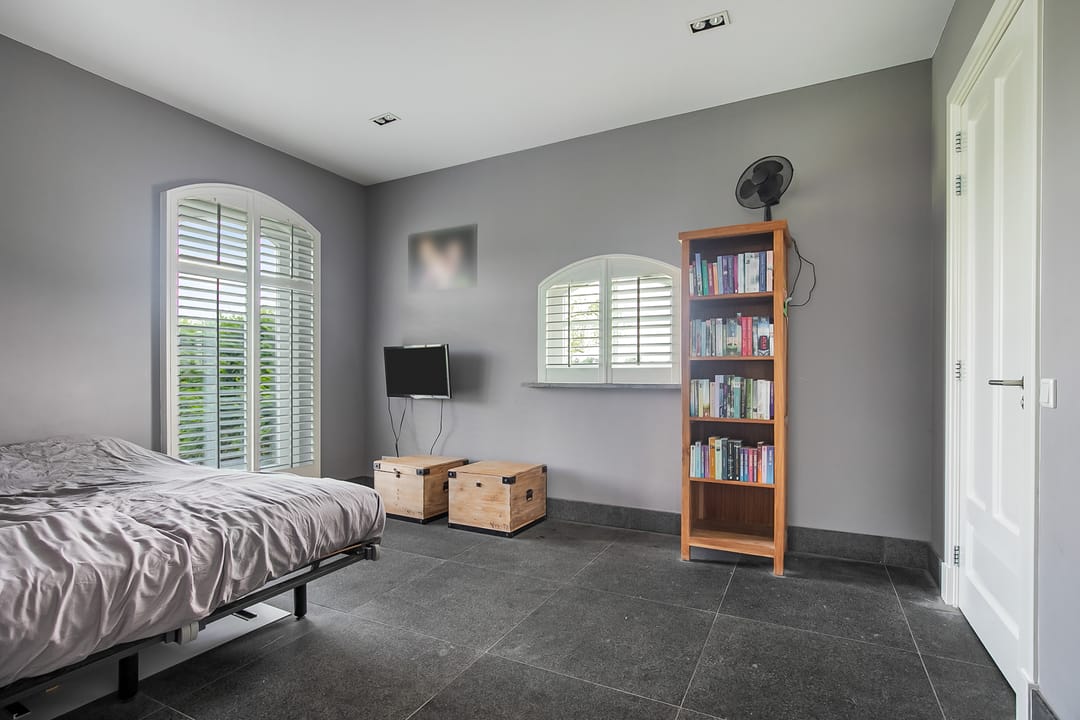 Vanuit de woonkamer is er toegang tot de logeerkamer. Deze slaapkamer is voorzien van een natuurstenen vloer, stucwerk wanden en een stucwerk plafond met inbouwverlichting. Vanuit deze kamer is er toegang tot de badkamer. Deze badkamer is afgewerkt met dezelfde natuurstenen vloer als in de rest van de ruimtes. De wanden en het plafond zijn voorzien van stucwerk. De badkamer is verder uitgerust met een ruime inloopdouche met sunshower, twee wastafels met meubel een zwevend toilet en een design radiator. Een raampartij zorgt voor natuurlijk lichtinval. Vanuit de badkamer loop je verder naar de masterbedroom.