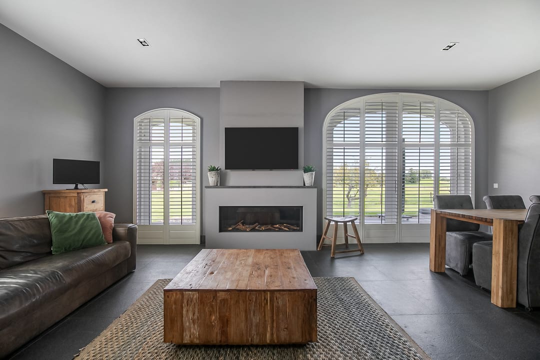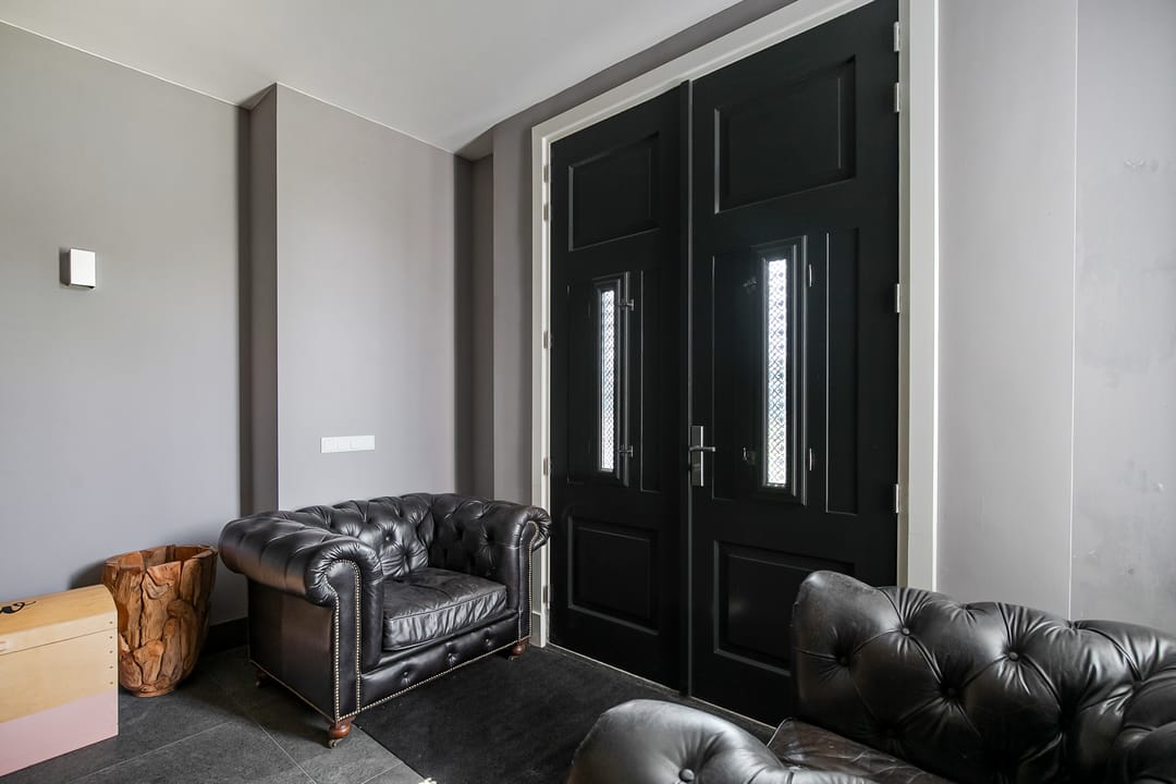 De overdekte entree met een dubbele openslaande voordeur, geeft deze villa een fraaie uitstraling. De ruime ontvangsthal met imposante houten trap biedt toegang tot de woonkamer en de 1e verdieping. De hal is voorzien van een natuurstenen tegelvloer, stucwerk wanden en een stucwerk plafond. De royale leefkeuken met eetkamergedeelte is voorzien van een natuurstenen tegelvloer, stucwerk wanden en een stucwerk plafond met inbouwverlichting. De keuken beschikt over een inrichting in een wandopstelling met apparatenwand en een kook- en spoeleiland. De apparatenwand is verder uitgerust met een oven, koffiezetapparaat, een stoomoven en een koelkast. Het eiland beschikt over een 5-pits gaskookplaat met ingebouwde afzuigkap in het plafond, een spoelbak en een vaatwasser. Diverse kastjes en lades zorgen voor veel opbergruimte. Een grote erker/uitbouw met openslaande deuren zorgen voor toegang naar de tuin. De vele raampartijen zorgen voor veel natuurlijke lichtinval. Een haard zorgt voor extra sfeer en warmte in de ruimte. Vanuit de woonkamer is er een fraai uitzicht op de paardenweides. En ook hier zorgen grote raampartijen en dubbele openslaande deuren voor een zee van licht. Daarnaast is er een prachtige, grote schouw aanwezig met een gashaard welke zorgt voor nog extra sfeer en warmte in de ruimte. Schuifdeuren zorgen dat de woonkamer afgesloten kan worden van de keuken/eetgedeelte. Halfronde openslaande deuren in de zijgevel van de woning zorgen voor toegang tot het voorhuis. De ruime entreehal biedt toegang tot de bijkeuken/wasruimte, woonkamer, toiletruimte en de meterkast. De bijkeuken/wasruimte is uitgerust met een gootsteen. Tevens zijn hier de aansluitingen voor de wasapparatuur gesitueerd. Vanuit hier is er toegang tot de kantoor/werkkamer. De kantoorruimte is een fijne ruimte welke uiteraard voor diverse doeleinden geschikt is, zoals bijvoorbeeld een speelkamer of chillroom.