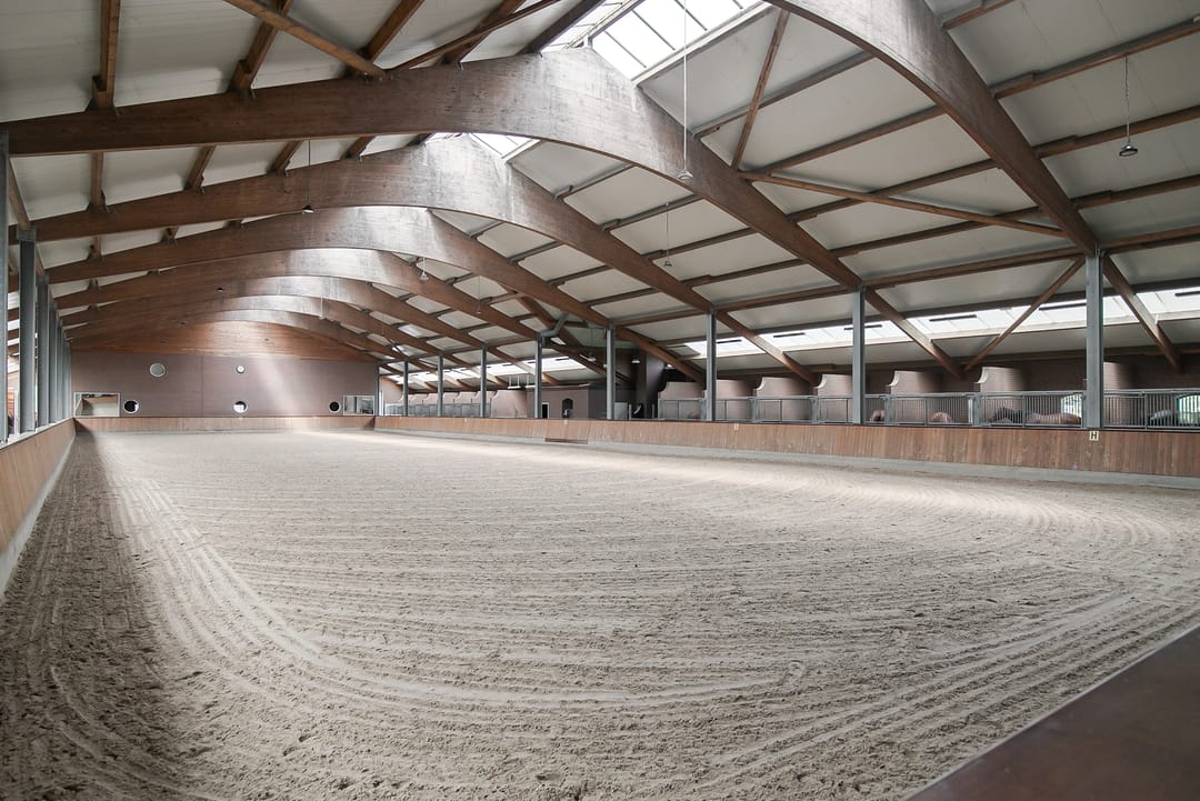 De rijhal is opgetrokken uit metselwerk gevels met spanten. Een lichtstraat in de nok en boven de paardenboxen zorgt voor veel natuurlijke lichtinval. Openslaande deuren in de voorgevel zorgen voor toegang.