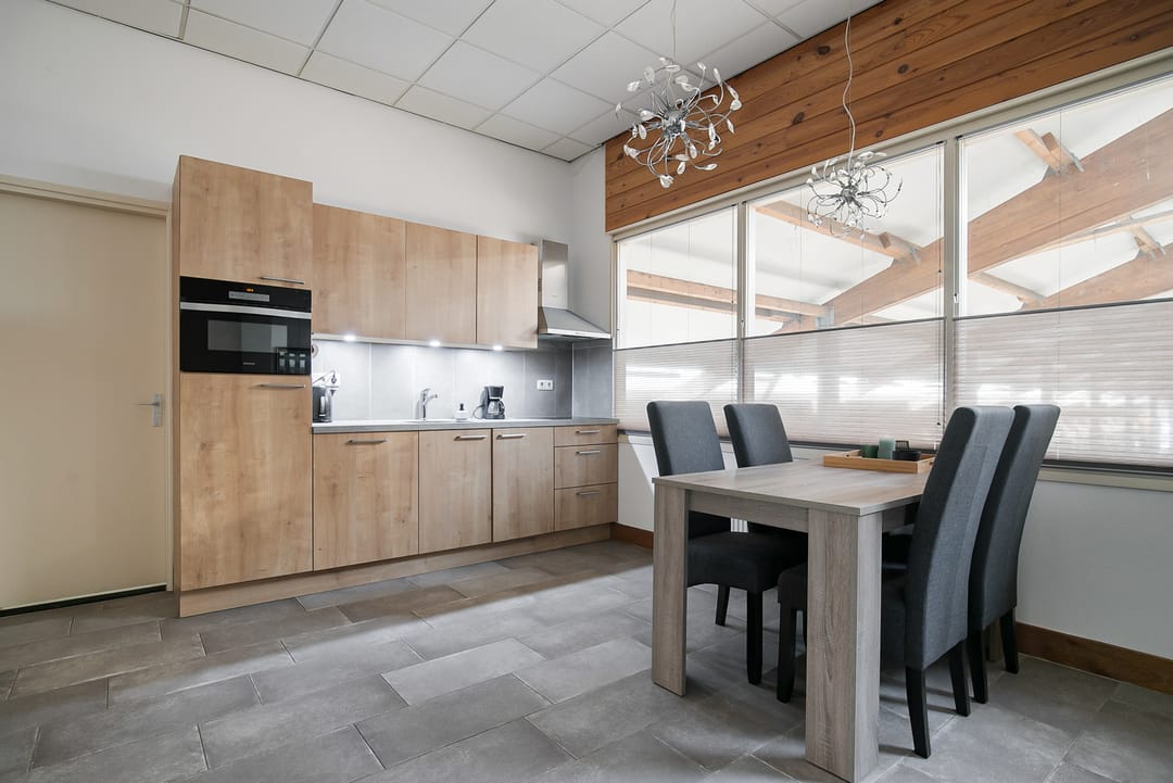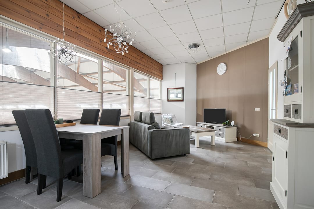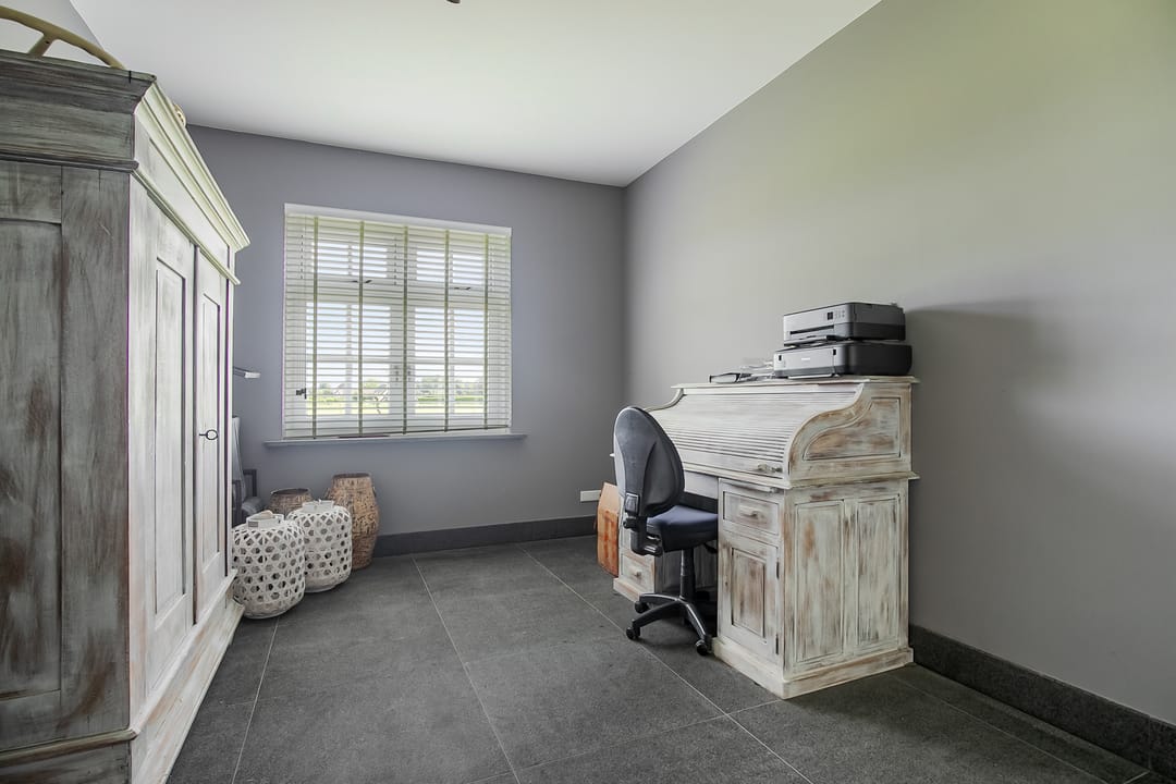 De hal biedt toegang tot de woonkamer, bijkeuken, toiletruimte en de vaste trapopgang tot de zolderruimte op de 1e verdieping. In de trapkast is de unit voor de vloerverwarming gesitueerd. De toiletruimte is deels betegeld en verder voorzien van een zwevend toilet en een fonteintje. De praktische bijkeuken is uitgerust met een op maat gemaakt keukenblok. De aansluitingen voor de wasapparatuur zijn hier gesitueerd. Ook is er vanuit hier toegang tot de meterkast. Een loopdeur zorgt vanuit de bijkeuken voor toegang tot de bijkeuken/wasruimte van het voorhuis. De sfeervolle woonkamer met open keuken is voorzien van een natuurstenen vloer, stucwerk wanden en een stucwerk plafond met inbouwverlichting. Drie stuks dubbele openslaande deuren en een grote raampartij voorzien van fraaie en praktische shutters zorgen voor veel natuurlijke lichtinval. Een fraaie schouw met gashaard zorgt voor extra sfeer en warmte in de ruimte. De keuken beschikt over een inrichting in een wandopstelling met apparatenwand en een kook- en spoeleiland. De apparatenwand is verder uitgerust met een combioven, koffiezetapparaat, een koelkast en een vriezer. Het eiland beschikt over een 4-pits gaskookplaat met wokbrander en ingebouwde afzuigkap in het plafond, een spoelbak en een vaatwasser. Diverse kastjes en lades zorgen voor veel opbergruimte. Vanuit de woonkamer is er toegang tot de logeerkamer. Deze slaapkamer is voorzien van een natuurstenen vloer, stucwerk wanden en een stucwerk plafond met inbouwverlichting. Vanuit deze kamer is er toegang tot de badkamer. Deze badkamer is afgewerkt met dezelfde natuurstenen vloer als in de rest van de ruimtes. De wanden en het plafond zijn voorzien van stucwerk. De badkamer is verder uitgerust met een ruime inloopdouche met sunshower, twee wastafels met meubel een zwevend toilet en een design radiator. Een raampartij zorgt voor natuurlijk lichtinval. Vanuit de badkamer loop je verder naar de masterbedroom. Deze masterbedroom is uitgerust met praktische vaste kastenwand, welke zorgt voor veel opbergruimte. Een raampartij zorgt ook hier voor natuurlijke lichtinval.
