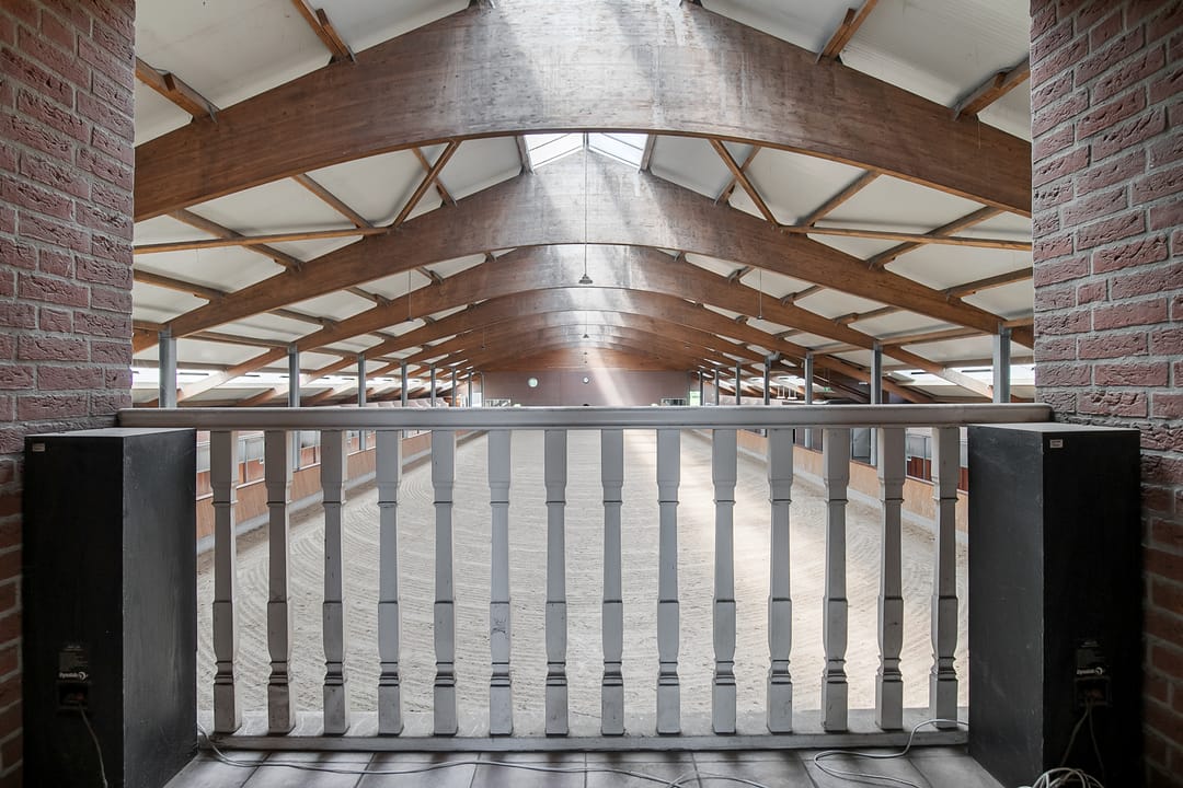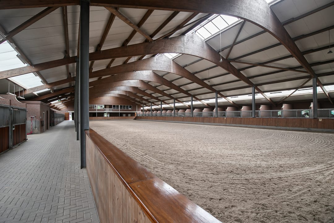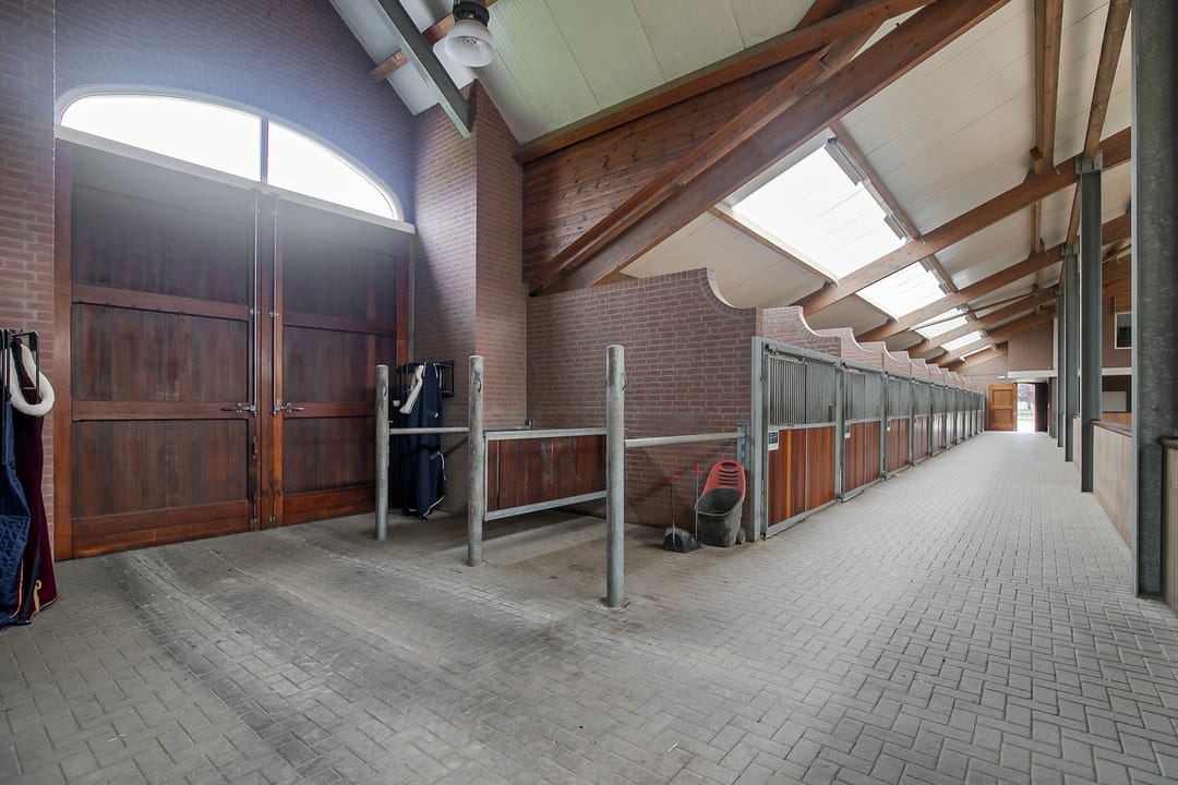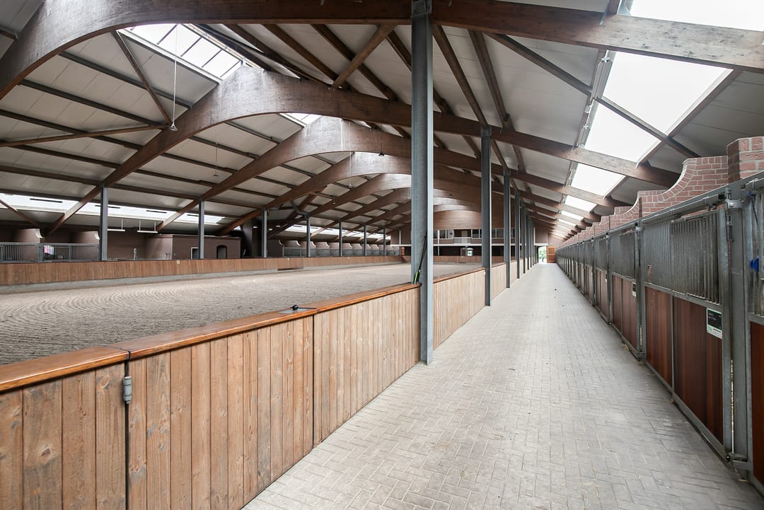De hal aan de voorzijde van de rijhal is voorzien van een beklinkerde vloer en biedt toegang tot een berging, toiletruimtes, wasruimte en een winkelruimte. Een bordestrap biedt toegang tot de 1e verdieping. Hier is de ontvangstruimte en een appartement gesitueerd. De ontvangstruimte is voorzien van een tegelvloer, stucwerk wanden en een systeemplafond. Er is een keukenblok en een bar aanwezig. Openslaande deuren bieden toegang tot een balkon aan de voorzijde van de rijhal. Grote raampartijen bieden een fraai uitzicht op de binnenpiste en de stallen. Ook is er vanuit de ontvangstruimte toegang tot een balkon boven de binnenpiste.Het appartement is uitgerust met een woonkamer met open keuken, 2 slaapkamers en een ruime badkamer. Het appartement is voorzien van een tegelvloer. Het keukenblok beschikt over een spoelbak, inductiekookplaat, vaatwasser, koelkast en een combimagnetron. De badkamer is geheel betegeld en verder voorzien van een doucheruimte, wastafel met meubel en een zwevend toilet. Achter een praktische schuifwand is een wasruimte gesitueerd. De binnenpiste (ca. 21x61 mtr.) is voorzien van een professionele bodem (Ben Agterberg), een fraaie hardhouten bakrand. Gewelfde houten spanten zorgen voor extra sfeer. Een lichtstraat in de nok zorgt voor fraai natuurlijke lichtinval. Ook is er LED-verlichting aanwezig. De 39 paardenboxen zijn verdeeld over twee stallengangen.
