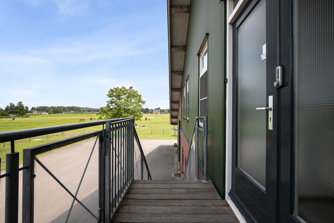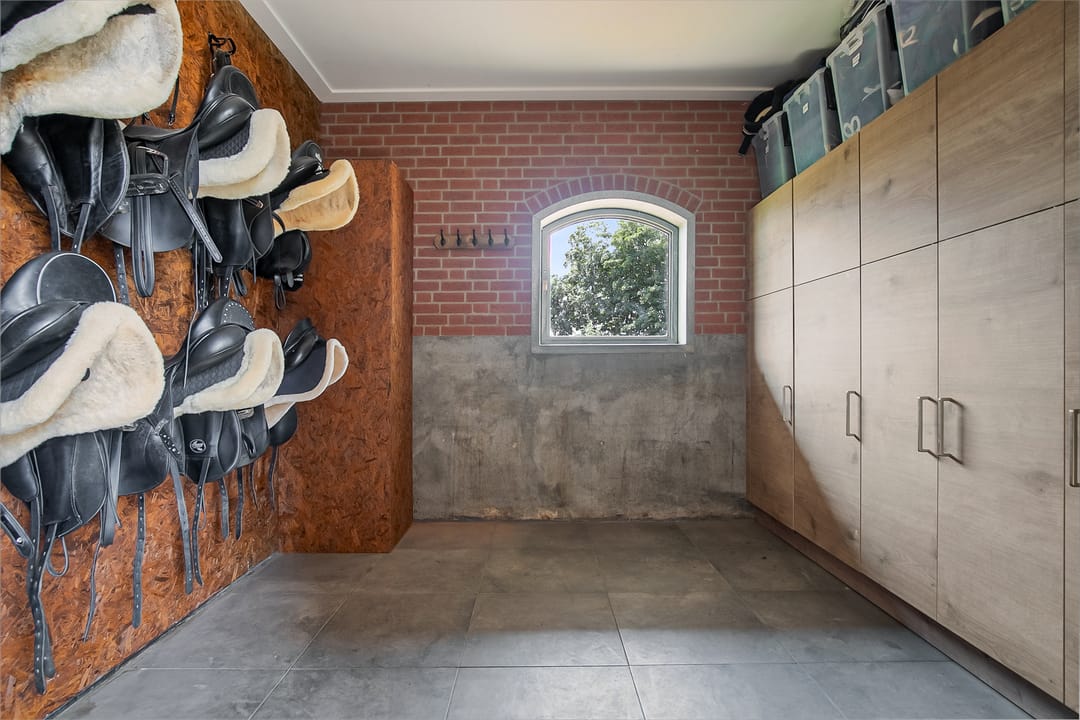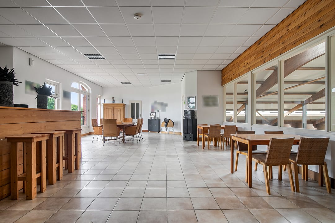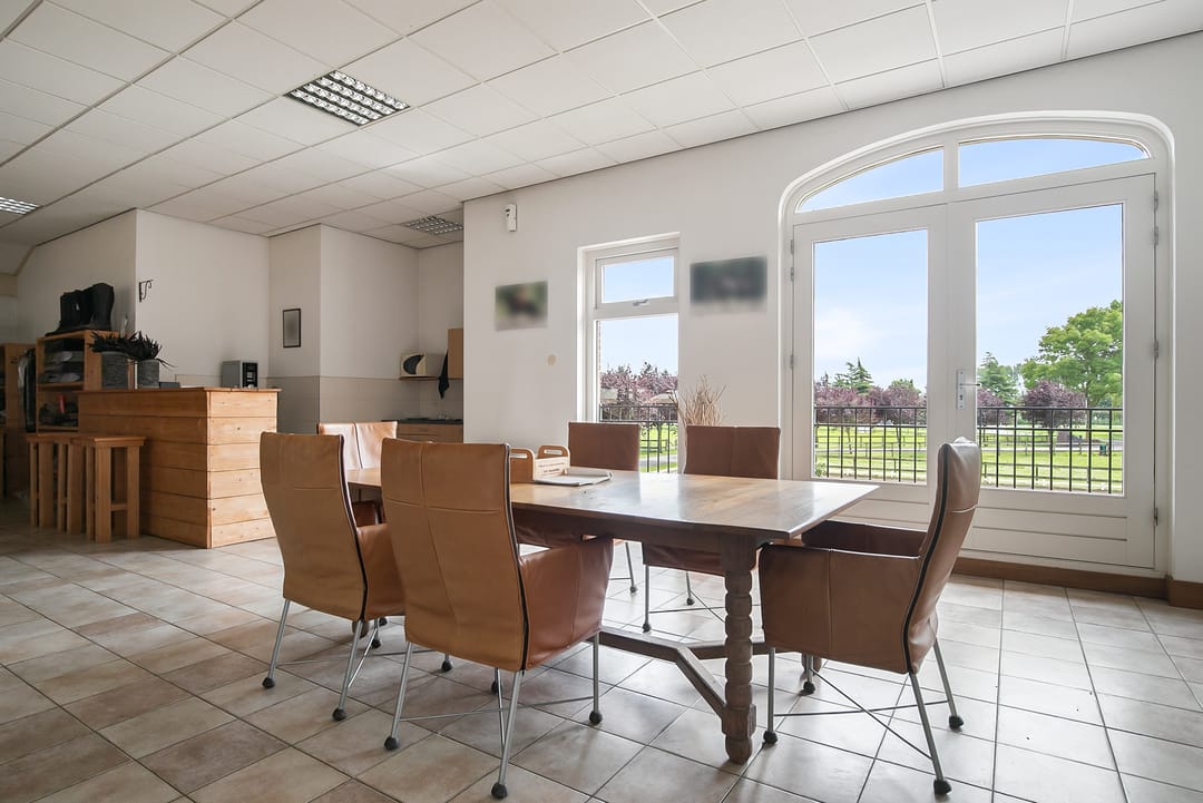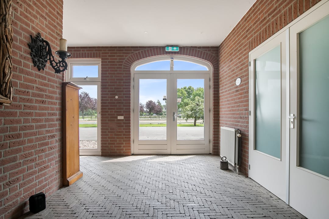De hal aan de voorzijde van de rijhal is voorzien van een beklinkerde vloer en biedt toegang tot een berging, toiletruimtes, wasruimte en een winkelruimte. Een bordestrap biedt toegang tot de 1e verdieping. Hier is de ontvangstruimte en een appartement gesitueerd. De ontvangstruimte is voorzien van een tegelvloer, stucwerk wanden en een systeemplafond. Er is een keukenblok en een bar aanwezig. Openslaande deuren bieden toegang tot een balkon aan de voorzijde van de rijhal. Grote raampartijen bieden een fraai uitzicht op de binnenpiste en de stallen. Ook is er vanuit de ontvangstruimte toegang tot een balkon boven de binnenpiste.Het appartement is uitgerust met een woonkamer met open keuken, 2 slaapkamers en een ruime badkamer. Het appartement is voorzien van een tegelvloer. Het keukenblok beschikt over een spoelbak, inductiekookplaat, vaatwasser, koelkast en een combimagnetron. De badkamer is geheel betegeld en verder voorzien van een doucheruimte, wastafel met meubel en een zwevend toilet. Achter een praktische schuifwand is een wasruimte gesitueerd. De binnenpiste (ca. 21x61 mtr.) is voorzien van een professionele bodem (Ben Agterberg), een fraaie hardhouten bakrand. Gewelfde houten spanten zorgen voor extra sfeer. Een lichtstraat in de nok zorgt voor fraai natuurlijke lichtinval. Ook is er LED-verlichting aanwezig. De 39 paardenboxen zijn verdeeld over twee stallengangen.