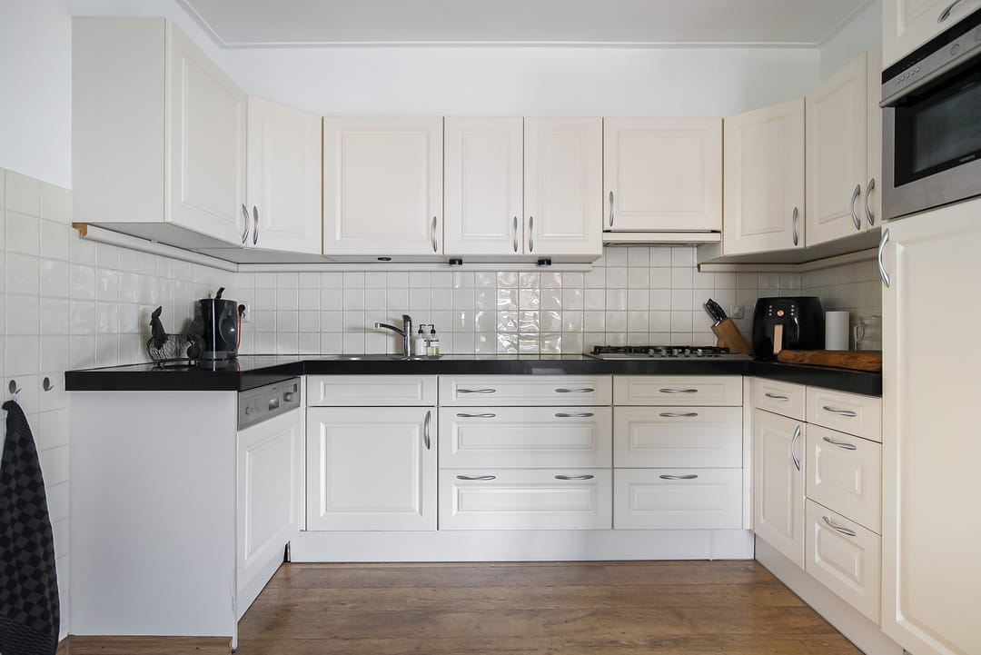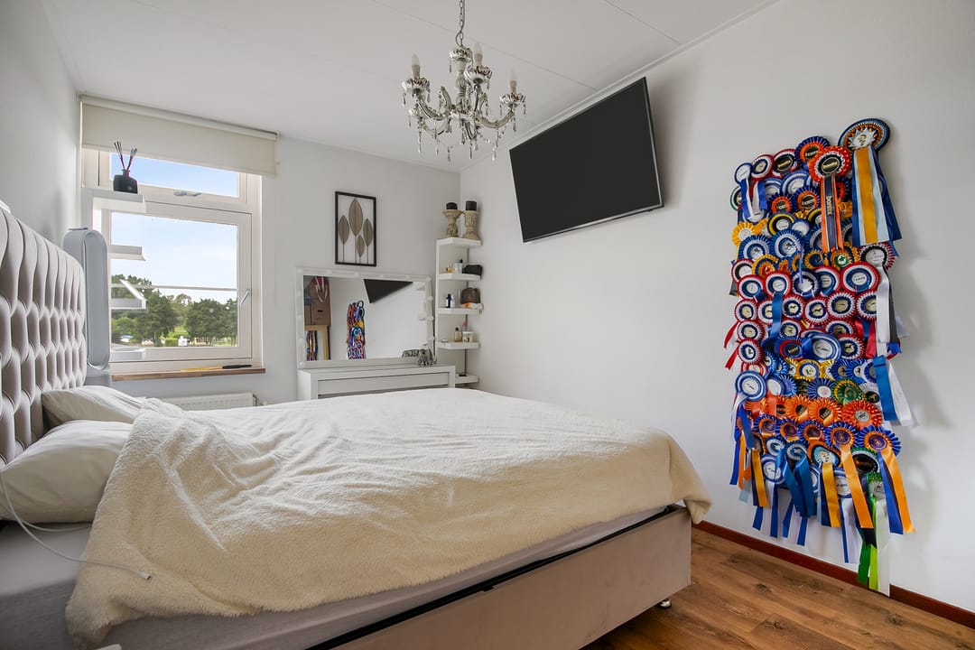 Deze masterbedroom is uitgerust met praktische vaste kastenwand, welke zorgt voor veel opbergruimte. Een raampartij zorgt ook hier voor natuurlijke lichtinval.