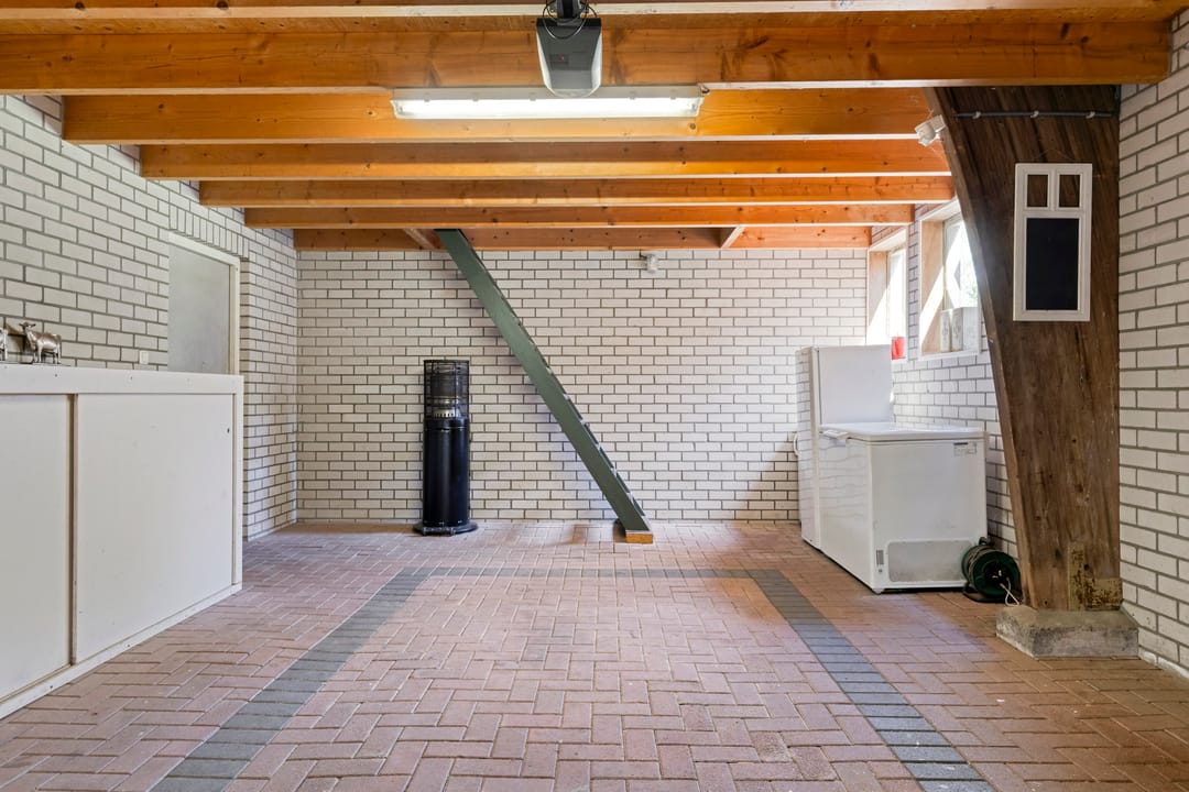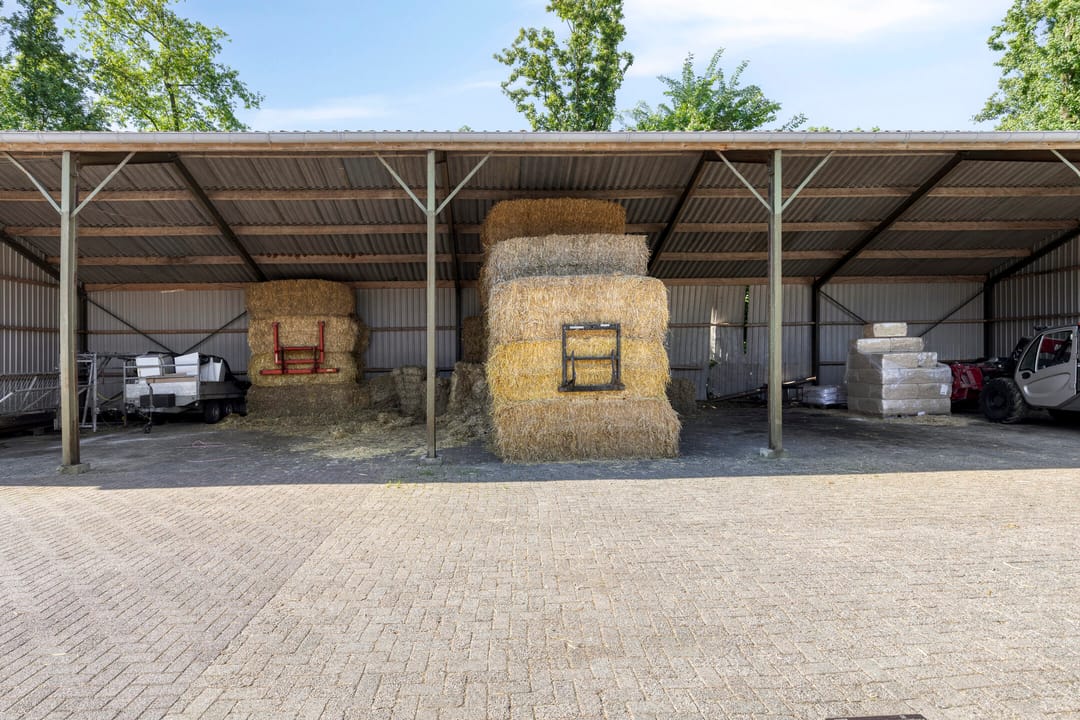 De kapschuur, met een oppervlakte van circa 200 m², is aan één zijde open en opgebouwd uit damwandprofielplaten met stalen spanten. De vloer is verhard met klinkers en aan de achterzijde is sprake van zichtbare schade. Ondanks dat is de kapschuur goed bruikbaar als opslagruimte voor machines, werktuigen en hooi/stro. De constructie is eenvoudig maar functioneel en sluit goed aan bij het agrarische karakter van het erf.