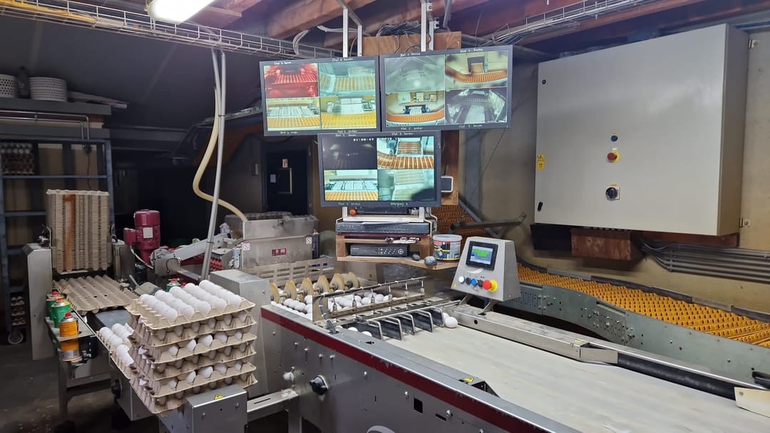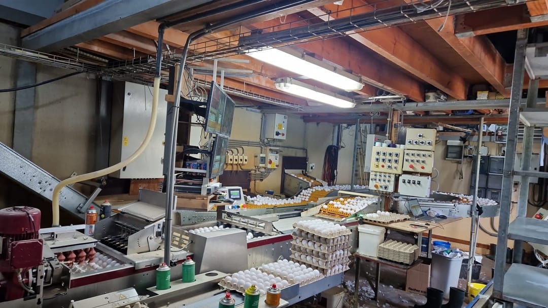 Toelichting: Aan de voorzijde van de stal bevindt zich een centrale gang welke de stallen met elkaar verbindt. In deze ruimte vindt tevens de eierverzameling plaats, welke via spijlenbanden naar de centrale eierinpakker vervoerd worden. De spijlenbanden worden camera-gestuurd. De voerlijnen van stal 1 t/m 4 zijn in 2013 vervangen. De inpakker is van het merk Prinzen (2023) met 5 standenlift in de grond. De inpaklijn is van 2023. In deze ruimte bevindt zich tevens een eierbewaarplaats. In totaal zijn er op de daken 2.487 zonnepanelen gelegen: