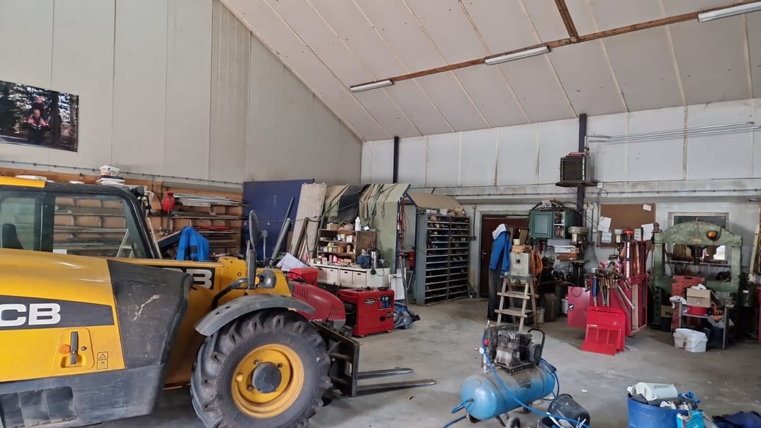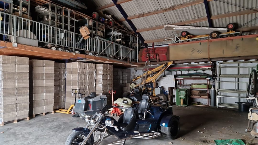 Toelichting: Ruim opgezette loods, toegankelijk via twee roldeuren. In gebruik als werkplaats en machineberging.