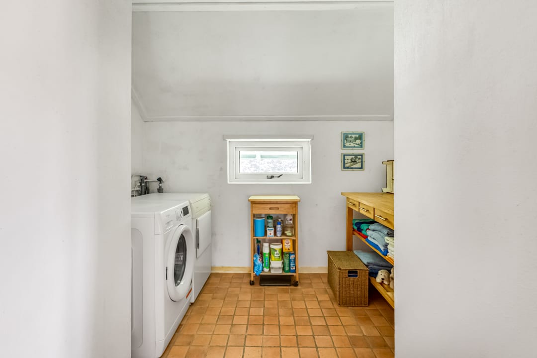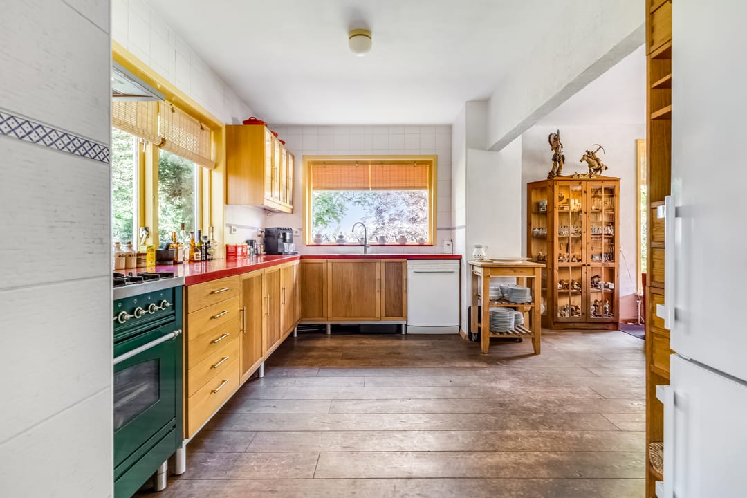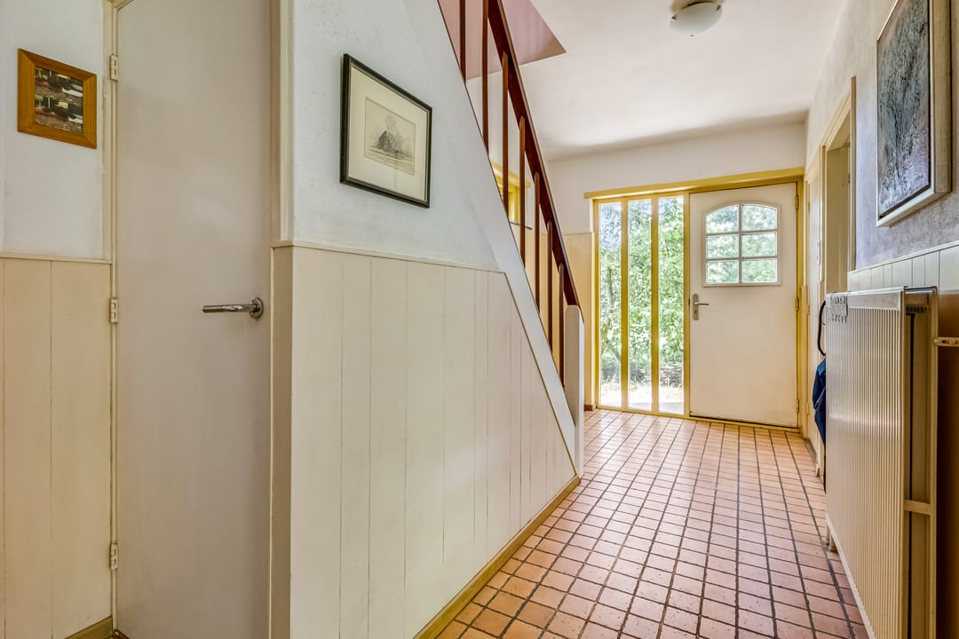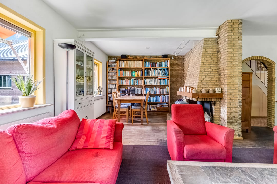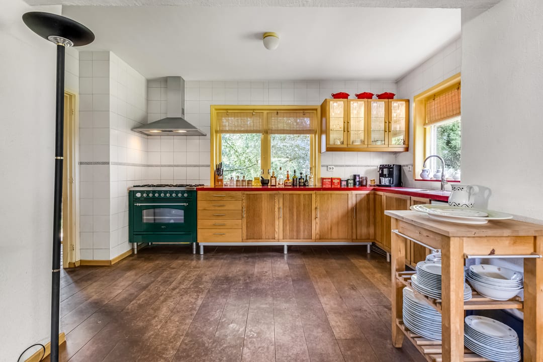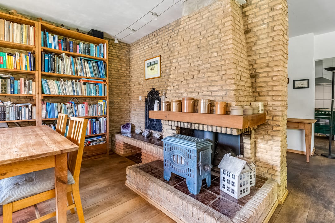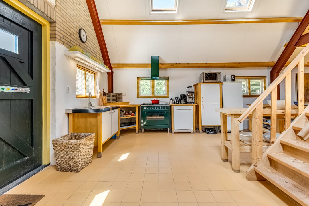 Bij binnenkomst via de hoofdentree komt u in de ruime hal met trapopgang. Deze hal geeft toegang tot de verschillende vertrekken op de begane grond, waaronder het toilet met fonteintje en een praktische trapkast voor extra opbergruimte. De open keuken en aangrenzende woonkamer zijn gesitueerd aan de voorzijde van de woning. Het L-vormige keukenblok is voorzien van vaste keukenapparatuur, waaronder een Boretti gasfornuis met oven. Zowel in de keuken als in de L-vormige woonkamer wordt de grond gesierd met een donkere, eikenhouten parketvloer. Een houtkachel zorgt voor een gezellige sfeer en prettige warmte.