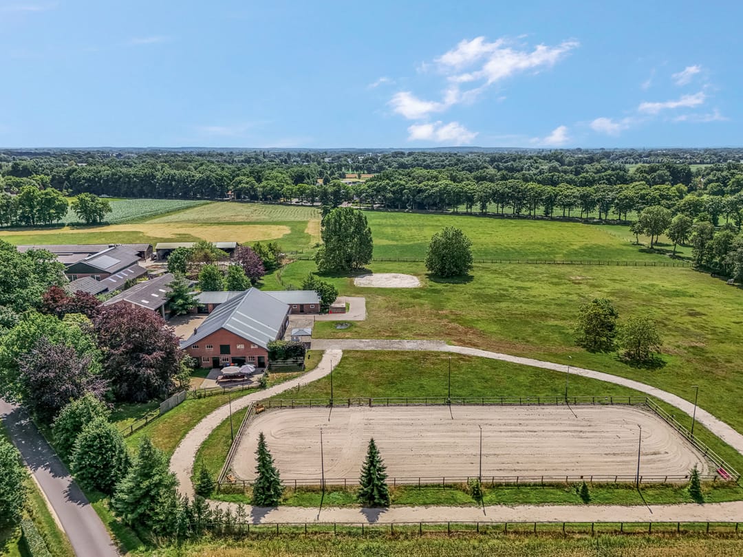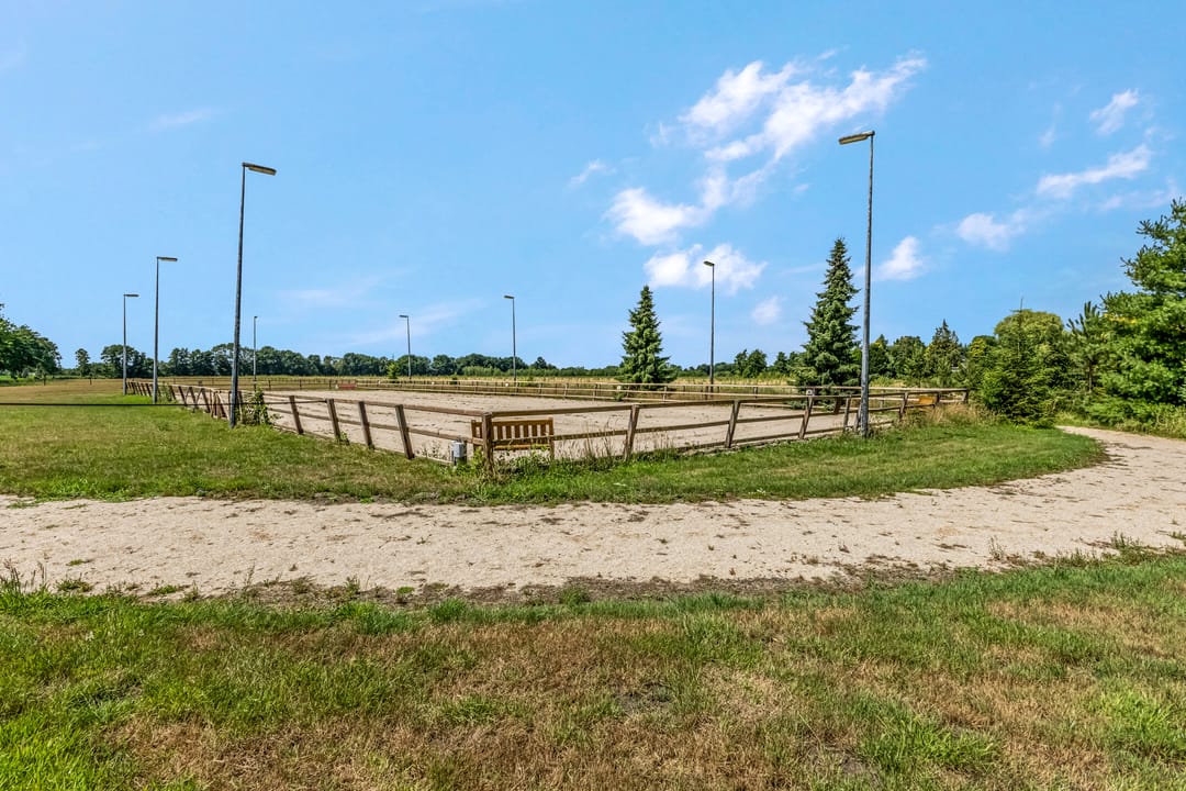 Buitenrijbaan, er is een grote buitenrijbaan (afmeting 20 m x 60 m) met acht lantaarnpalen, een sproeiautomaat en natuurzand. Volledig gedraineerd.
