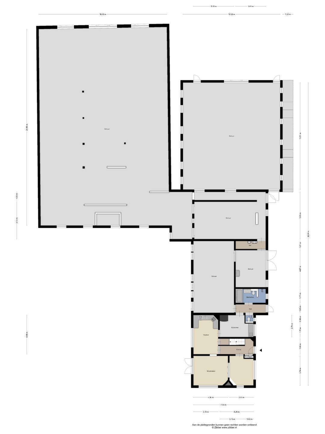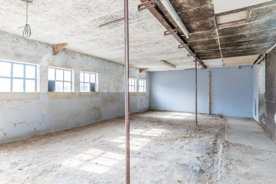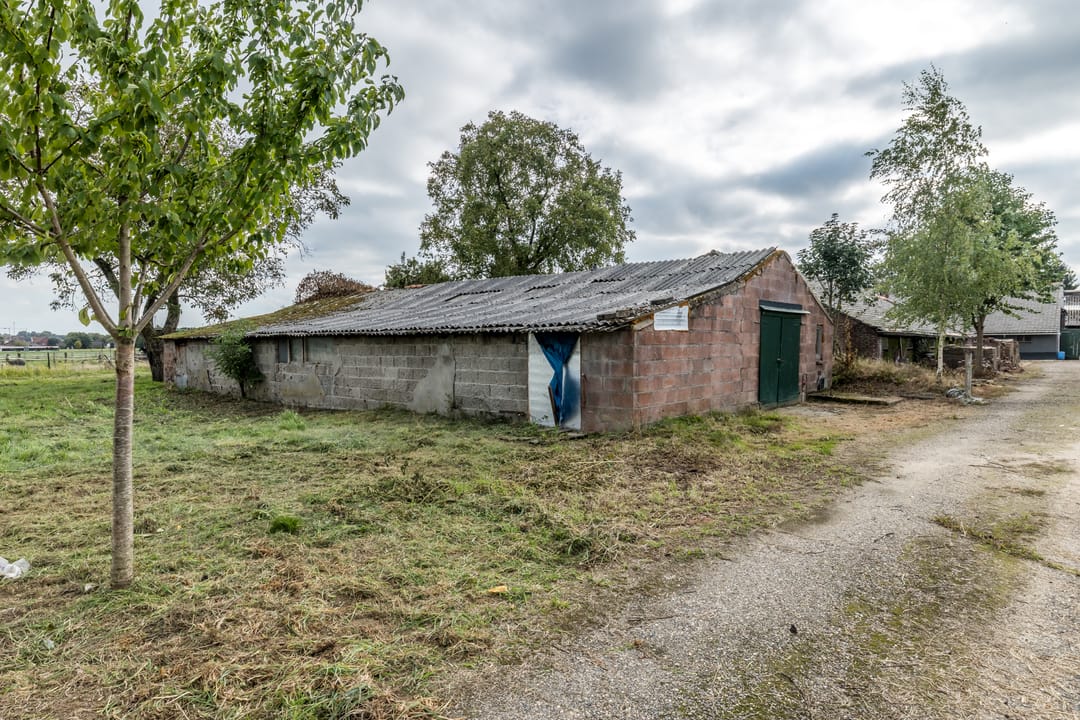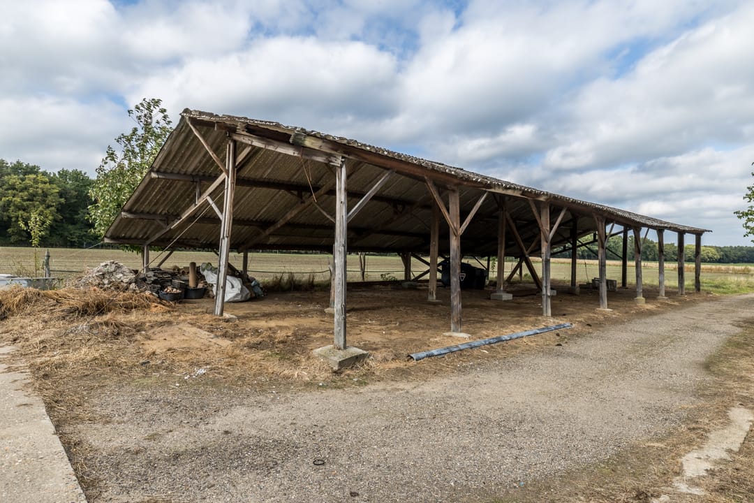 Opgebouwd uit gemetselde muren, houten draagconstructie en voorzien van asbesthoudende golfplaten.