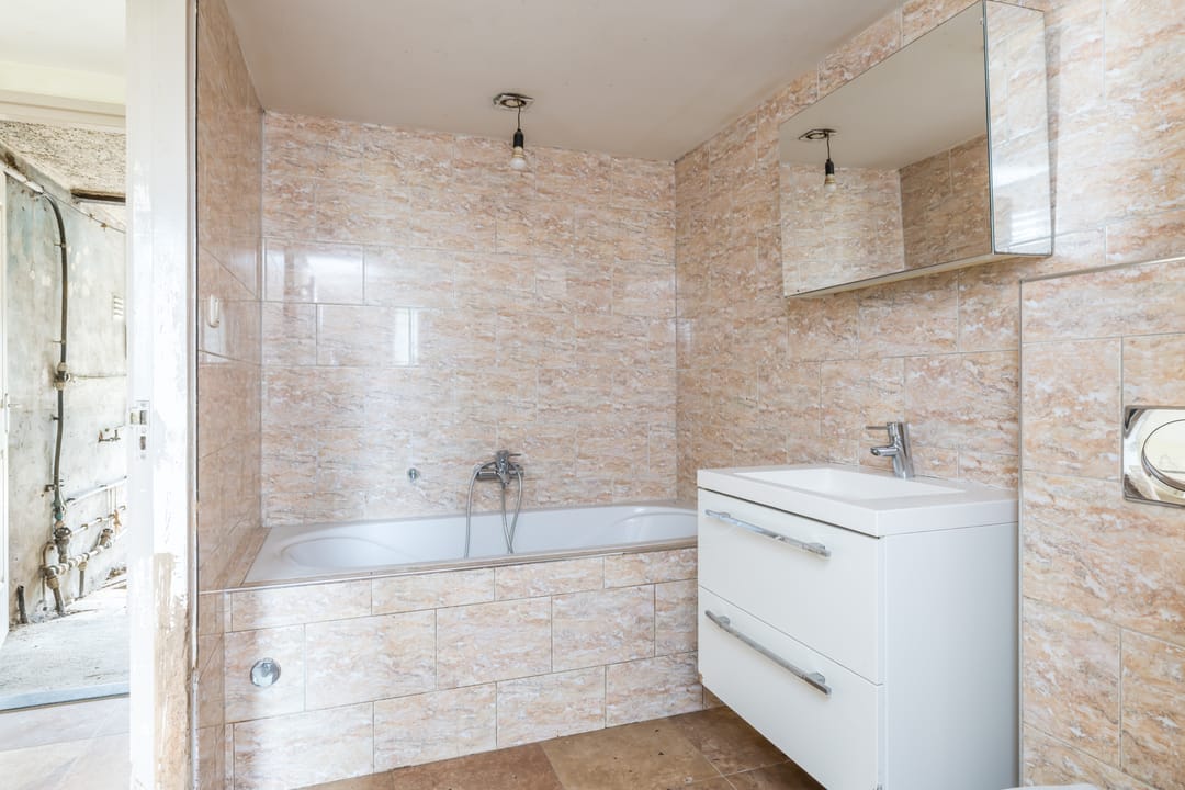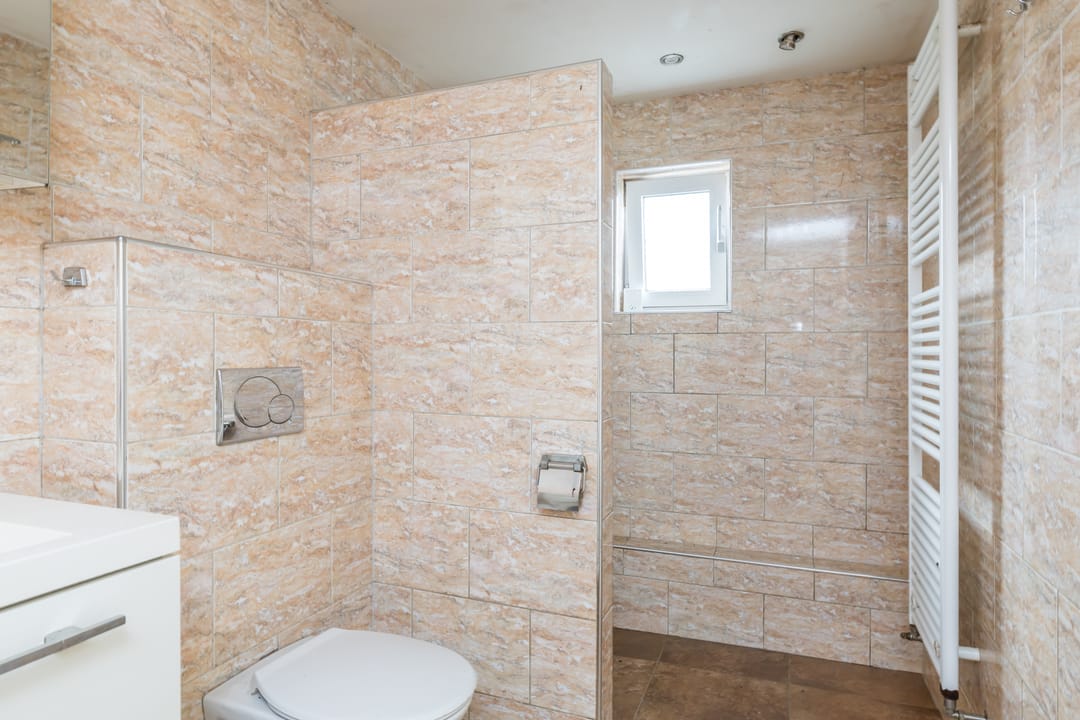 Vanuit de bijkeuken is een halletje bereikbaar dat toegang biedt tot de toiletruimte, de badkamer, de inpandige stallen en de tuin. De badkamer is volledig betegeld en uitgerust met een ligbad, inloopdouche, wastafel en toilet. De separate toiletruimte beschikt over een toilet en een fonteintje.