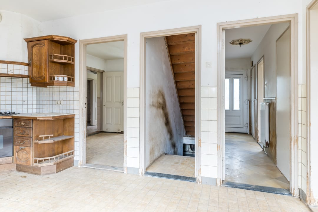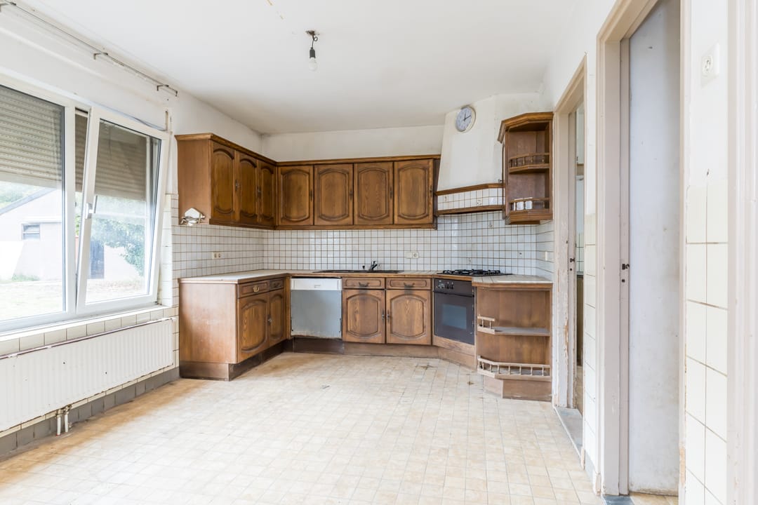 De ruime keuken beschikt over deels betegelde en deels gestucte wanden, een gestuct plafond en een tegelvloer. De aanwezige inbouwkeuken heeft een gedateerd karakter en is aan vervanging toe. Vanuit de keuken is er toegang tot zowel de bijkeuken als de provisiekelder. De bijkeuken is eveneens afgewerkt met deels betegelde en deels gestucte wanden, een gestuct plafond en een tegelvloer. Hier bevinden zich bovendien de aansluitingen voor de wasapparatuur.