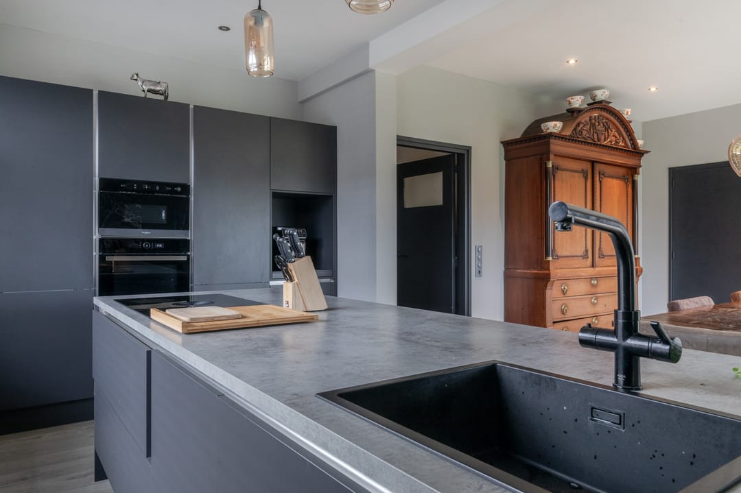 De woonkeuken is uitgerust met vloerverwarming en diverse inbouwapparatuur, waaronder een oven en magnetron. Het keukeneiland is voorzien van een gootsteen, een Bora inductiekookplaat met geïntegreerde afzuiging en een kraan met cookerfunctie.