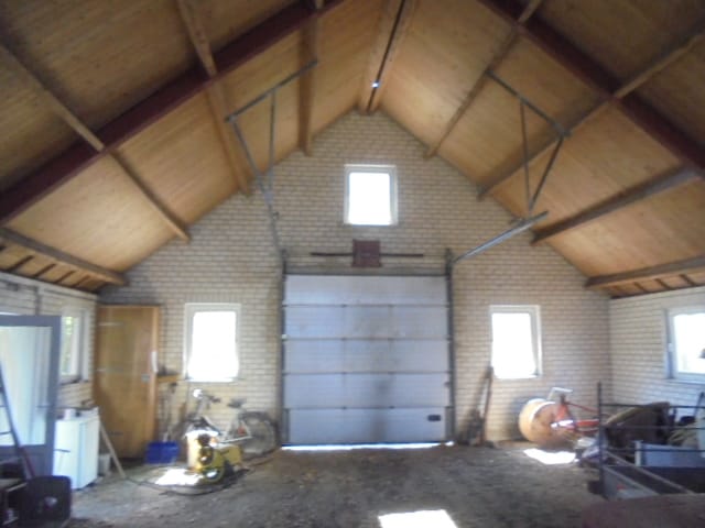 De schuur is voorzien van gas, water en elektra 3x25 Amp en een meterkast met o.a. krachtstroom en 2 aardlekschakelaars. En verder voorzien van een sectionale roldeur en loopdeur en voorzien van kunststof draaikiepramen met dubbel glas.